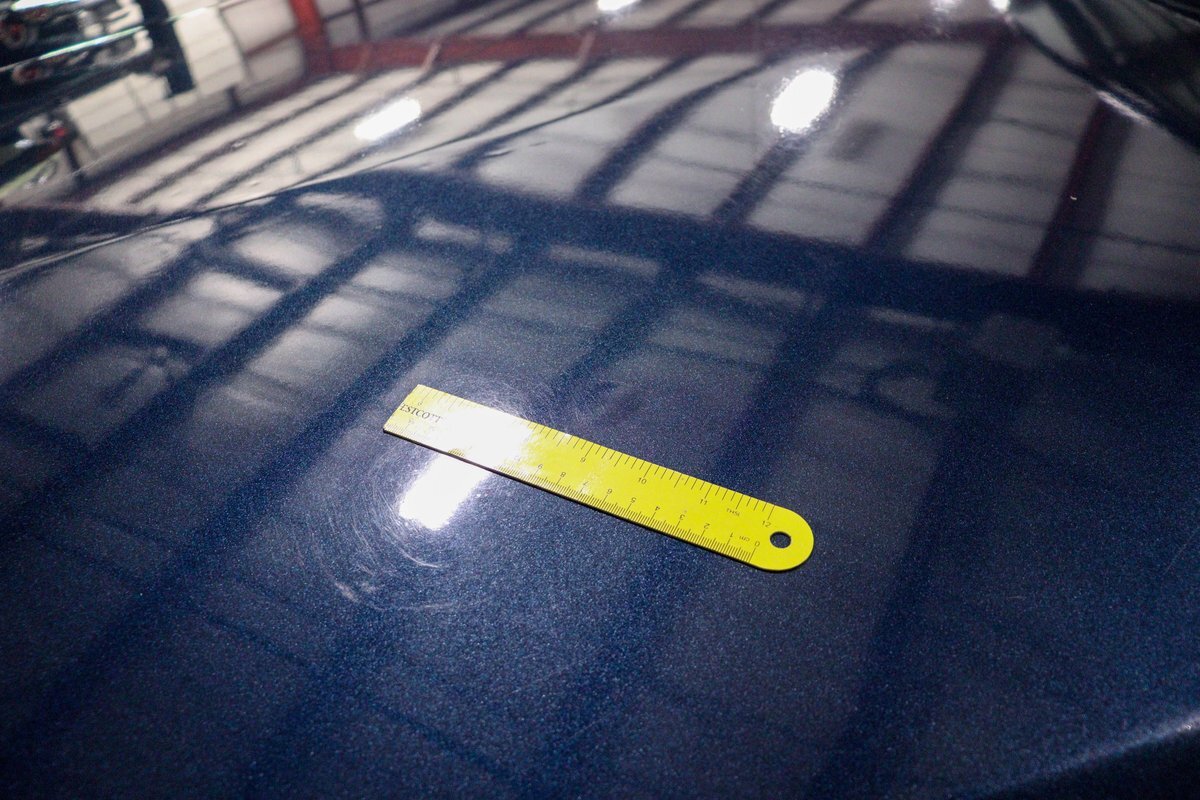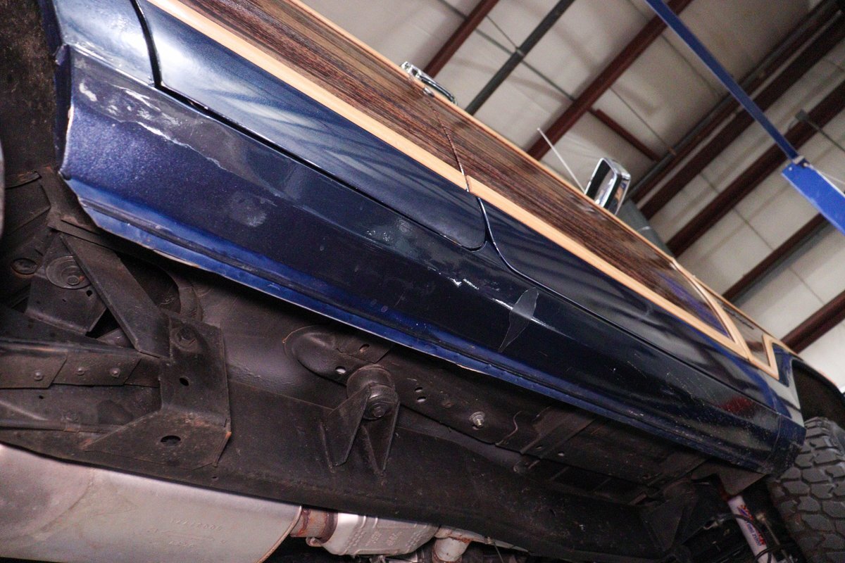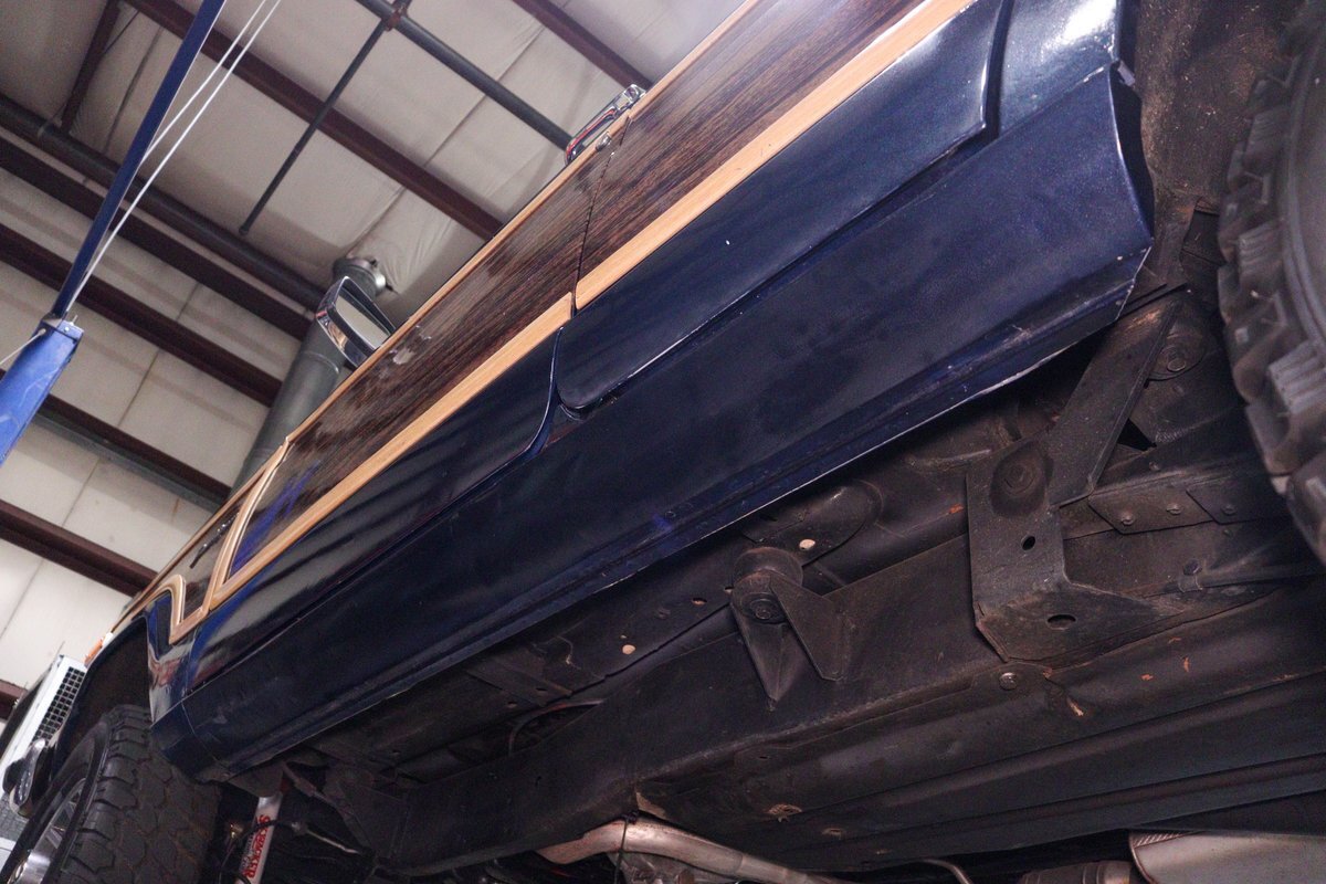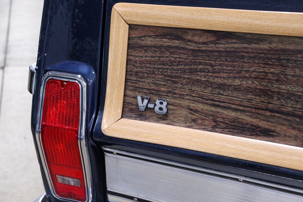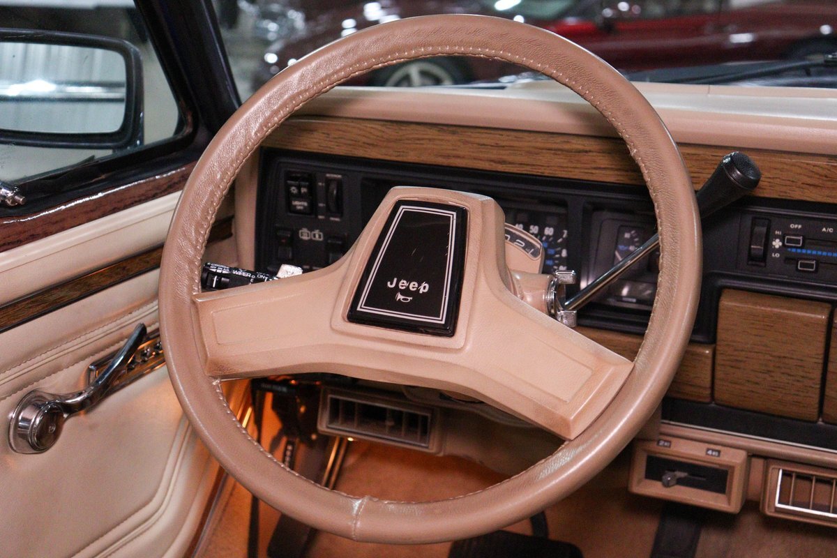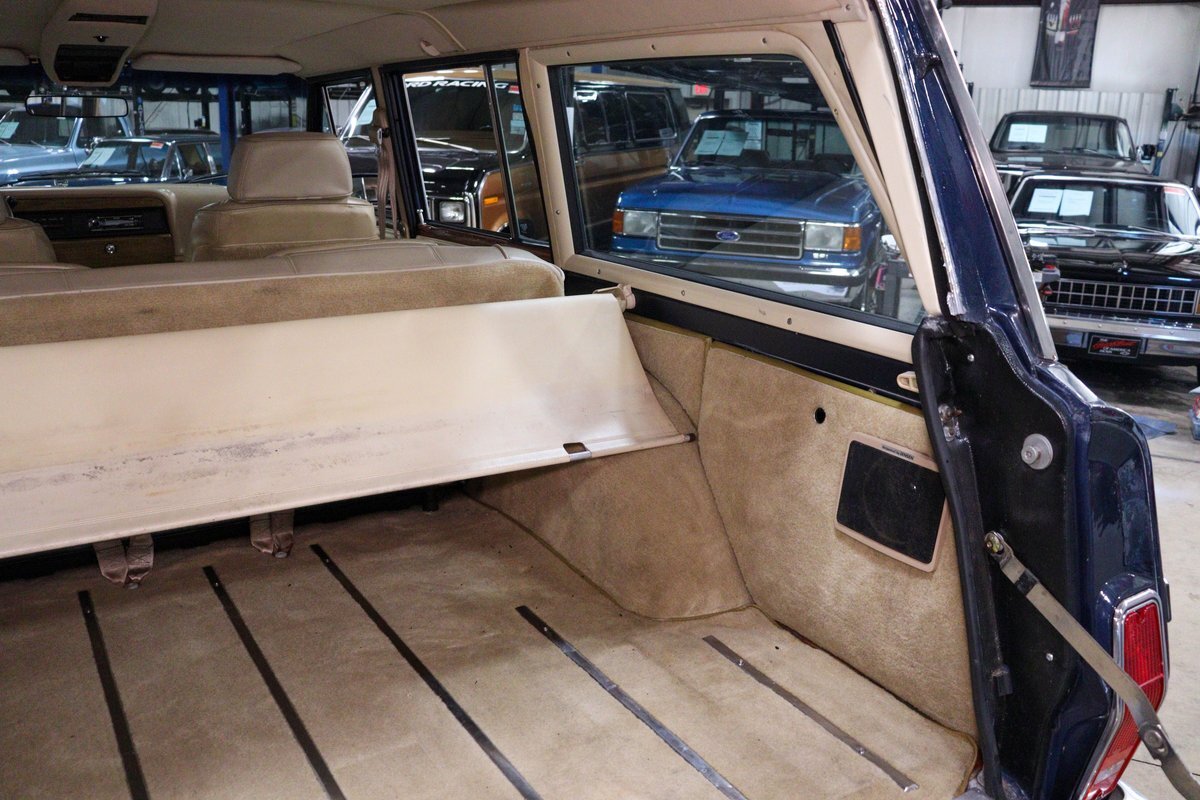 The exterior of this Grand Wagoneer gleams in a fresh Baltic Blue Metallic paint job, beautifully accented by new wood grain sides. During the restoration, any signs of oxidation were meticulously cut out and replaced with solid sheet metal, ensuring a solid body. The polished metal trims have been buffed to shine, and new weather stripping has been installed throughout. This Jeep also features a rear power window and a rear storage cover for added convenience.