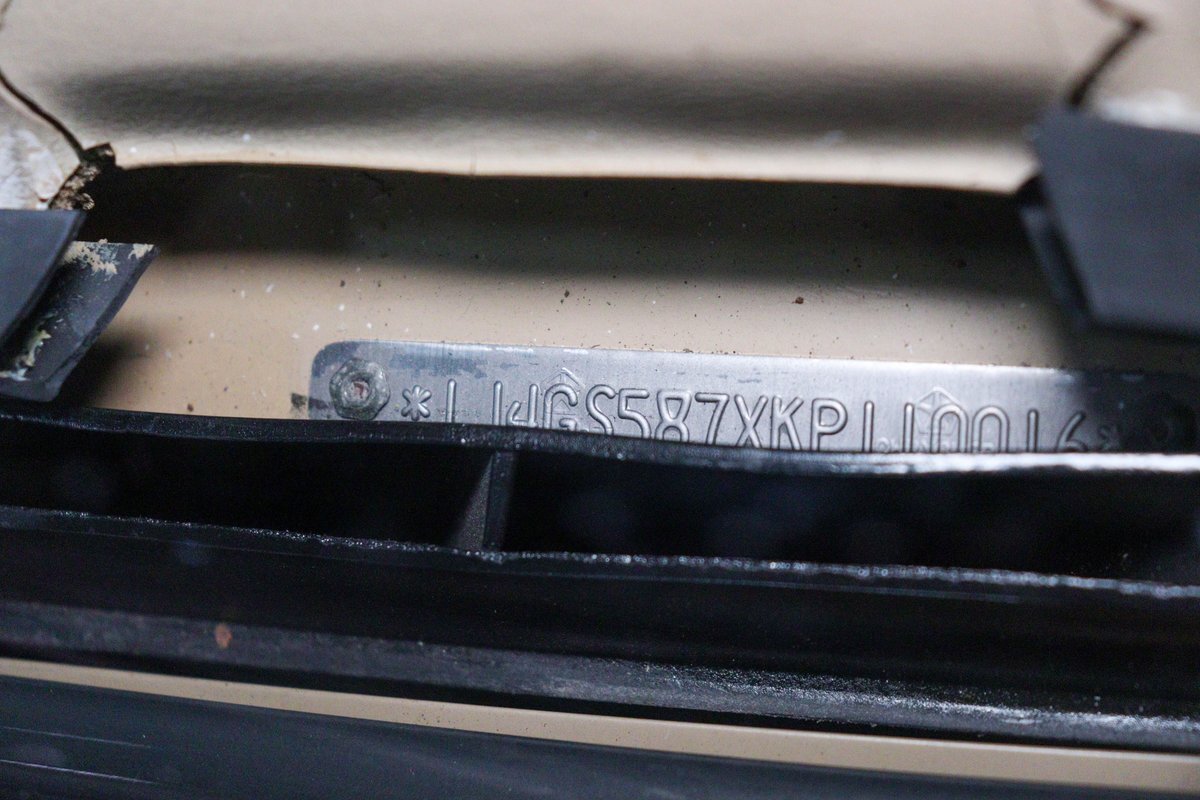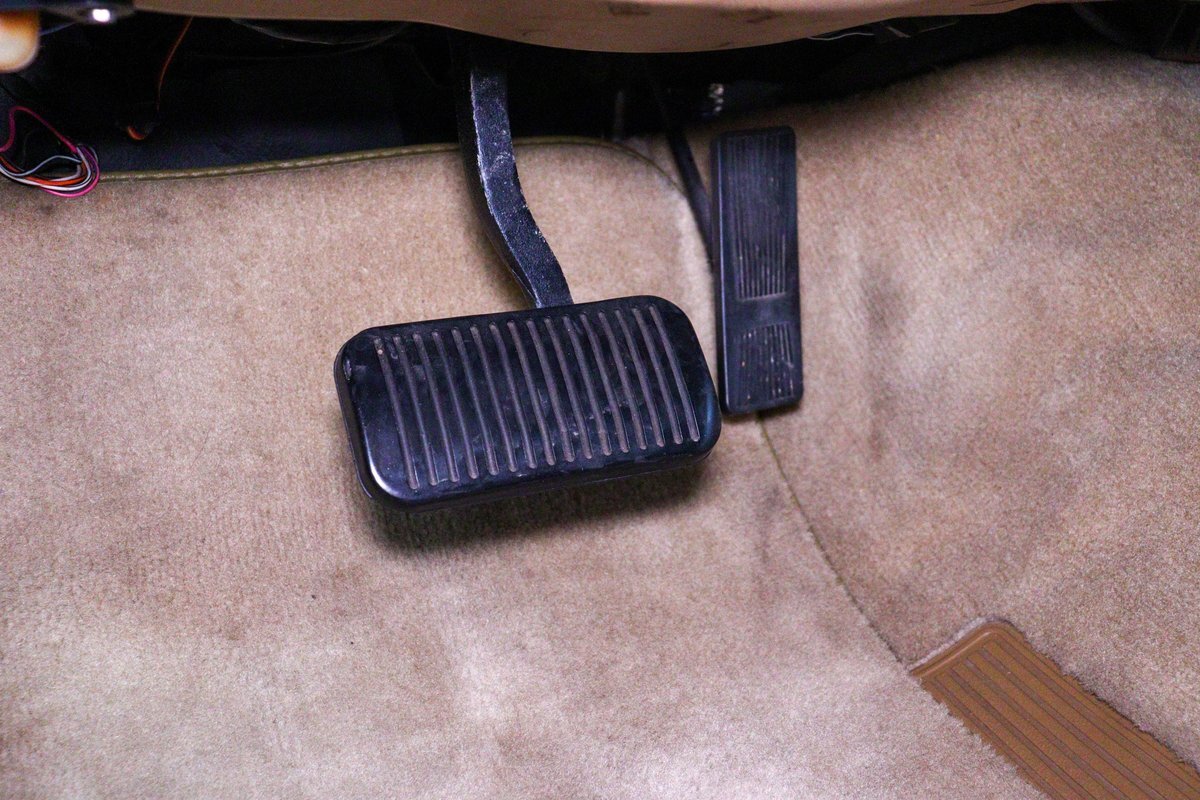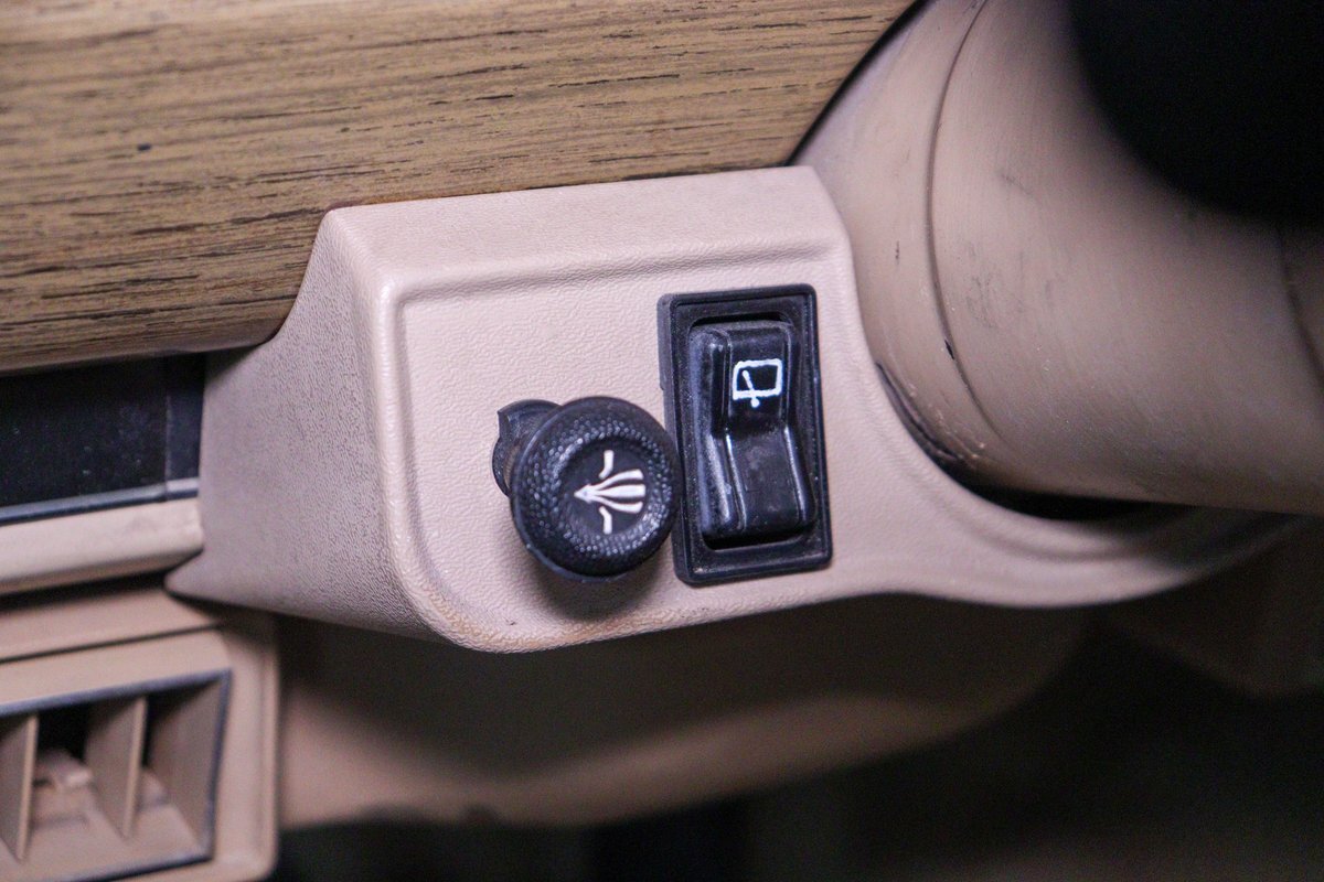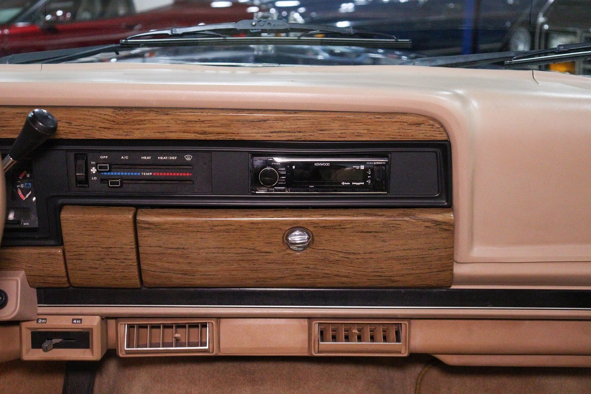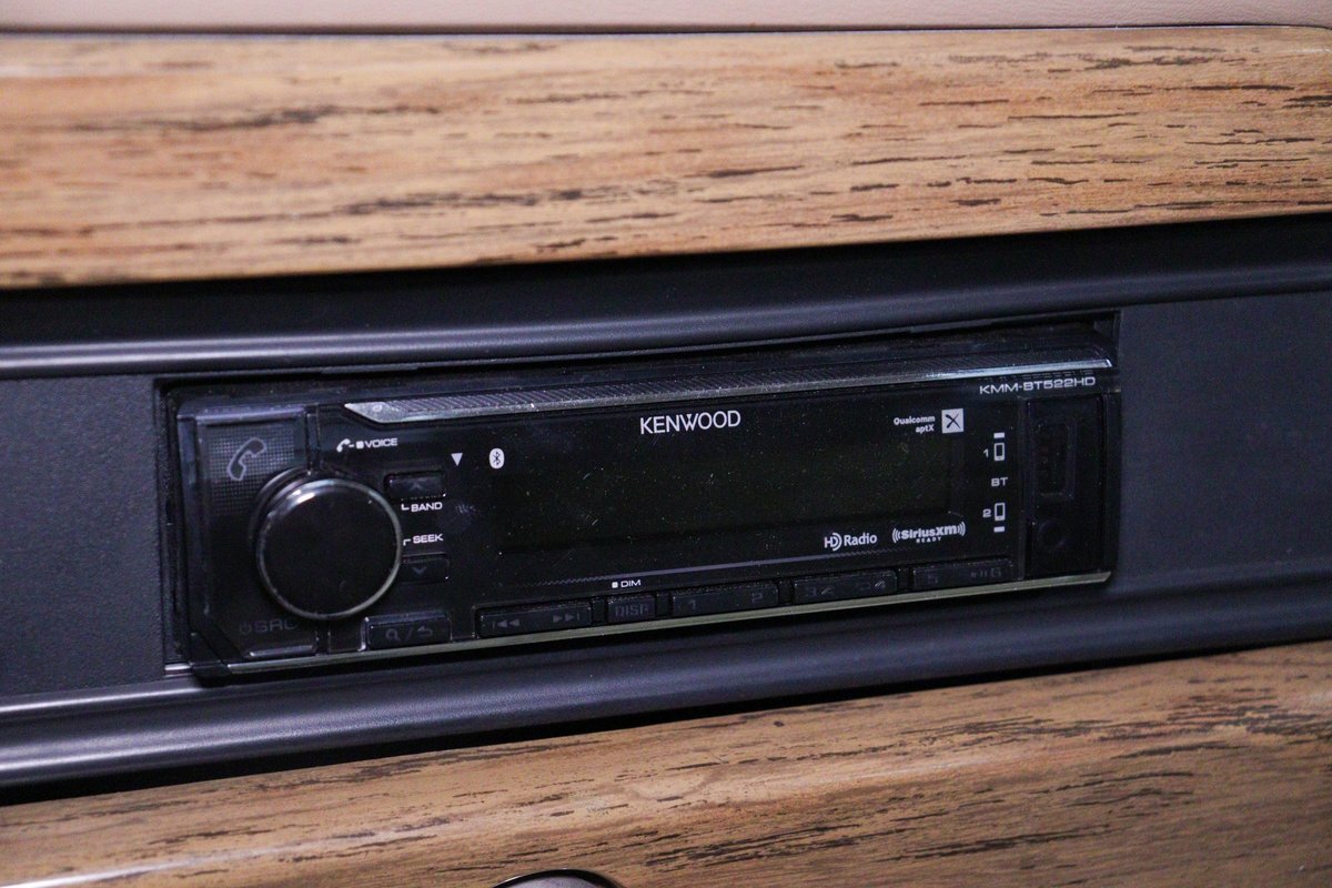 The interior maintains its classic charm with tan leather seats, carpets, and floor mats all in great condition. Modern amenities include a Kenwood single DIN aftermarket head unit with Bluetooth, USB, Pandora, and AM/FM radio capabilities, complemented by Infinity speakers and a hidden subwoofer in the cargo area for premium sound quality. The door locks now feature modern relays with a keyless remote that also triggers the parking lights. A rebuilt motherboard in the compass/thermometer in the overhead console ensures all the original features are functional.
