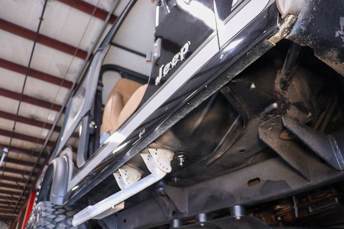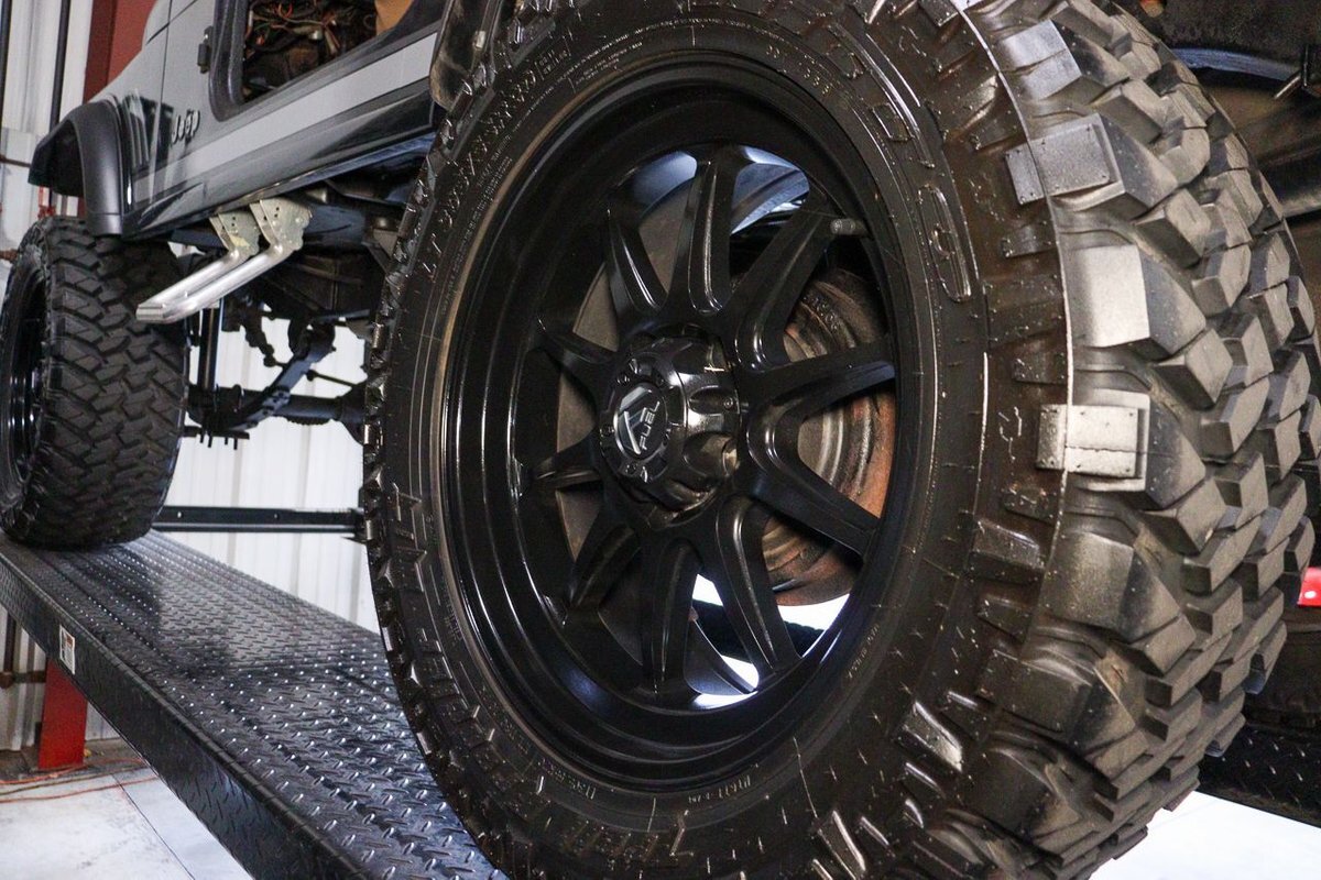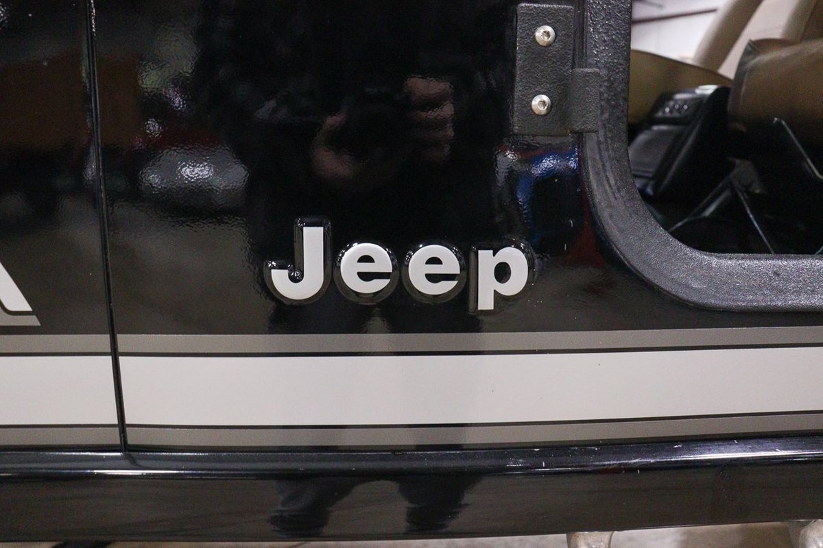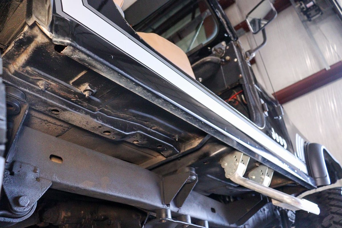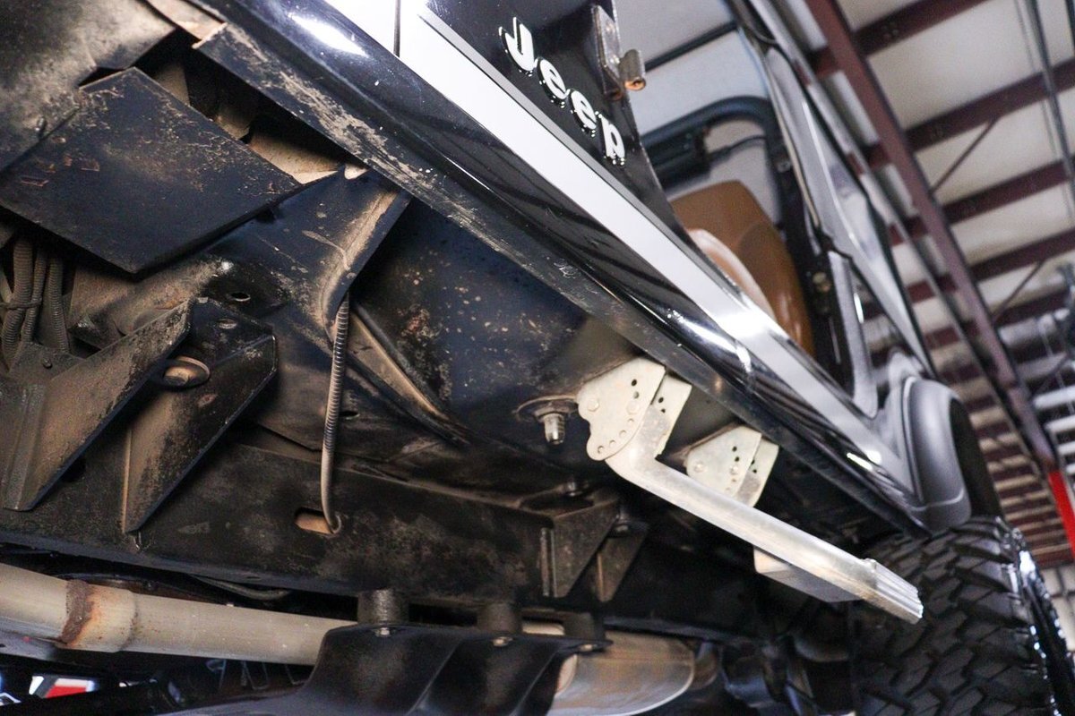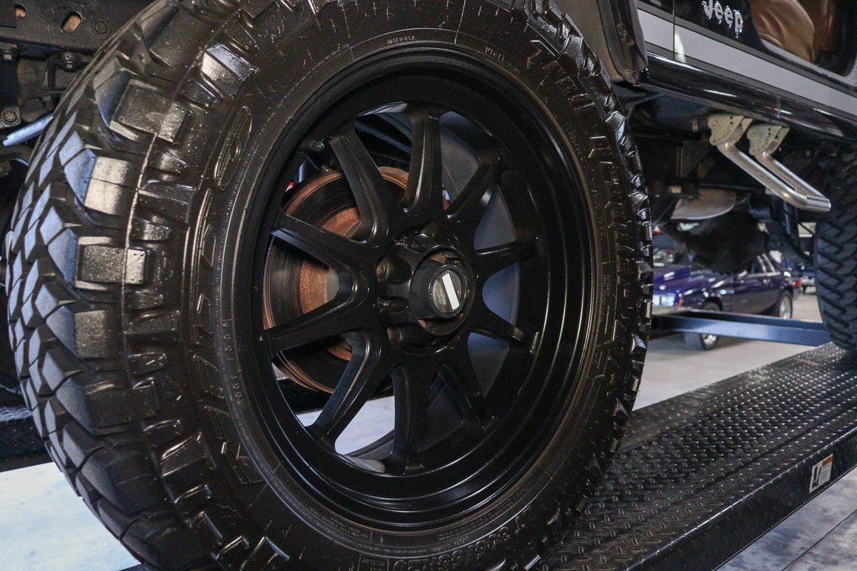 Externally this Jeep is very clean with its black paint that sports accenting silver striping throughout the front of the vehicle. It rides on 20-inch Fuel Off-Road wheels wrapped in Nitto Trail Grappler tires. Inside the vehicle are tan bucket seats in the front and a bench seat in the rear. The floors have been professionally sprayed with bed liner and a Pioneer radio has been installed.