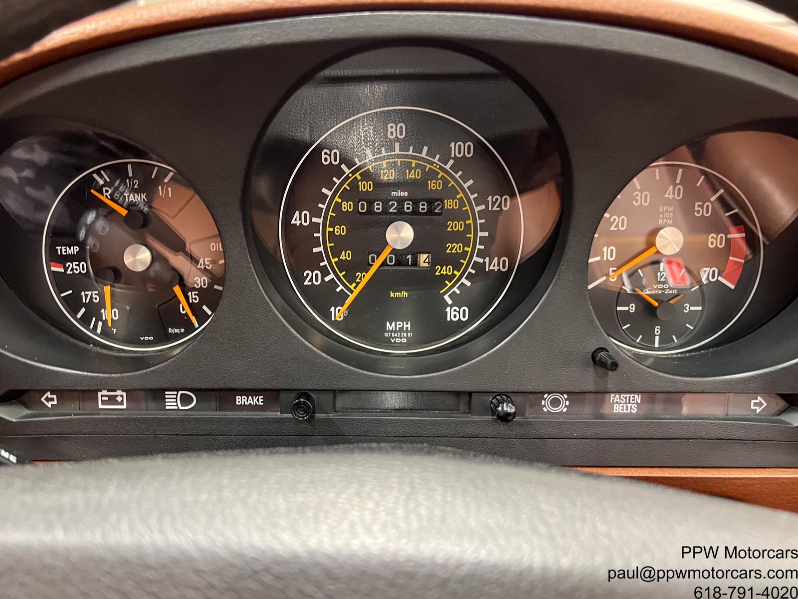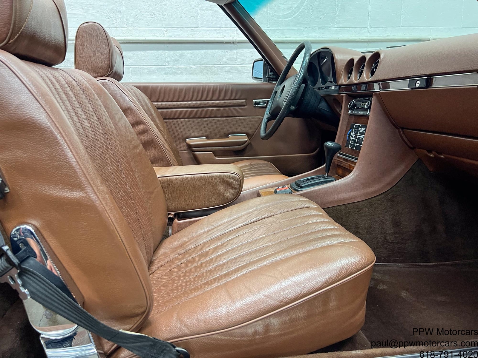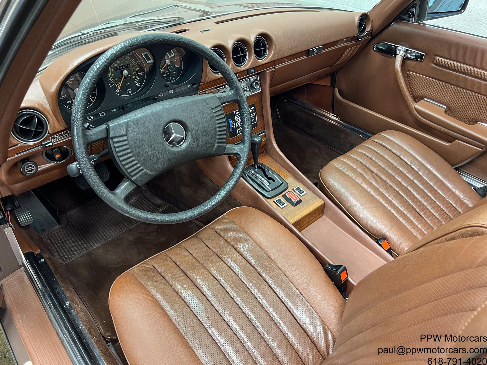 Setting this vehicle apart from all others, aside from mileage is the wonderful. Having been lovingly cared for by just two owners from new this example has been meticulously cared for with an ‘open checkbook philosophy’. Further, this magnificent motorcar is incredibly original. The interior is as it came from the factory and everything is functioning. The interior is a time capsule and a testament to how it was kept. Further, throughout the car all of the details are present and in magnificent condition, such as the cadmium coating on engine parts (the gold colored coating on things like the power steering cap, A/C Lines, and other metal components), foam bumpers on the inside of the clam shell cover, stickers throughout, all vin plates, crisp lettering on buttons/switches, and more! All of these are incredibly unusual appointments and are missing on 99% of cars out there and having all of these things is a testament to how well cared for this car was. When our mechanic put it on the lift he said it looked it had never seen a drop of water in its life and was the nicest undercarriage he had seen in his 40 years of working on these cars. To properly honor this car as it deserves, we preventively replaced all the common complex service items such as timing chain, sub frame mounts, engine mounts, and also serviced the car thoroughly so that the next owner starts with a fresh, worry free car. This service would cost around $10,000 at a shop. Look carefully at the photos. All of the details from the aluminum trim, to the gorgeous original dash, to how the center console/glove box/dash all fit perfectly, to the uniform texture and color of the interior throughout. We are proud to offer what we believe to be one of, if not the best example of the coveted 450SL Mercedes on the market, at any price. Offered to the collector, enthusiast, or investor who appreciates the magnificent investment potential of this magnificent motorcar! Bid with confidence-you will not be disappointed in this truly amazing motorcar!