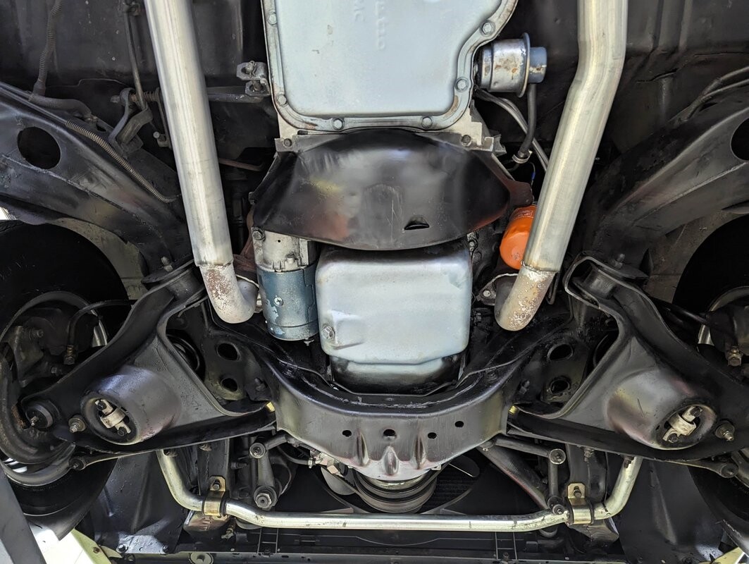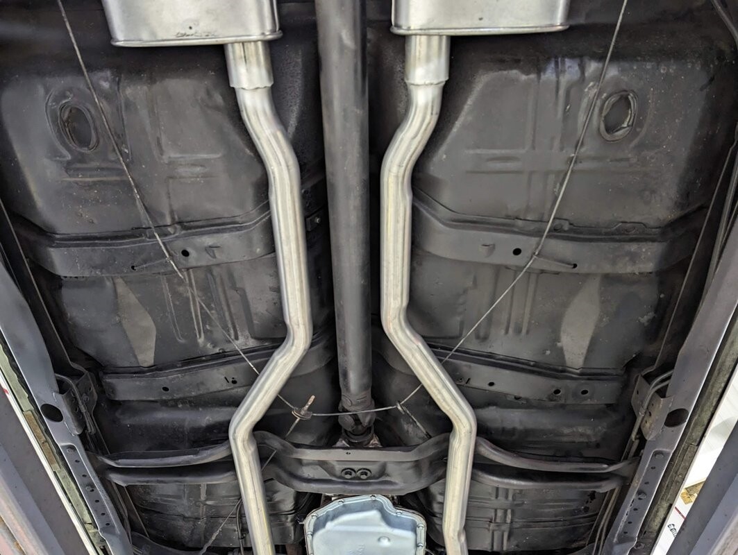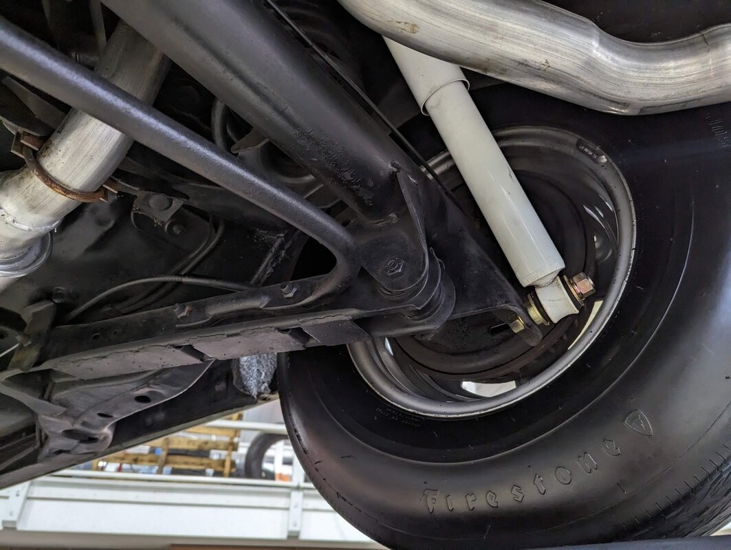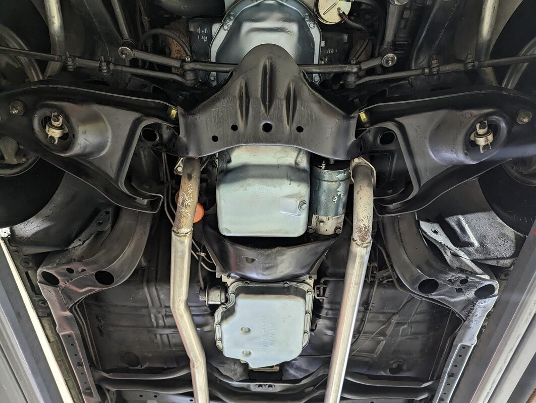 UNDERSIDE: It looks like all the steering and suspension components were apart and rebuilt. It has the F-41 which means front and rear sway bars and boxed rear control arms. It's also upgraded with KYB gas shocks. Correct dual exhaust system including the chrome quad tips. It has disc in front, drum in back. E-brake cables are hooked up. Looking up at the motor it's very clean. Original Turbo 400 automatic is clean, it still has the 1970 tag riveted to it. Original rear end with 3.23 gears. The metal under this car is very impressive, all original and dry floors, rockers, and braces. It was cleaned and painted black.