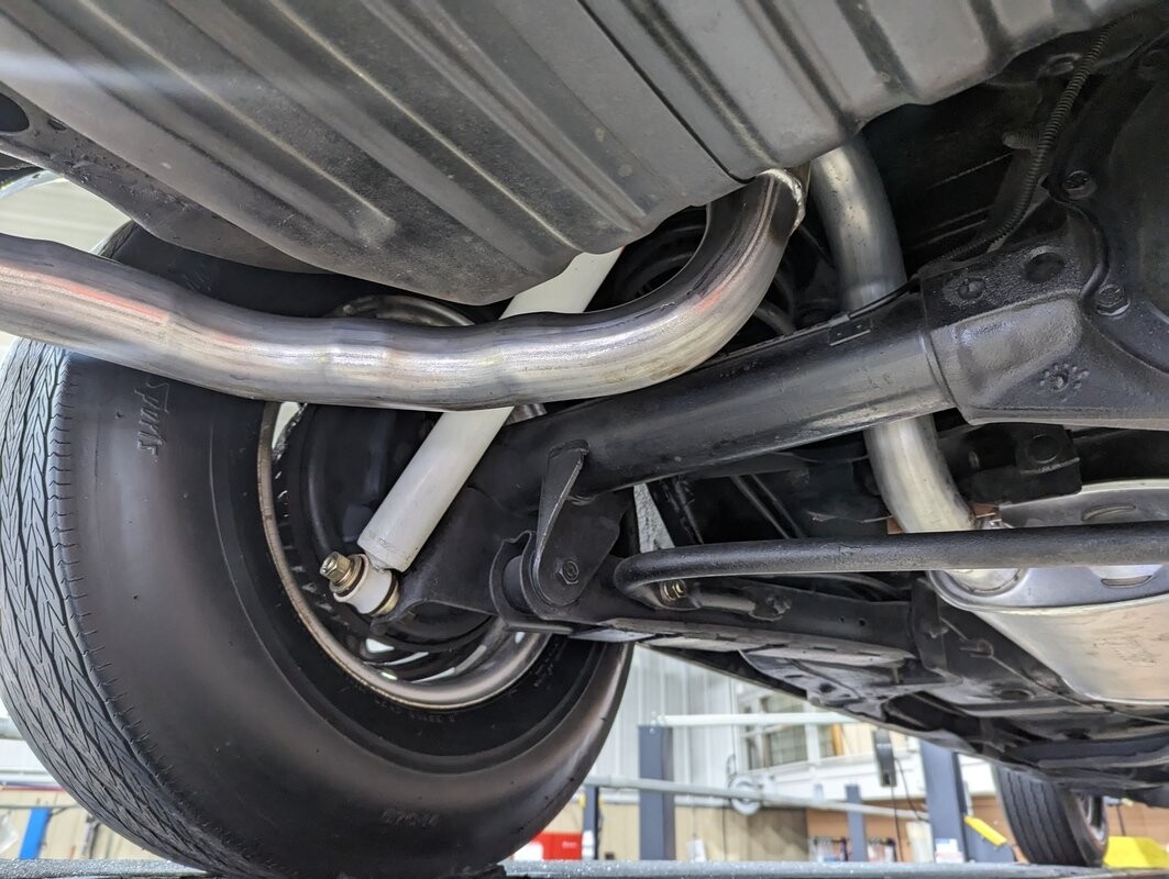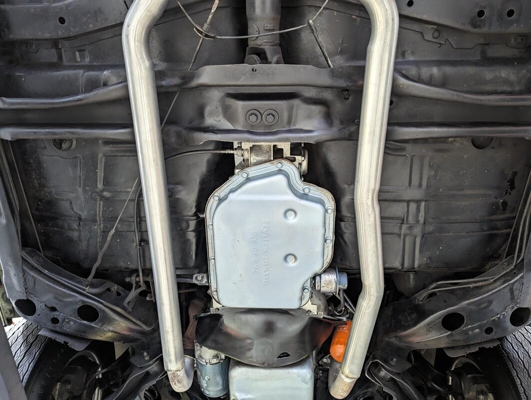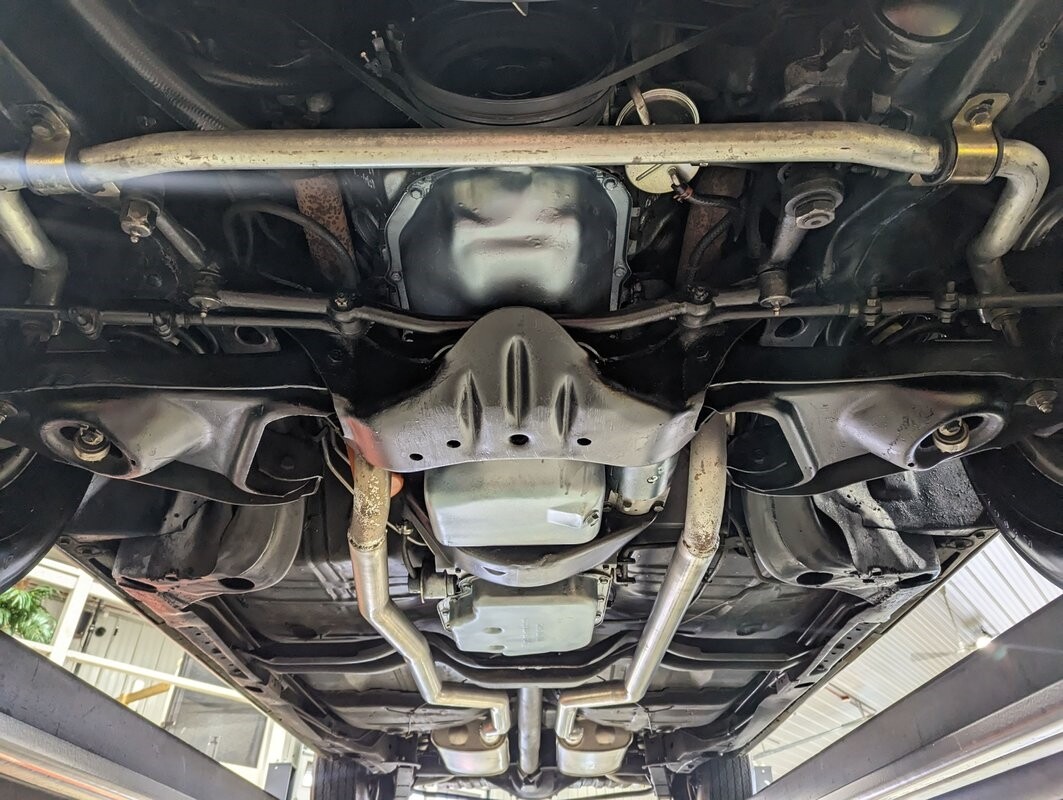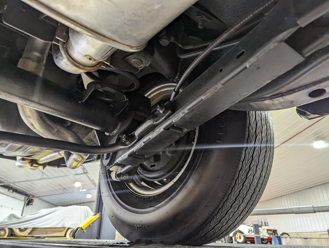 UNDERSIDE: It looks like all the steering and suspension components were apart and rebuilt. It has the F-41 which means front and rear sway bars and boxed rear control arms. It's also upgraded with KYB gas shocks. Correct dual exhaust system including the chrome quad tips. It has disc in front, drum in back. E-brake cables are hooked up. Looking up at the motor it's very clean. Original Turbo 400 automatic is clean, it still has the 1970 tag riveted to it. Original rear end with 3.23 gears. The metal under this car is very impressive, all original and dry floors, rockers, and braces. It was cleaned and painted black.