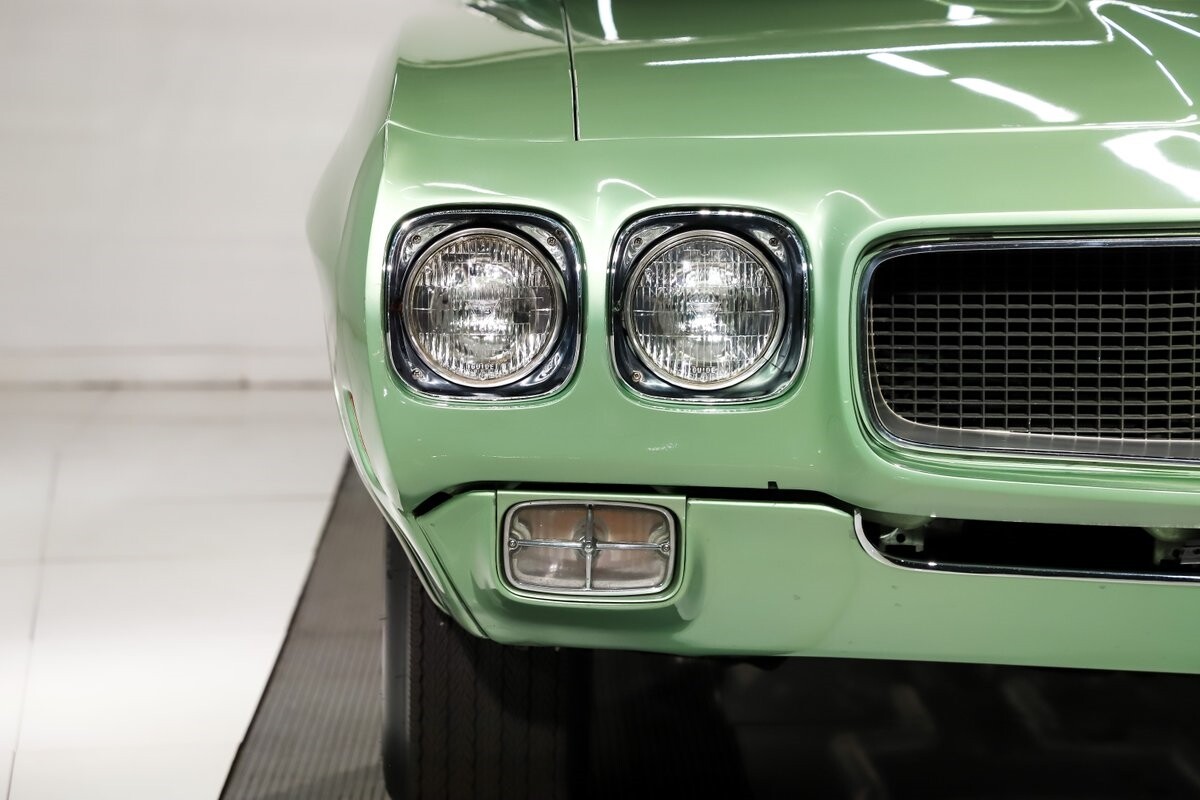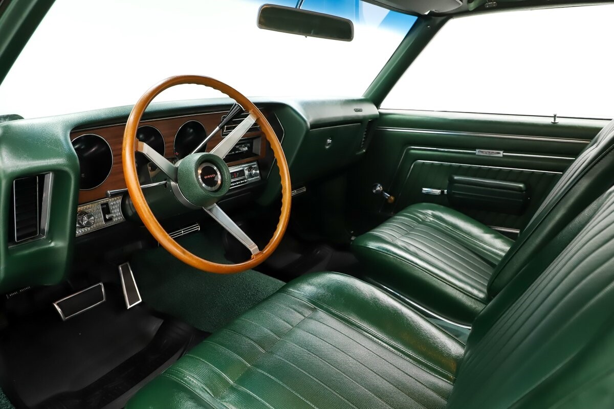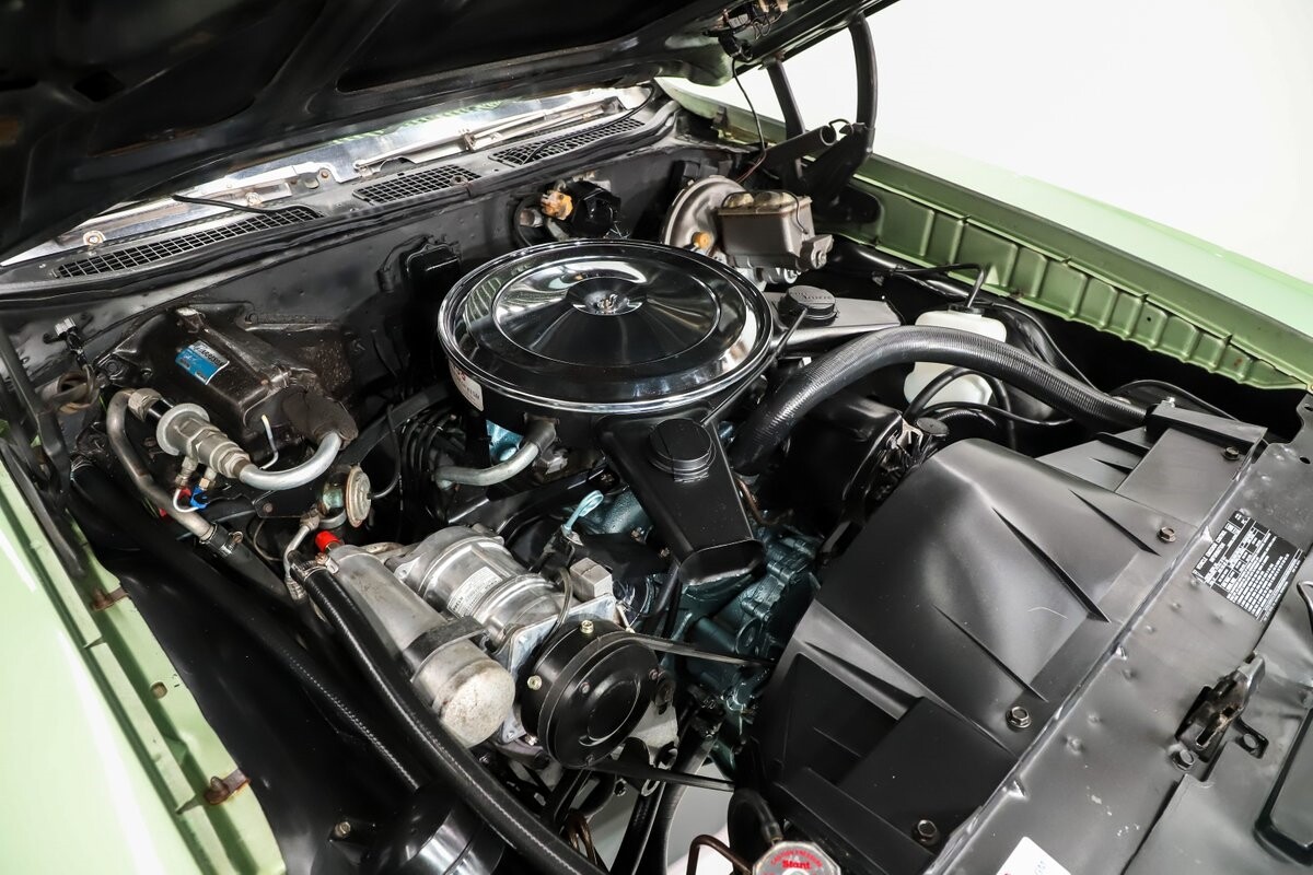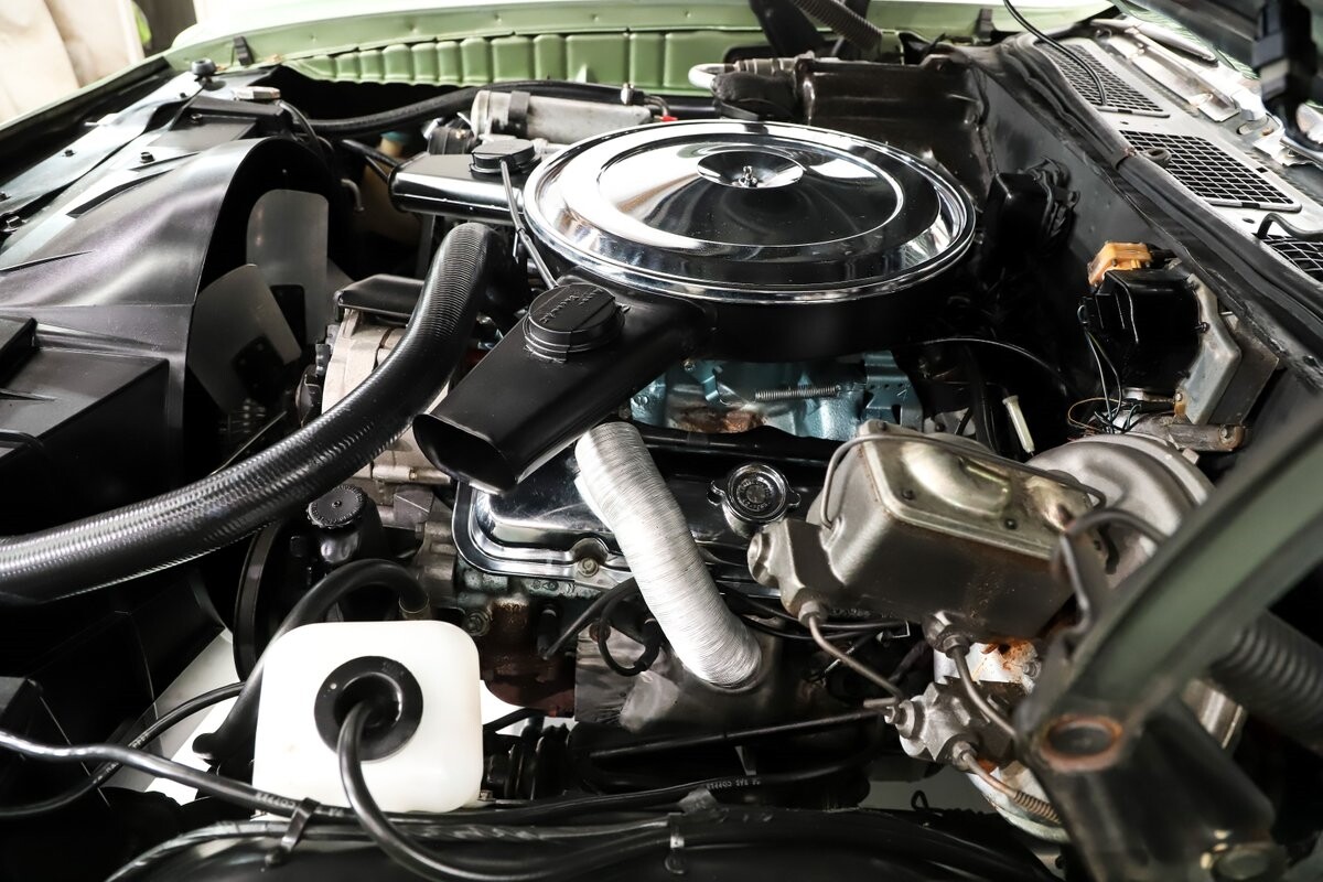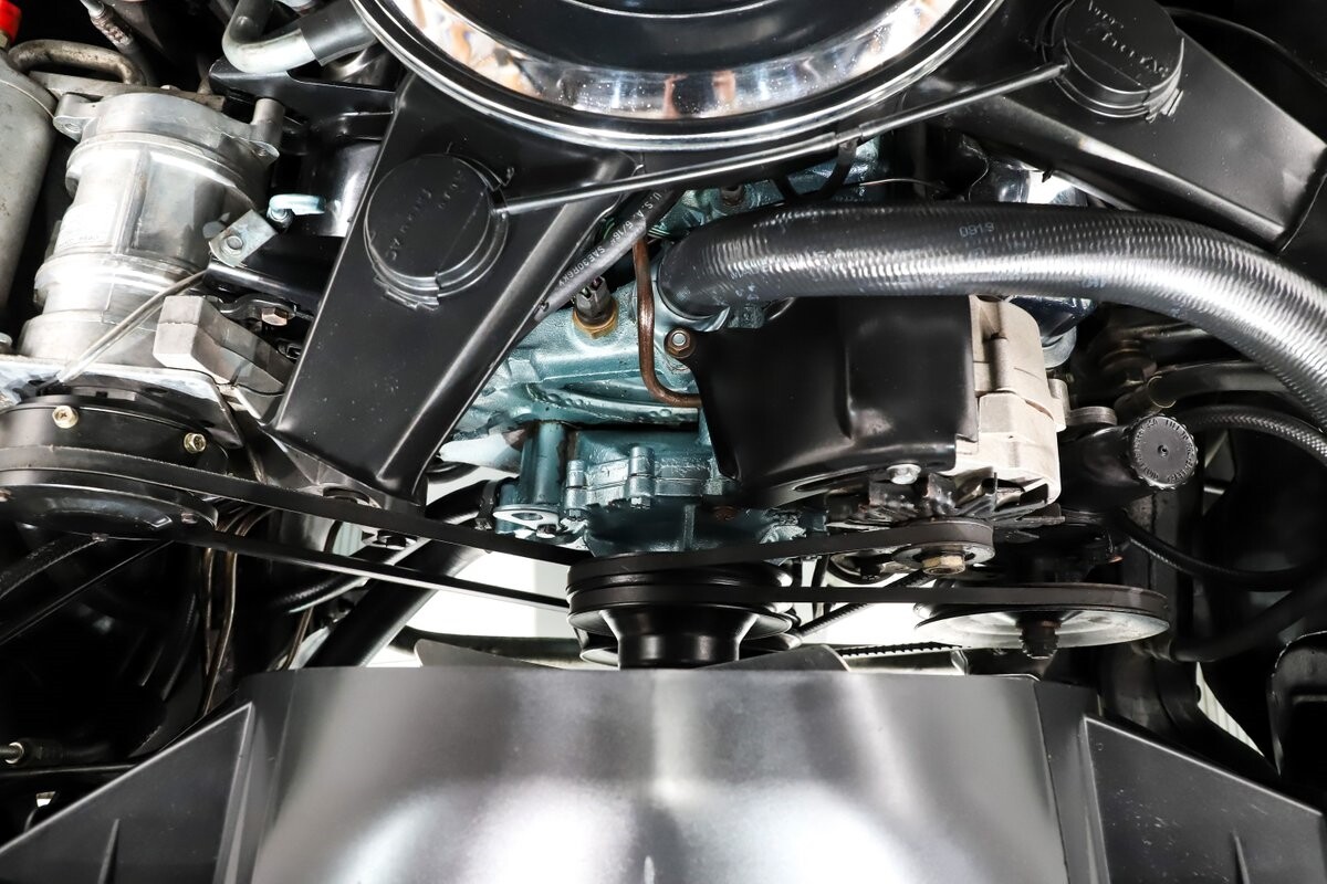 ENGINE COMPARTMENT: Numbers matching 400-350 hp engine with all the correct components: manifolds, valve covers, complete air cleaner system with the heat riser too. Everything looks tidy and proper. Correct hose clamps, spring clamp battery cables, the squirters are hooked up. It features factory air conditioning updated a newer compressor and R134 freon. It also has power steering and brakes.