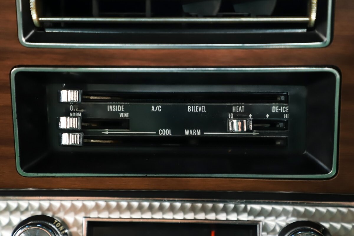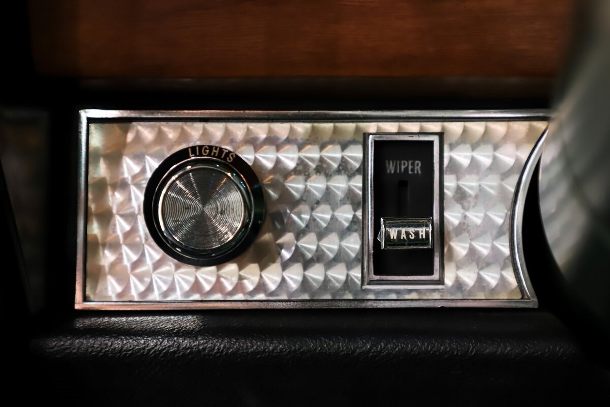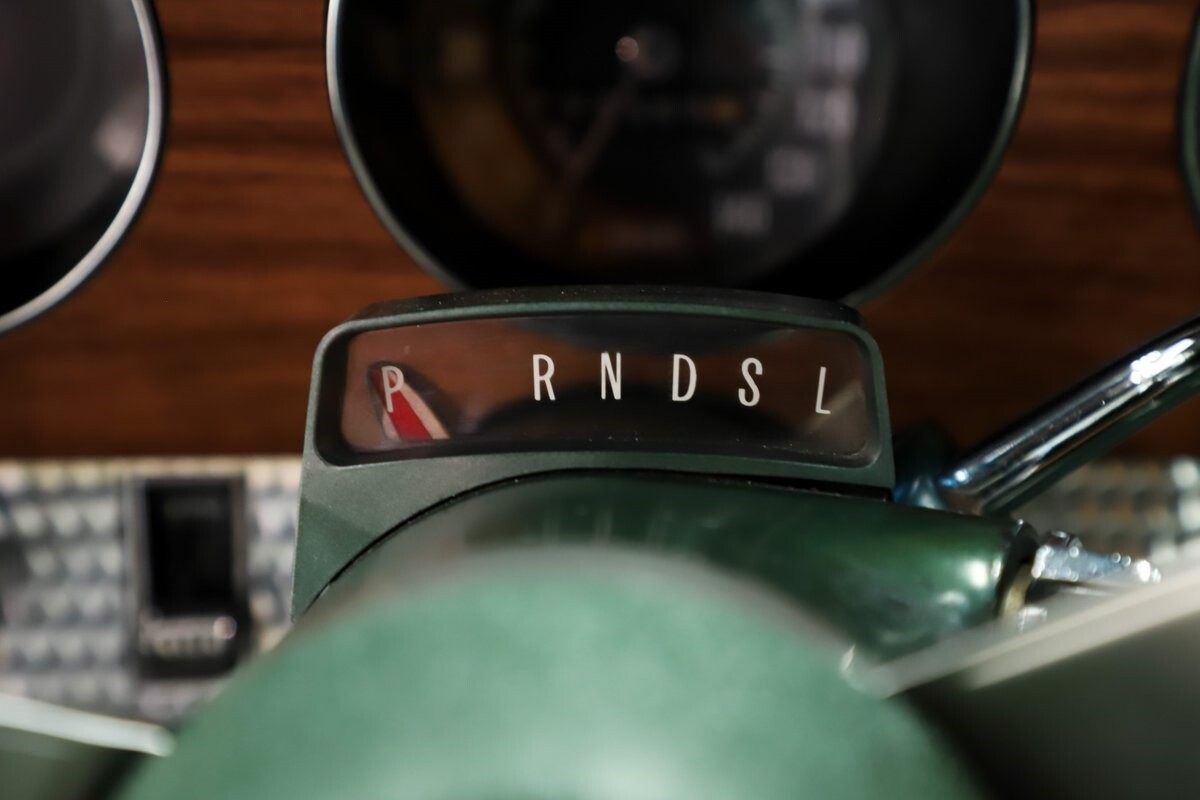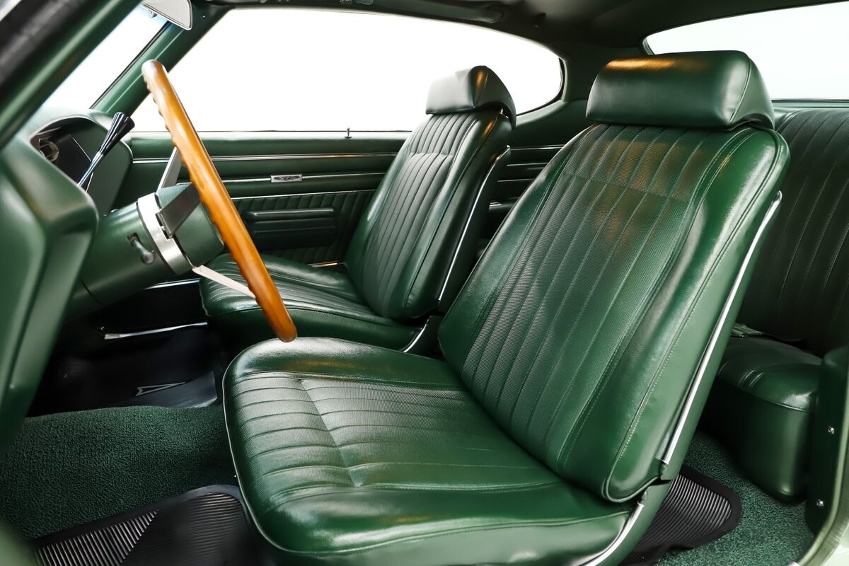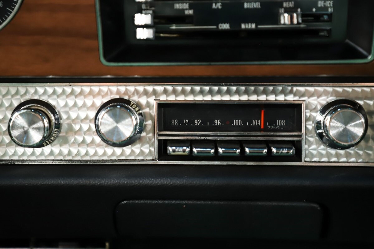INTERIOR: The interior is in outstanding condition. Down on the floor the carpet looks fresh and there's a set of reproduction mats. Complete set of original seat belts are in excellent shape. The seats have great upholstery, the headrests, plastic and chrome trim is excellent too. Side panels, armrests all look fantastic. The headliner and matching visors were replaced. In front of me is a detailed dash: the dash pad, instrument panel, heater controls, deluxe wheel are beautiful. The correct AM/FM radio works.