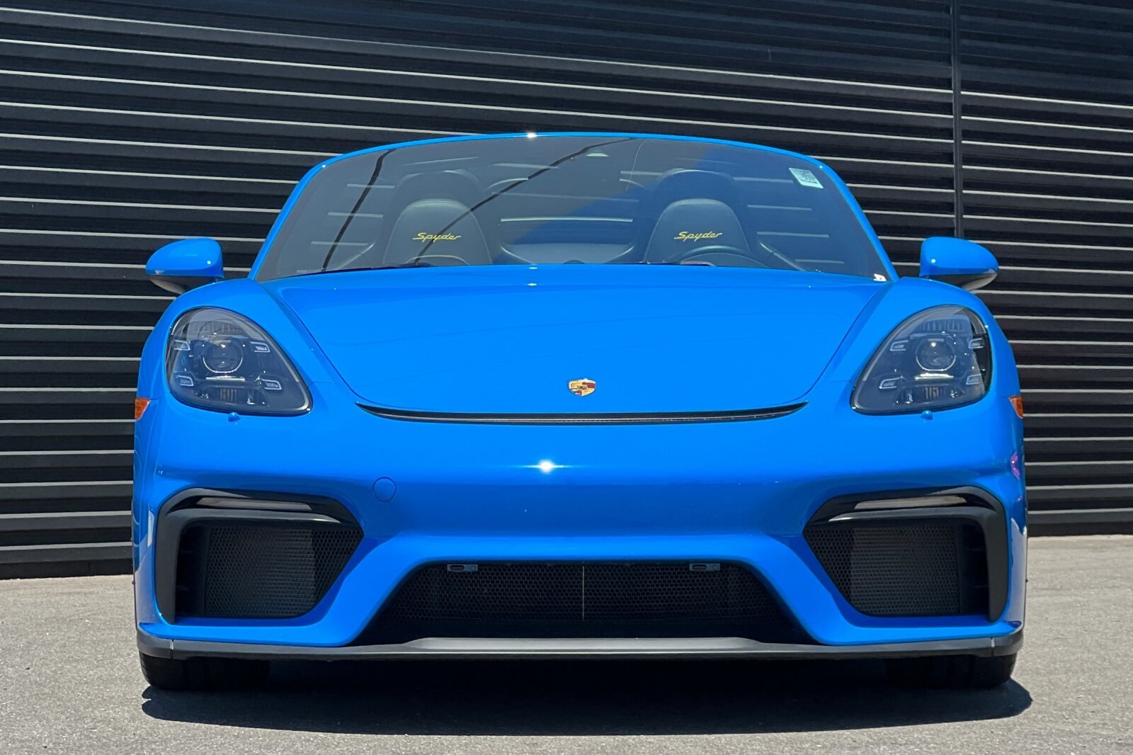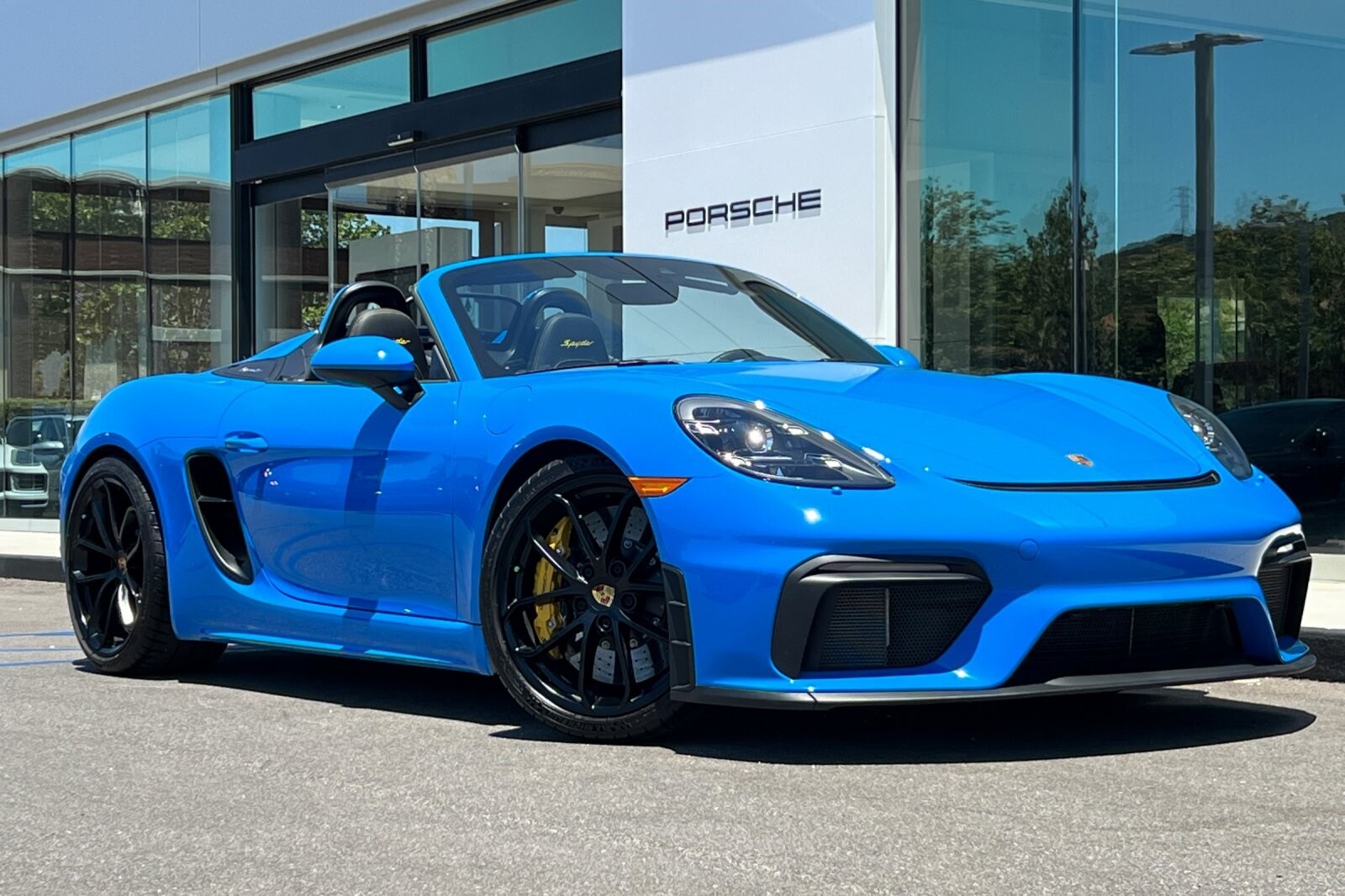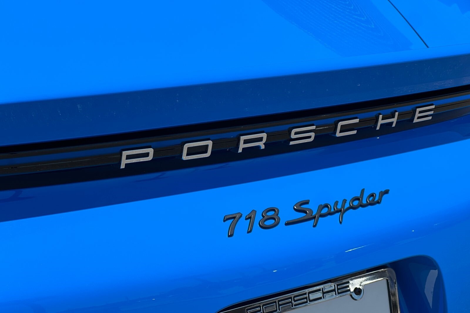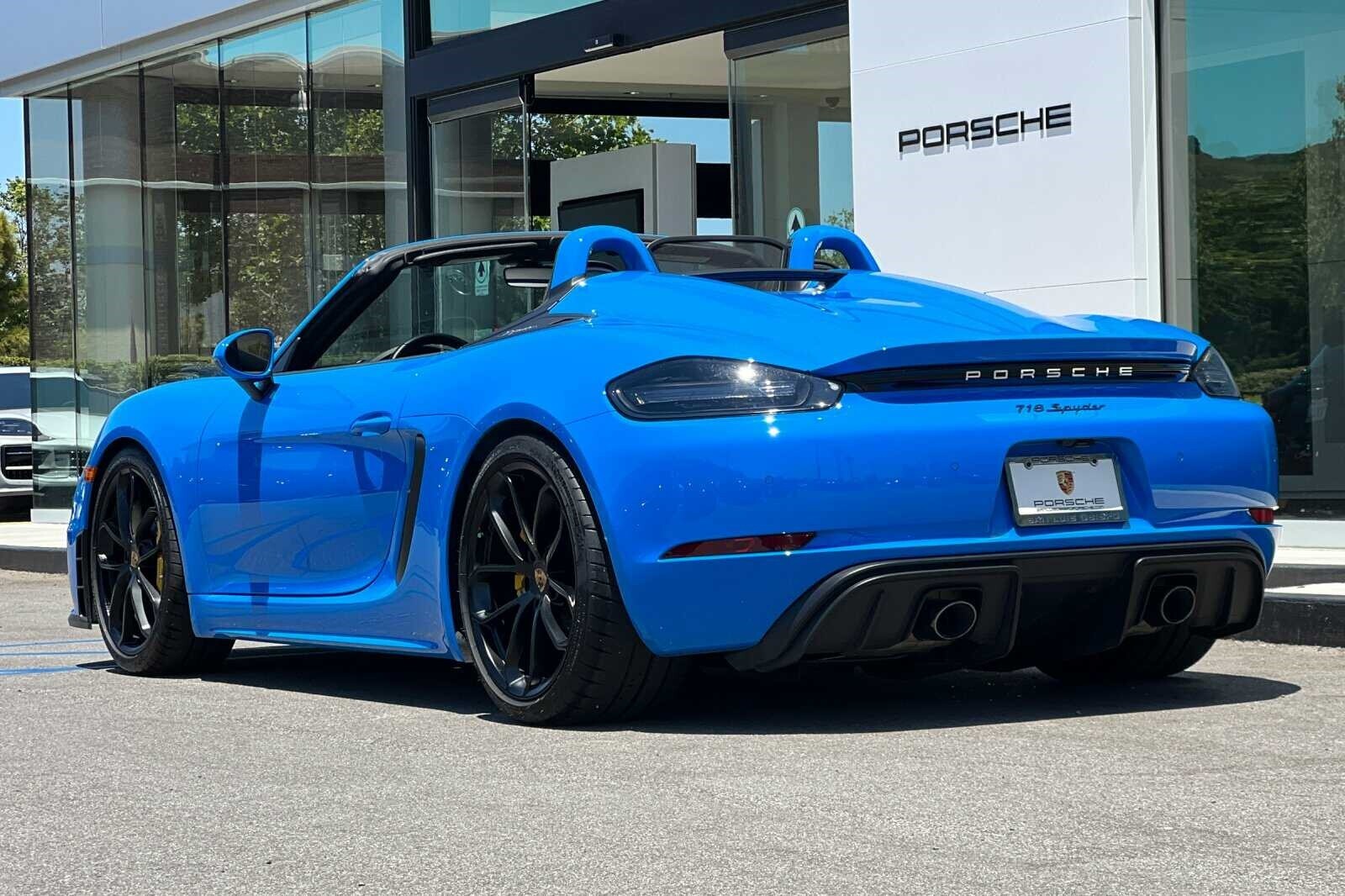 This Porsche San Luis Obispo 2022 Shark Blue Porsche 718 Spyder Base RWD is well equipped and includes these features and benefits: Dashboard Trim Package in Leather, Radio: Sound Package Plus, Porsche Approved Certified Pre-Owned Certified, BOSE Surround Sound System, Porsche Ceramic Composite Brake, 2-Way Sport Seats Plus, 4-Wheel Disc Brakes, 6 Speakers, ABS brakes, Adaptive suspension, Air Conditioning, Alloy wheels, AM/FM radio: SiriusXM, Brake assist, Bumpers: body-color, CD player, Convertible roof lining, Convertible roof wind blocker, Delay-off headlights, Driver door bin, Driver vanity mirror, Dual front impact airbags, Dual front side impact airbags, DVD-Audio, Electronic Stability Control, Exterior Parking Camera Rear, Four wheel independent suspension, Front anti-roll bar, Front Bucket Seats, Front Center Armrest, Front reading lights, Fully automatic headlights, Garage door transmitter: HomeLink, Glass rear window, Heated door mirrors, High intensity discharge headlights: Bi-Xenon, Illuminated entry, Integrated roll-over protection, Knee airbag, Low tire pressure warning, Occupant sensing airbag, Outside temperature display, Overhead airbag, Partial Leather Seat Trim w/Race-Tex Seat Centers, Passenger door bin, Passenger vanity mirror, Power door mirrors, Power driver seat, Power passenger seat, Power steering, Power windows, Radio data system, Rear anti-roll bar, Rear window defroster, Remote keyless entry, Security system, Speed control, Spoiler, Sport steering wheel, Tachometer, Telescoping steering wheel, Tilt steering wheel, Traction control, Trip computer, Variably intermittent wipers, and Wheels: 20 718 Spyder in Silver. 360 Camera, Active Parking Assist, Adaptive Cruise Control, Adaptive Headlights, Android Auto, Apple Carplay, Automatic Headlights, Blind-Spot Monitors, Bluetooth, Collision Avoidance System, Collision Warning Alert System, Drowsiness Alert, Heads-Up Display, Heated/Cooled Seats, Keyless Access w/Push Button Start, Lane Keeping Assist, Navigation, Smartphone App Integration, Touchscreen Controls, Voice Recognition, Wi-Fi Hotspot, BOSE Surround Sound System, Dashboard Trim Package in Leather, Porsche Ceramic Composite Brake.