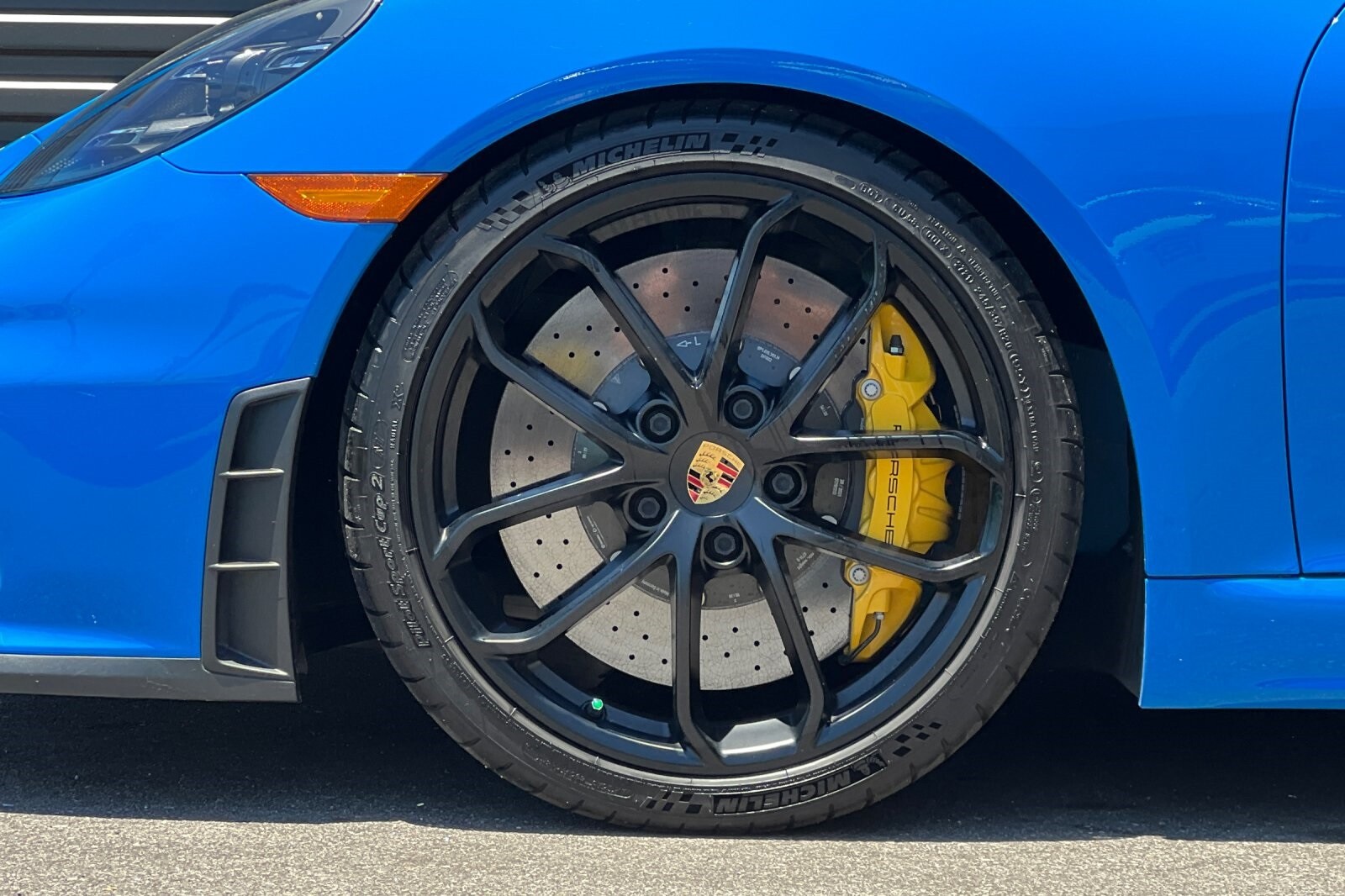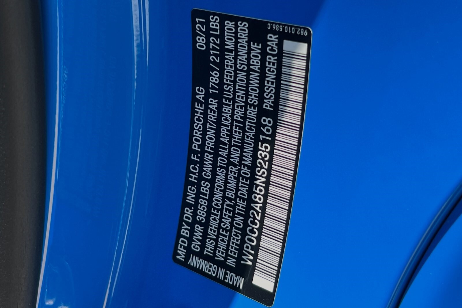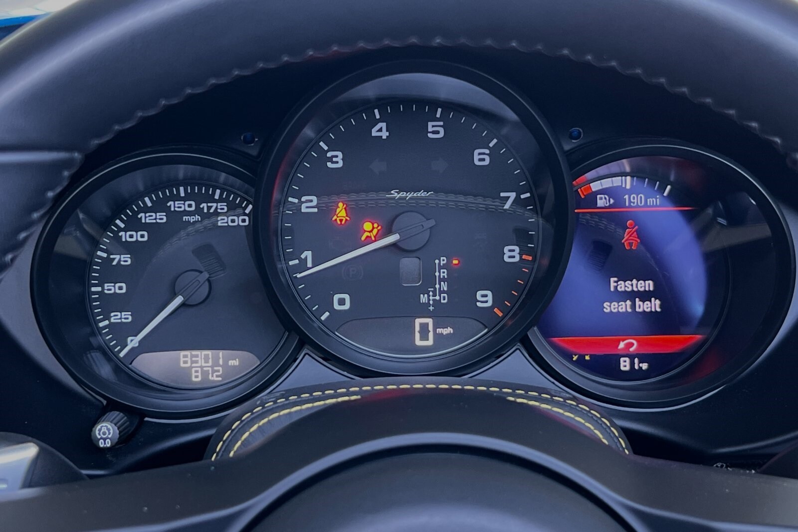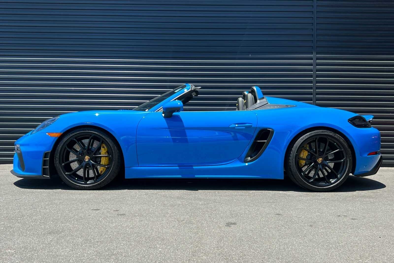 This Porsche San Luis Obispo 2022 Shark Blue Porsche 718 Spyder Base RWD is well equipped and includes these features and benefits: Dashboard Trim Package in Leather, Radio: Sound Package Plus, Porsche Approved Certified Pre-Owned Certified, BOSE Surround Sound System, Porsche Ceramic Composite Brake, 2-Way Sport Seats Plus, 4-Wheel Disc Brakes, 6 Speakers, ABS brakes, Adaptive suspension, Air Conditioning, Alloy wheels, AM/FM radio: SiriusXM, Brake assist, Bumpers: body-color, CD player, Convertible roof lining, Convertible roof wind blocker, Delay-off headlights, Driver door bin, Driver vanity mirror, Dual front impact airbags, Dual front side impact airbags, DVD-Audio, Electronic Stability Control, Exterior Parking Camera Rear, Four wheel independent suspension, Front anti-roll bar, Front Bucket Seats, Front Center Armrest, Front reading lights, Fully automatic headlights, Garage door transmitter: HomeLink, Glass rear window, Heated door mirrors, High intensity discharge headlights: Bi-Xenon, Illuminated entry, Integrated roll-over protection, Knee airbag, Low tire pressure warning, Occupant sensing airbag, Outside temperature display, Overhead airbag, Partial Leather Seat Trim w/Race-Tex Seat Centers, Passenger door bin, Passenger vanity mirror, Power door mirrors, Power driver seat, Power passenger seat, Power steering, Power windows, Radio data system, Rear anti-roll bar, Rear window defroster, Remote keyless entry, Security system, Speed control, Spoiler, Sport steering wheel, Tachometer, Telescoping steering wheel, Tilt steering wheel, Traction control, Trip computer, Variably intermittent wipers, and Wheels: 20 718 Spyder in Silver. 360 Camera, Active Parking Assist, Adaptive Cruise Control, Adaptive Headlights, Android Auto, Apple Carplay, Automatic Headlights, Blind-Spot Monitors, Bluetooth, Collision Avoidance System, Collision Warning Alert System, Drowsiness Alert, Heads-Up Display, Heated/Cooled Seats, Keyless Access w/Push Button Start, Lane Keeping Assist, Navigation, Smartphone App Integration, Touchscreen Controls, Voice Recognition, Wi-Fi Hotspot, BOSE Surround Sound System, Dashboard Trim Package in Leather, Porsche Ceramic Composite Brake.
