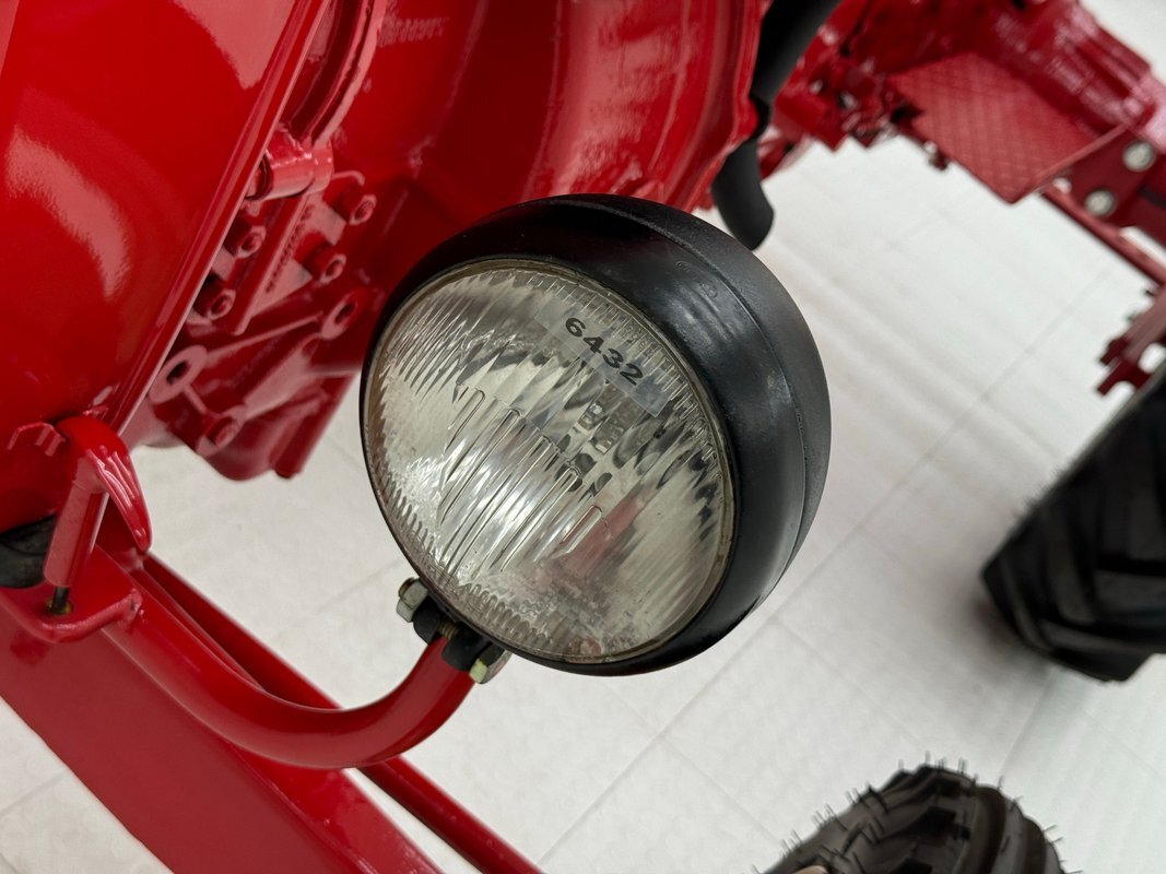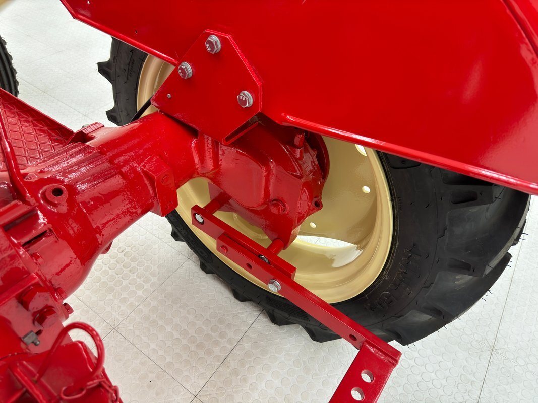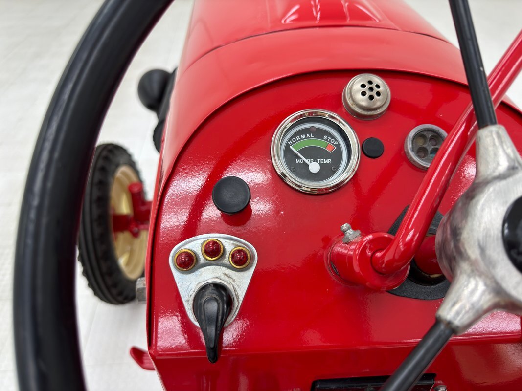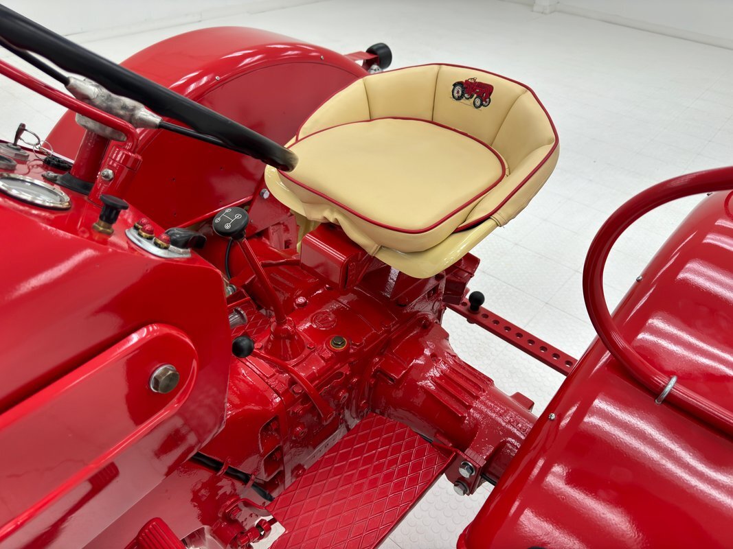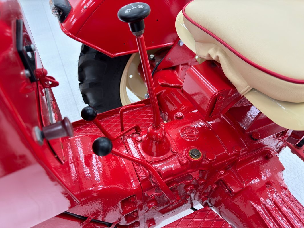 A beige bucket seat is lined with red piping but also wears an embroidered version of this very tractor on the seat back. The steering wheel retains just a touch of patina as it fronts a spotless dash panel that houses the simple switches while floor mounted shifters control the moving mechanisms including the differential and transmission. Shiny red paint coats the steel floor and all cabin surfaces.