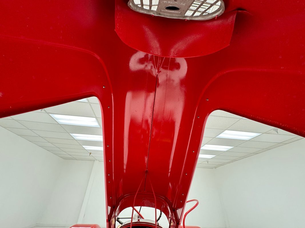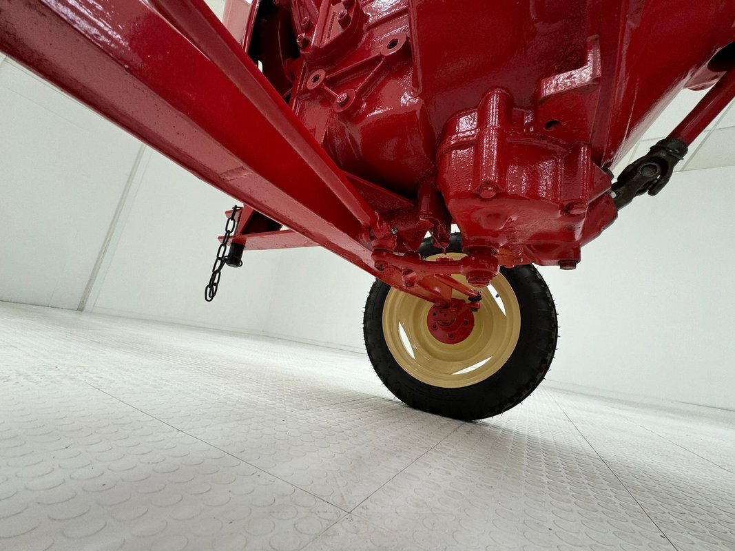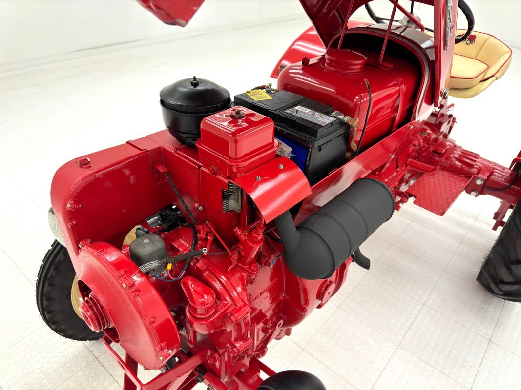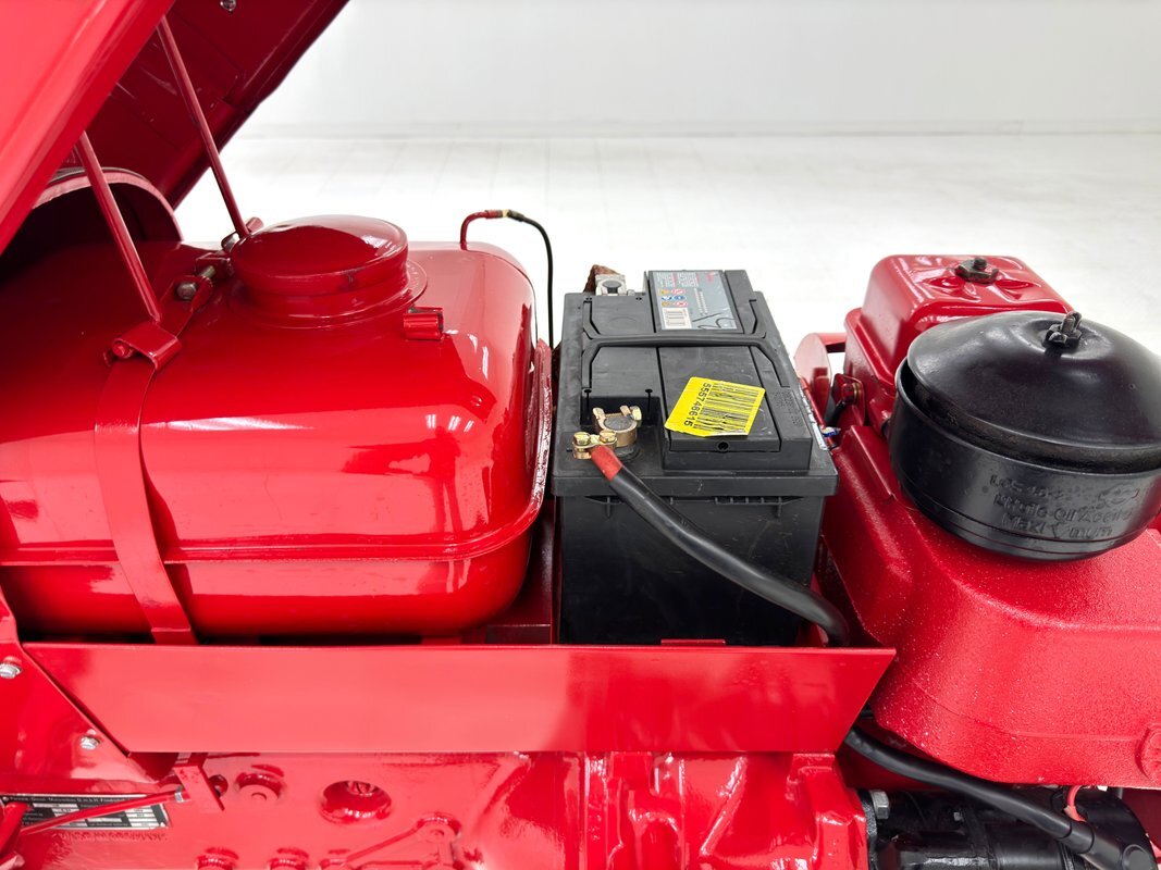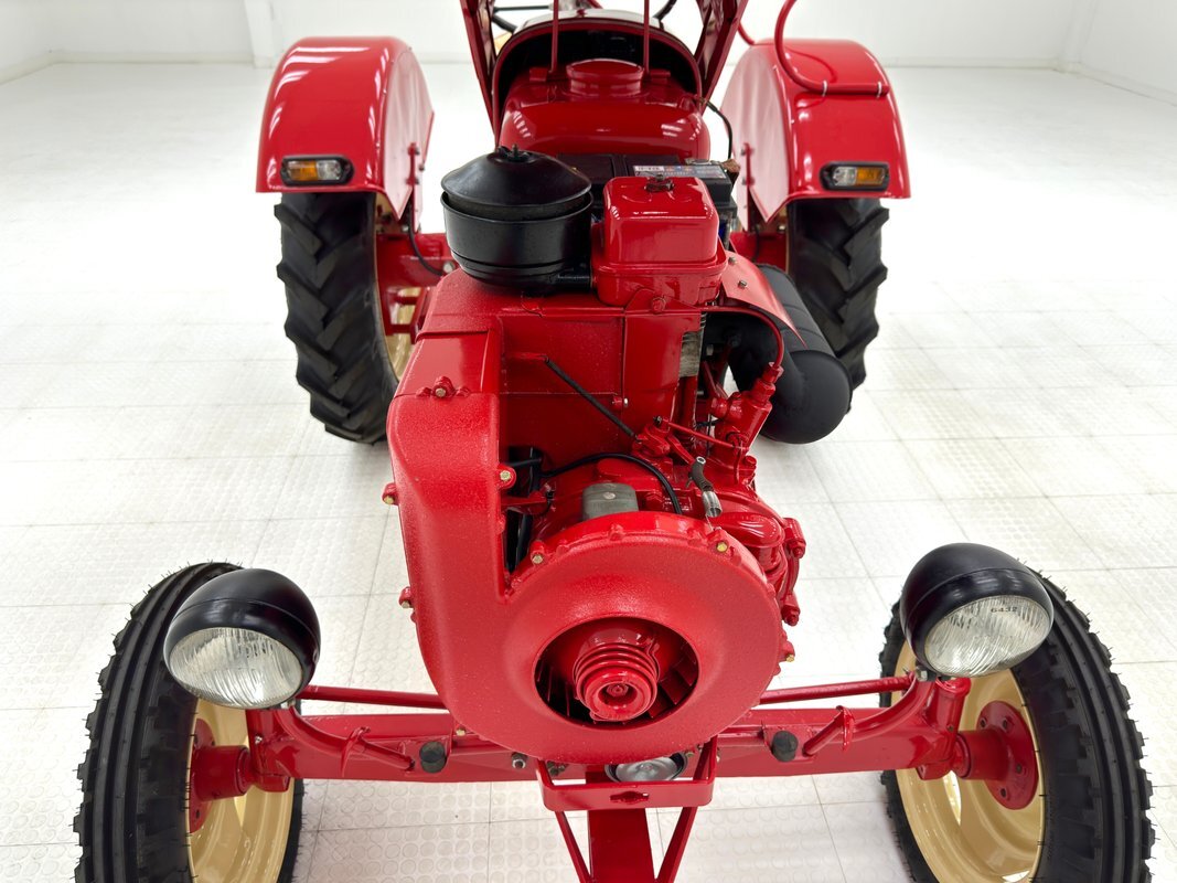 A beige bucket seat is lined with red piping but also wears an embroidered version of this very tractor on the seat back. The steering wheel retains just a touch of patina as it fronts a spotless dash panel that houses the simple switches while floor mounted shifters control the moving mechanisms including the differential and transmission. Shiny red paint coats the steel floor and all cabin surfaces.