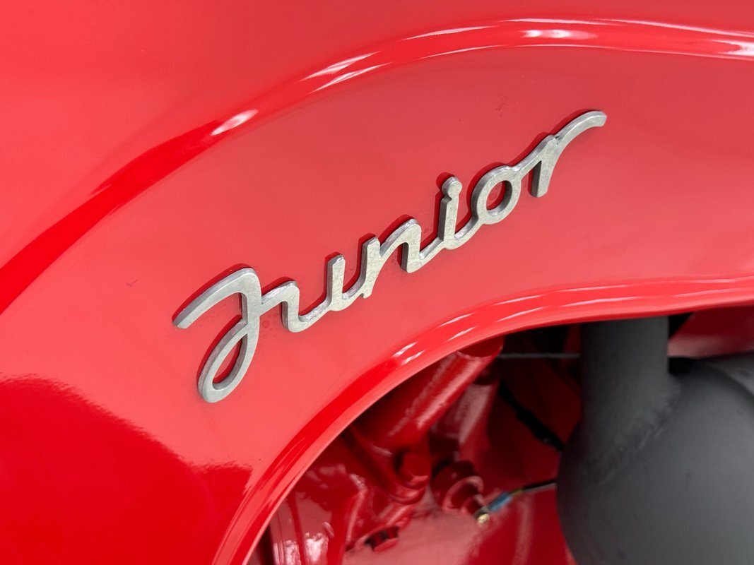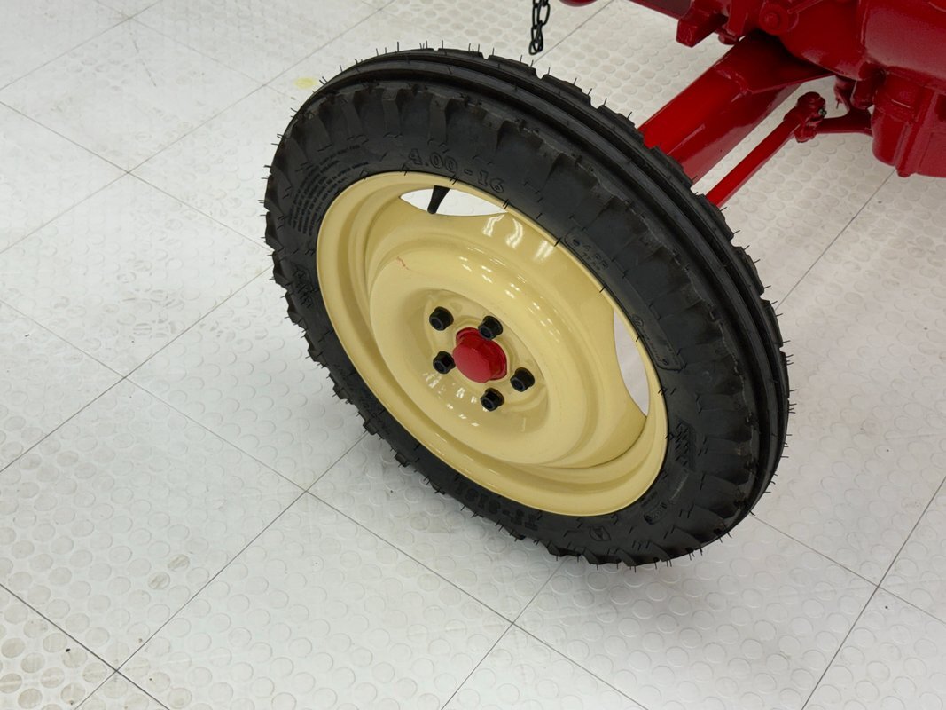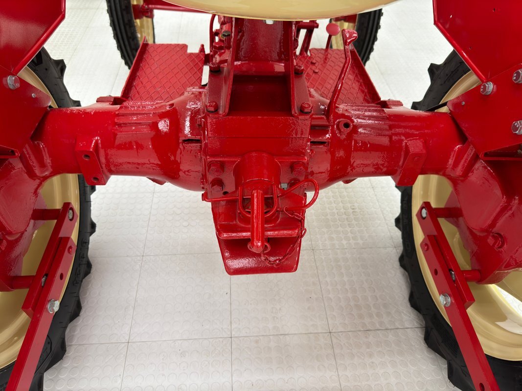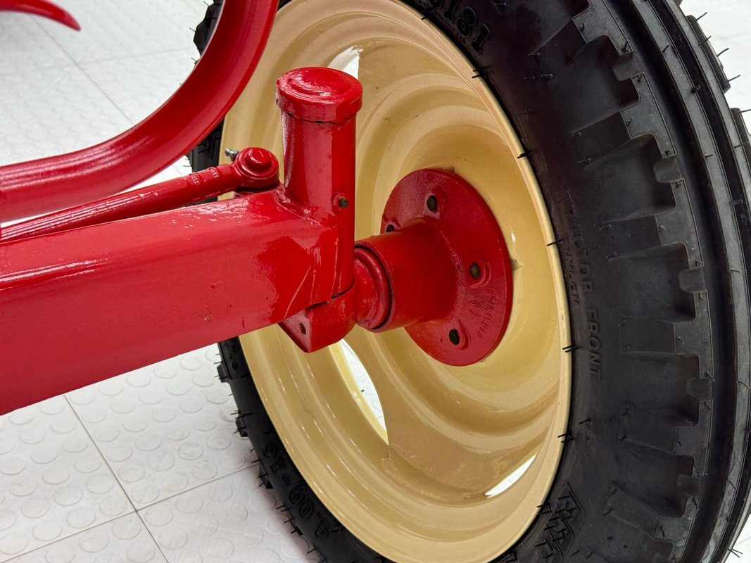 Dominated in glossy Red paint, the tractor "bullnose" hood leans forward like a protuberance with eyes, small semicircle grilles serve as the nostrils that allow air into the radiator. The uniformity of the red continues through the axles, frame, and drivetrain and peaks on the large rear fenders and down onto the drawbar. Cream colored wheels are a wonderful contrast, and the red hubs tie it all together. Metal name plates are affixed to the hood and Junior was part of the crimson tractor series that also included Standard, Super, and Master.