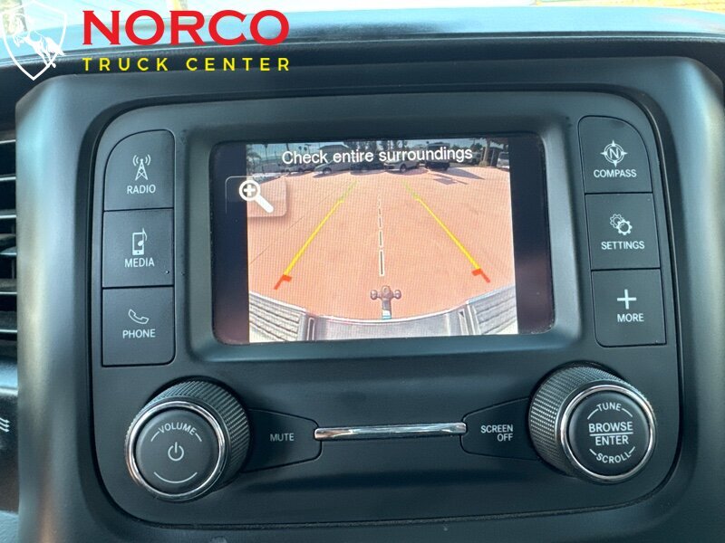 INSTALLED FEATURES: Front air conditioning, Front air conditioning zones: single, Rear vents: second row, Airbag deactivation: occupant sensing passenger, Front airbags: dual, Side airbags: front, Side curtain airbags: front / rear, Antenna type: mast, Auxiliary audio input: Bluetooth / USB / jack, Radio: AM/FM / touch screen display / voice operated, Radio data system, Speed sensitive volume control, Total speakers: 6, ABS: 4-wheel, Brake drying, Braking assist, Electronic brakeforce distribution, Emergency braking preparation, Front brake diameter: 14.2, Front brake type: ventilated disc, Front brake width: 1.54, Power brakes, Rear brake diameter: 14.1, Rear brake type: ventilated disc, Rear brake width: 1.34, Armrests: front center, Cargo area floor mat: rubber/vinyl, Dash trim: alloy, Door sill trim: scuff plate, Door trim: alloy, Floor mat material: rubber/vinyl, Floor material: carpet, Floor mats: front / rear, Steering wheel trim: urethane, Assist handle: front / rear, Cruise control, Cupholders: front, Multi-function remote: keyless entry / panic alarm, One-touch windows: 2, Overhead console: front, Power outlet(s): 12V front / USB front, Power steering, Power windows: lockout button, Push-button start, Reading lights: front, Rearview mirror: manual day/night, Steering wheel: tilt, Steering wheel mounted controls: cruise control / multi-function / phone / voice control, Storage: accessory hook / door pockets / under rear seats, Vanity mirrors: passenger illuminating, 4WD selector: electronic hi-lo, 4WD type: part time, Axle ratio: 3.73, Alternator: 180 amps, Auxiliary oil cooler, Battery: maintenance-free, Battery rating: 730 CCA, Battery saver, Emissions: 50 state, Active grille shutters, Door handle color: body-color, Front bumper color: chrome, Grille color: black / chrome surround, Headlight bezel color: chrome, Mirror color: black, Pickup bed light, Rear bumper color: chrome, Tailgate: power locking / removable, Window trim: black, Infotainment: Uconnect, Infotainment screen size: 5 in., Clock, Compass, Digital odometer, External temperature display, Fuel economy display: MPG / range, Gauge: tachometer, Instrument cluster screen size: 3.5 in., Multi-function display, Powertrain hour meter, Trip odometer, Warnings and reminders: low fuel level / low oil level / maintenance due, Daytime running lights, Exterior entry lights: approach lamps / puddle lamps, Headlights: auto delay off / auto on/off / halogen / quad headlights, Side mirror adjustments: manual folding / manual telescoping / power, Side mirrors: heated / integrated turn signals, Towing mirrors, Camera system: rearview, Child safety door locks, Child seat anchors: LATCH system, Crumple zones: front, Rearview monitor: in dash, Emergency locking retractors: front / rear, Front seatbelts: 3-point, Rear seatbelts: 3-point, Seatbelt force limiters: front, Seatbelt pretensioners: front, Seatbelt warning sensor: front, Driver seat manual adjustments: reclining / 4, Front headrests: adjustable / 2, Front seat type: 40-20-40 split bench, Passenger seat manual adjustments: reclining / 4, Rear headrests: adjustable / 3, Rear seat folding: folds up, Rear seat type: bench, Upholstery: cloth, Anti-theft system: vehicle immobilizer, Power door locks: auto-locking, Hill holder control, Roll stability control, Stability control, Traction control, Trailer stability control, Front shock type: gas, Front spring type: coil, Front stabilizer bar, Front suspension classification: solid live axle, Front suspension type: multi-link, Rear shock type: gas, Rear spring type: coil, Rear stabilizer bar, Rear suspension classification: solid live axle, Rear suspension type: multi-link, Suspension control: frequency selective, Electronic messaging assistance: voice operated / with read function, Phone: voice operated, Wireless data link: Bluetooth, Spare tire mount location: underbody, Spare tire size: full-size, Spare wheel type: steel, Tire Pressure Monitoring System, Tire type: all season, Wheels: chrome clad, Auxiliary transmission fluid cooler, Pickup bed cargo management: tie-down anchors, Trailer brake controller, Trailer hitch: Class V, Trailer wiring: 4-pin / 7-pin, Front wipers: variable intermittent, Laminated glass: acoustic, Power windows: safety reverse, Rear privacy glass, Solar-tinted glass