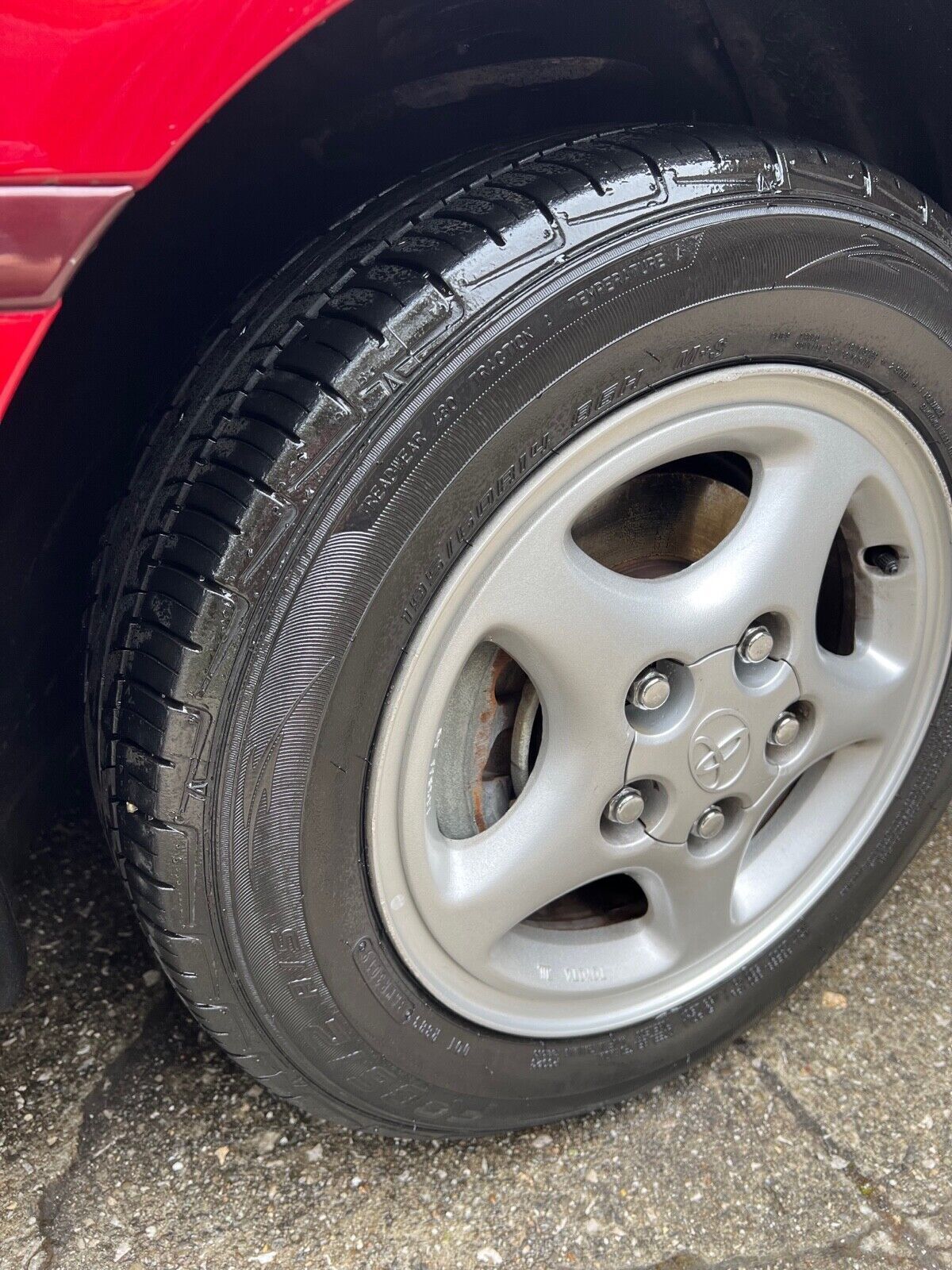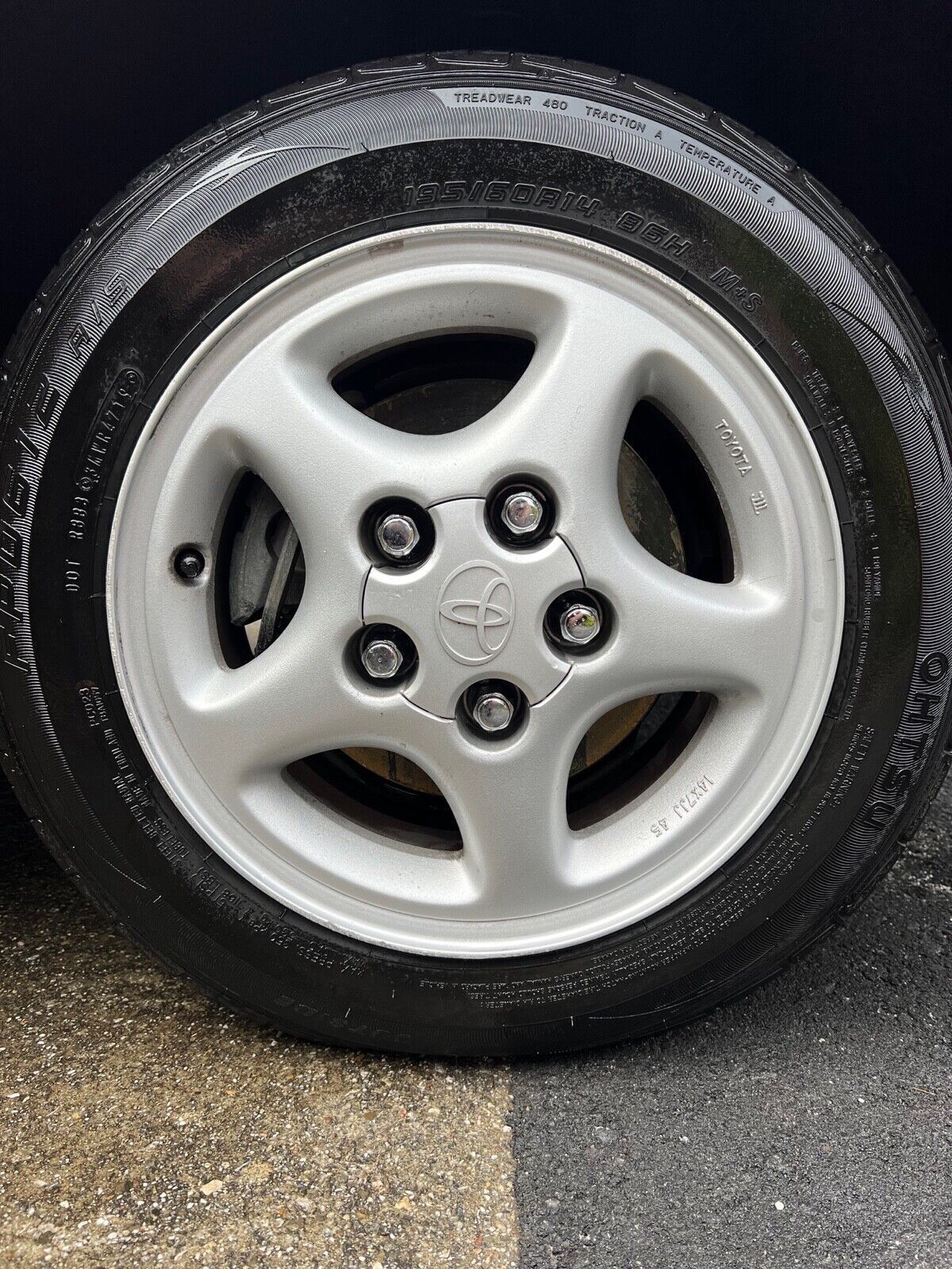Silver 14? five-spoke alloy wheels are mounted with 195/60 Ohtsu FP0612 A/S tires that show 2019 date codes. Four-wheel disc brakes came standard.