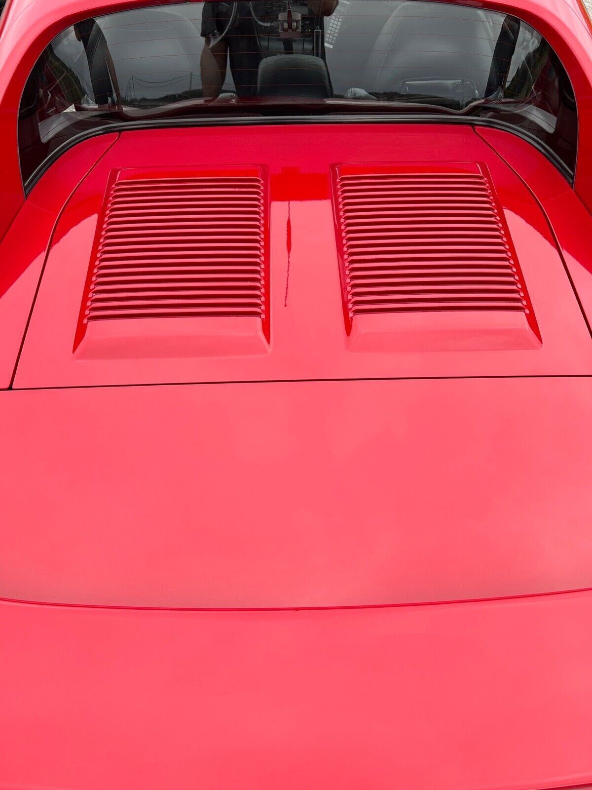 The exterior is finished in Crimson Red (3J6) and features fog lights, pop-up headlamps, side scoops, removable glass T-top roof panels, dual exhaust outlets, and an integrated rear wing.