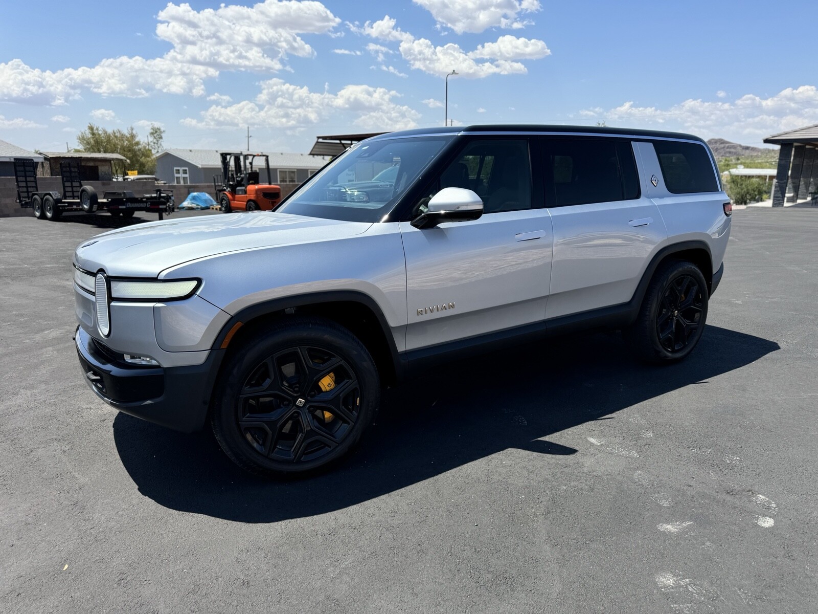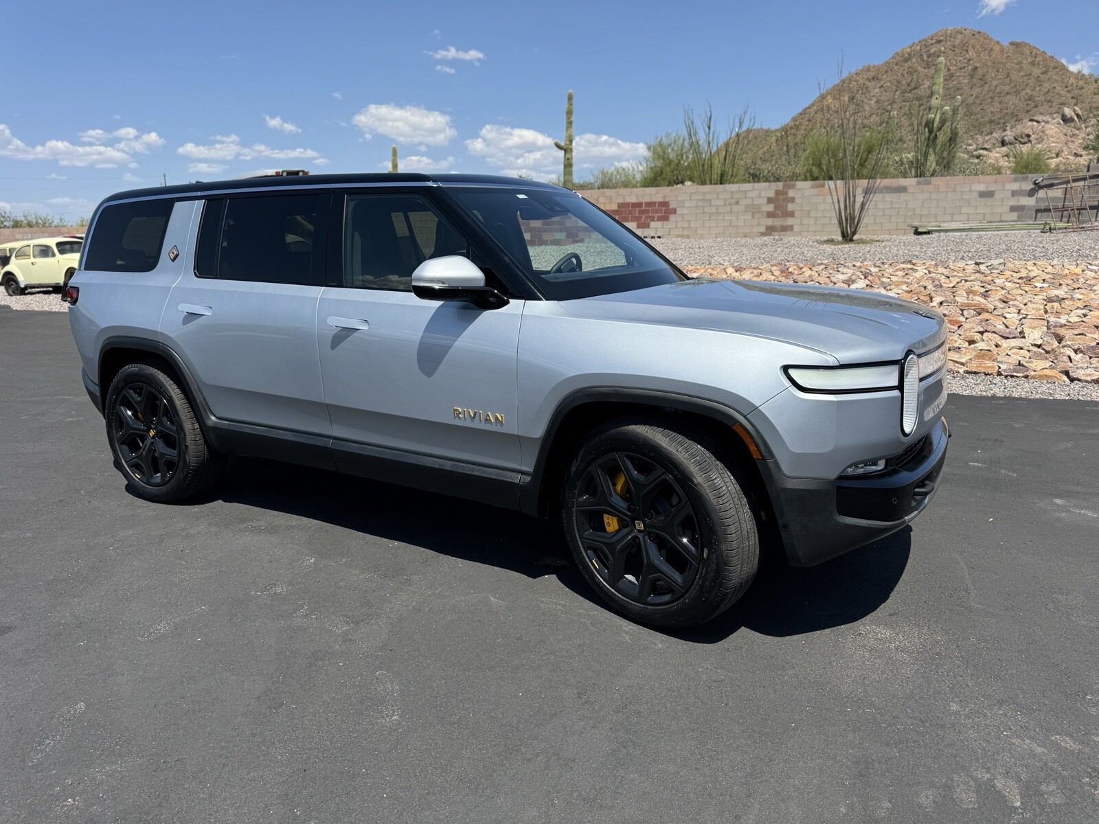 2023 RIVIAN R1S ADVENTURE PACKAGE QUAD MOTOR AWD LA SILVER EXTERIOR WITH BLACK MOUNTAIN + DARK ASH WOOD INTERIOR, 22INCH SPORT DAR WHEELS, LOOKS AND RUNS GREAT! SUPER LOW MILES ONLY 5,790 MILES