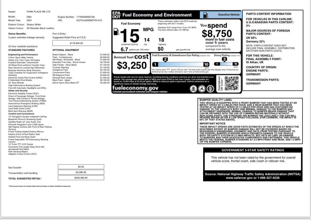 Selling My 2021 Aston Martin DBX Vehicle is in excellent running condition, interior and exterior are in excellent condition. Vehicle has an existing extended warranty until February 2025. Car has 22,500 miles on the ODO Title is in Hand and ready for the new buyer, there are no Liens on the vehicle. Please shoot me a message for my details and test drive.Seller's Notes