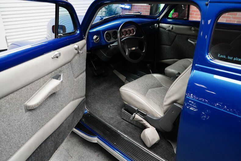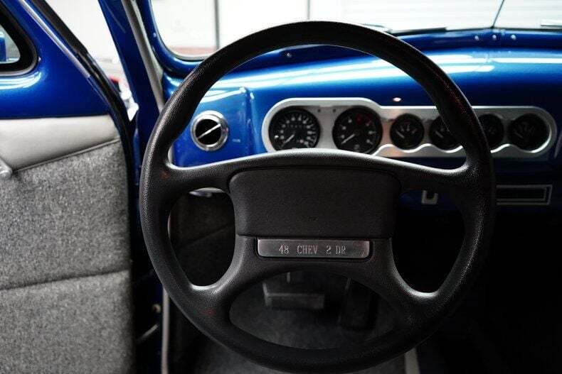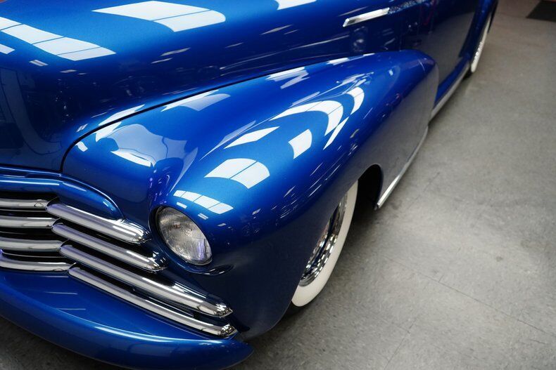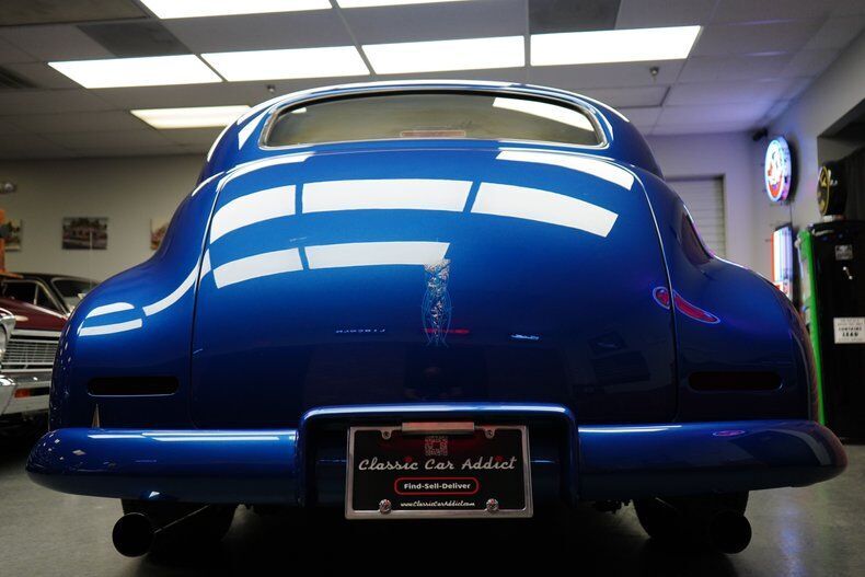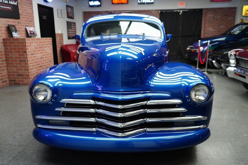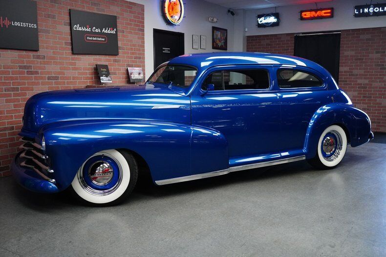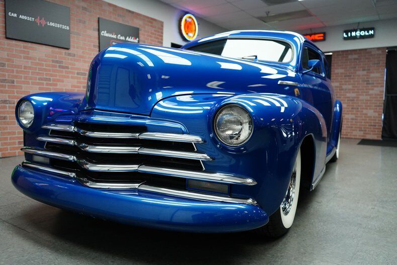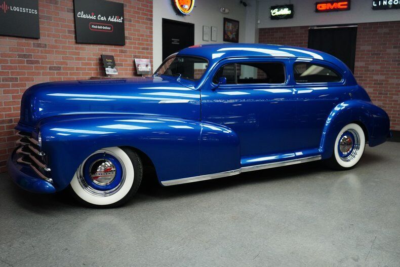 Classic Car Addict would like to introduce this distinctive all metal and totally custom 1948 Chevrolet Fleetline Custom Coupe that gives a super-sleek first impression from every angle! As you dig deeper, you're going to love how the total package mixes vintage styling with proper small block power, TH350 transmission, custom interior, and so much more. The sweeping all metal fenders and sleek rounded silhouette of this Chevys sheet metal were made for this custom application of blue. It has a modern shine that highlights the vintage curves. We especially like the hand painted pinstripe (purple, white, and light blue) that really draw your eye to the sharply pointed grille. To add; you'll love the details with the expertly shaved trim (including door handles,) frenched taillights, headlights, and license plate; power windows, sport mirrors, custom parking lights, custom one-off rockers, custom gas filler, and US Wheel Deuce chrome painted rims. LED Dakota Digital alphanumeric gear shift indicator is another nice touch! And of course, before they did any of the other custom work, they chopped 3 inches out of the roof line that gives the ideal street machine profile. The interior goes for a tasteful gray tweed and vinyl, but the blue carries onto the dash and the custom door panels just so you know this is a very uniform build. Part of this custom transformation was about making this classic quite a bit more comfortable. That's why you have nice bolstering on the front bucket seats, and they individually adjust to your ideal setting. The back has a well-done bench and offers adult-sized legroom. Modern features like the Panasonic cockpit AM/FM/Cassette stereo, CB radio (not working), with cold air conditioning that will keep everyone happy and comfortable. Of course, we all know the driver is the Legend; that's why you have upgrades like the custom steering wheel with Chevys Heartbeat logo, a tilt column, and a crisp set of upgraded VDO gauges. The inner walls of the engine bay have a sleek and clean look that funnels your attention to the polished heart in the middle. More than just a great look, this is Chevy's hardy 350 cubic-inch V8. Its upgraded engine modifications are a bored .030 over forged pistons, Edelbrock Weber performer cam, intake and carburetor and a dual exhaust with a nice low rumble. This custom build was meant for the road with the front suspension upgraded to a Mustang II IFS and rear has a Nova with stock springs. There's an aluminum radiator to help keep this motor running cool, and the 3-speed automatic transmission holds all the power. Plus, there's power steering, new Baer brakes master cylinder, and new Coker BFGoodrich Silvertown Radial T/A's P215/70R15's. This is a true custom build that fits everything you could ever want. We have a full book of receipts and documents for this Fleetline. Don't let this complete package drive away, call Classic Car Addict today 480-256-1459.