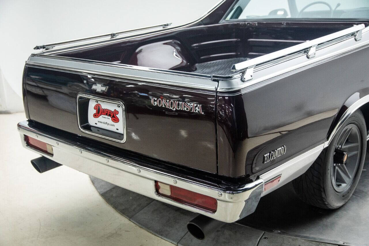 1985 Chevrolet El Camino Conquista. Here is an outstanding example of El Camino with lots of appeal. Powered by the numbers matching built 5.0L v-8 with aftermarket fuel injection and an overdrive automatic transmission and all the luxury of power steering, power disc brakes, power windows, power locks, and Air Conditioning. The paint is beautifully repainted maroon metallic finish. The cloth grey split bench seat and interior are original style and all redone in excellent shape. Comfort features include very desirable Air Conditioning Power Front Disc Brakes and Power Steering, cruise control, tilt wheel. dual color keyed sport mirrors with drivers remote, 15 inch Stock sport wheels with newer tires. Beautiful maroon and silver finish with Conquista decals is in excellent shape. The dash is like new with working clock and full factory gauges that operate. Currently it has 47,585 actual miles showing. Air conditioning is ice cold. There is a factory Delco AM-FM cassette Stereo in the dash. All the chrome and stainless trim are in great original shape and look very good. Bed has a rubber mat. Comes with original owners manual and copy of window sticker, lots of receipts. This one is ready to show with the best and impress the rest! As always, we will consider all types of trades. Transportation is available. Why buy from us? We are one of the oldest and largest Midwest dealers who specializes in collector cars, modern muscle cars and imports. We normally have 40-90 collector cars in stock. All of our cars are handpicked purchases, not consignments, that have been evaluated for quality, value and checked over in our shop to assure drivability. These cars are available to look over, test drive and evaluate at our location, by appointment only, due to the extensive amount of travel it takes to find these vehicles. People frequently buy collector cars at auctions and have no idea what they are getting, often regretting the purchase due to issues of condition, drive-ability, paperwork, etc . We have 40+ year's experience in the automotive industry and can guide our customers through the complete purchase experience including shipping if needed. We will happily consider all types of trades including multiple trades of different types if necessary. We also will purchase restored cars and restored collections of cars. No projects wanted. Please do not hesitate to contact us with any questions regarding a vehicle we have for sale or a vehicle you have for sale.319-462-1129