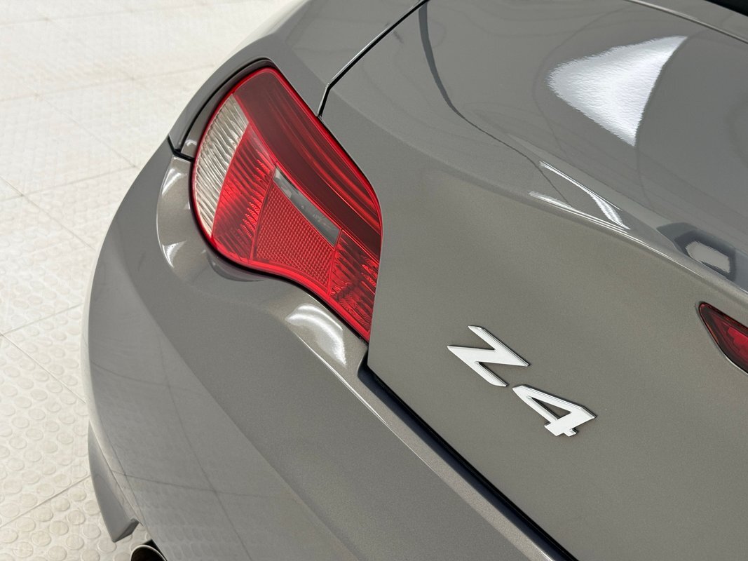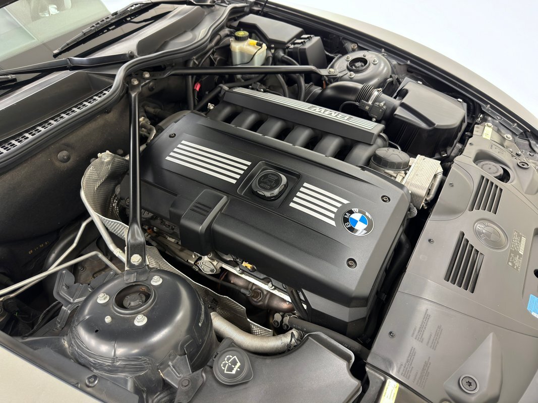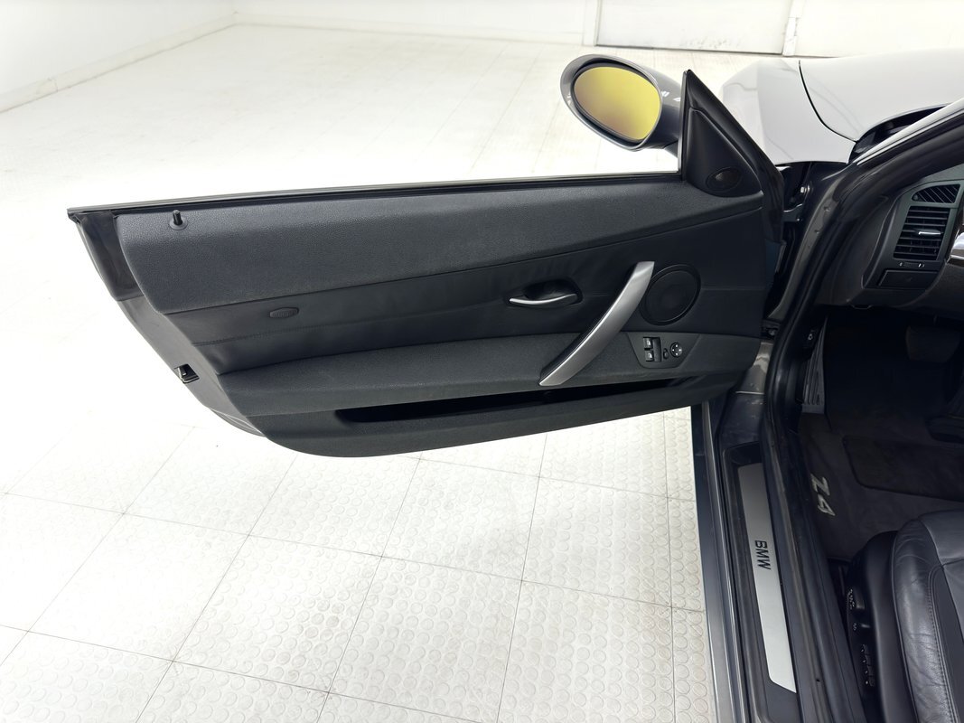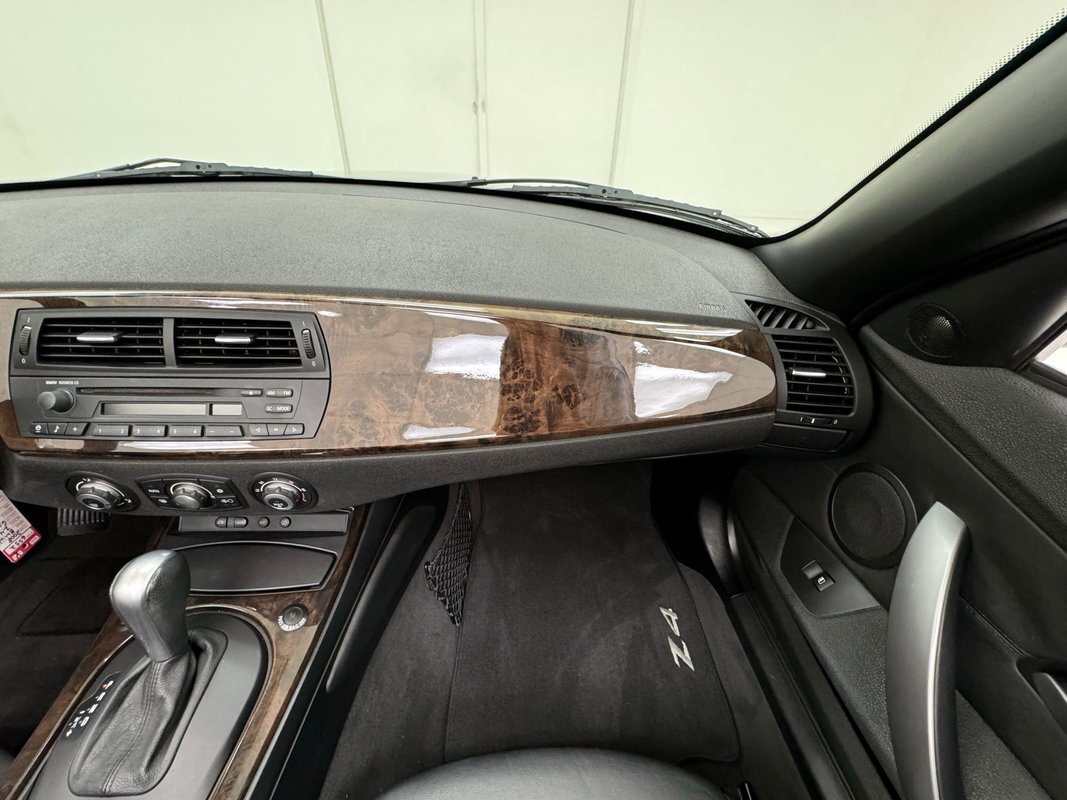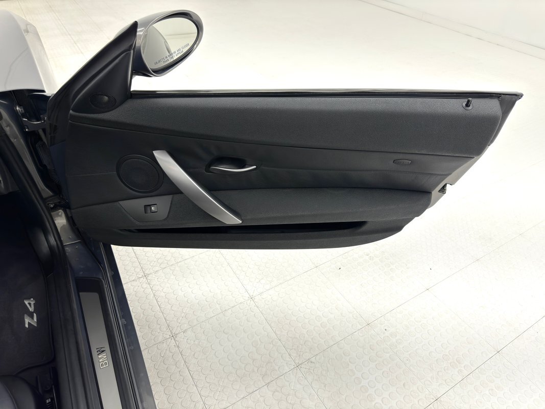 The door panels are a handsome blend of black leather and plastic along with nickel colored pull handles and controls. Black leather also covers the bucket seats, and the driver has multiple electronic control options mounted on the side and front of the seat. The three spoke leather clad steering wheel has good grip and various thumb driven controls and fronts a very clean interior. A faux burlwood topped black center console races past the seats toward the dash and houses the automatic shifter with an aluminum colored knob and black leather boot. The dash front utilizes a combination of textured molded plastic in black and large wood grain plastic panels. In front of the driver is a large arched dash front which has dual analog gauges in deep coves within the arch. These gauges have digital readouts and there are several warning lights in the field which separates these dual circles. A central air vent and control panel is embedded onto the aluminum and contains the factory AM/FM/CD radio. Black carpet covers the floors and fitted Z4 carpeted mats protect it all in very fine condition.