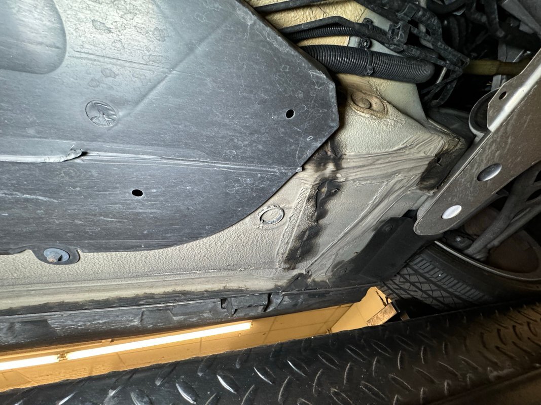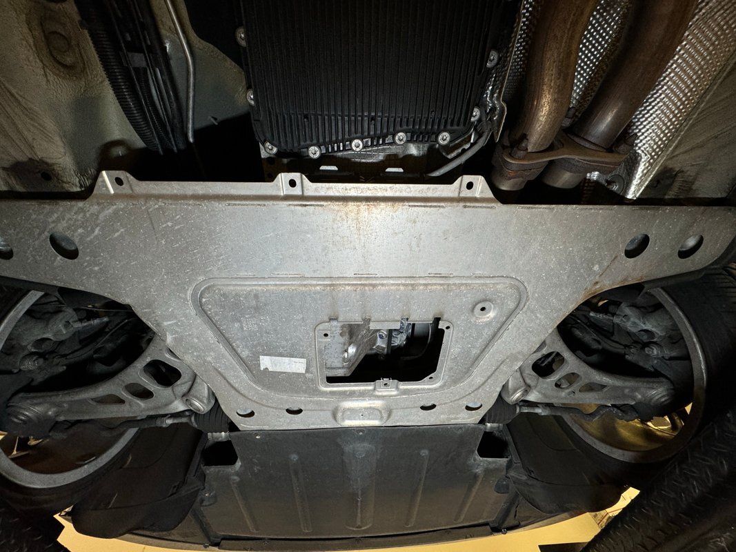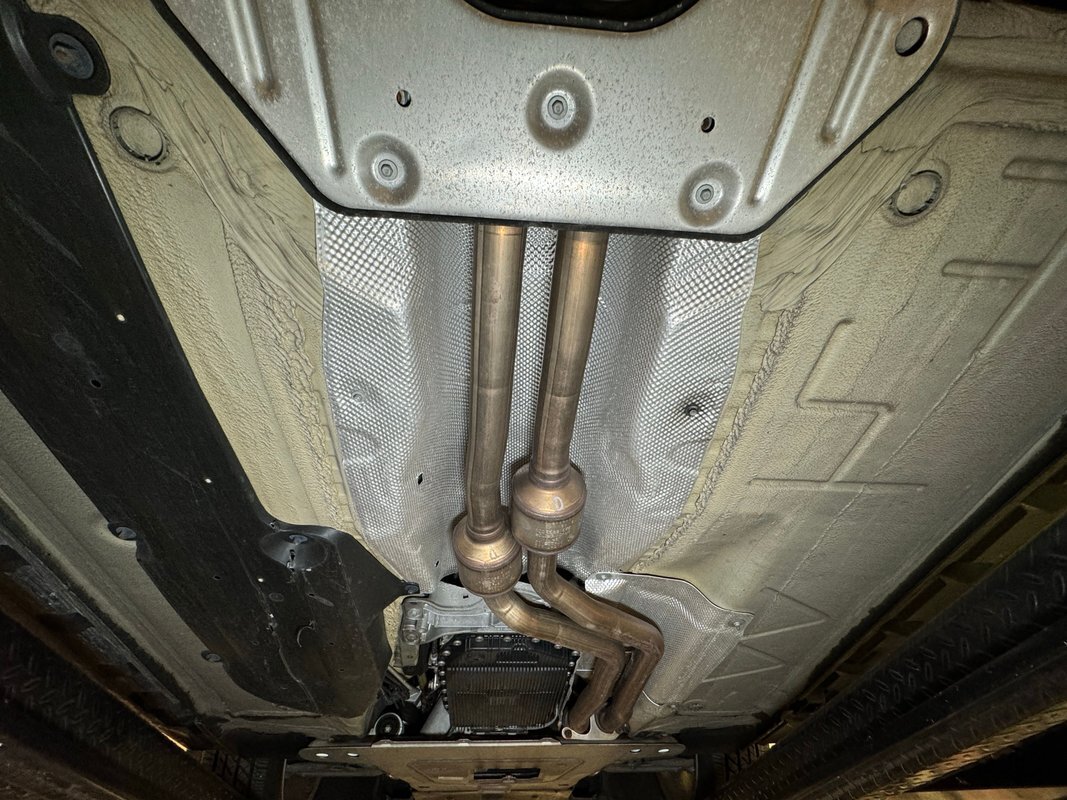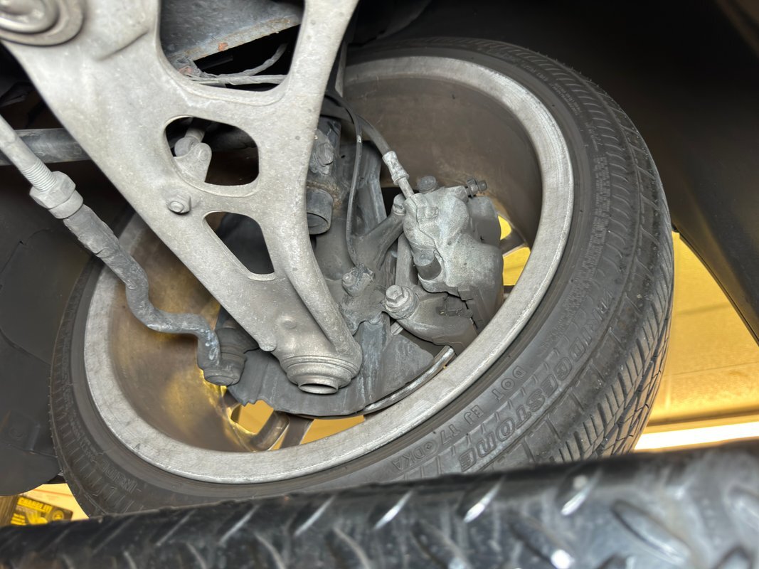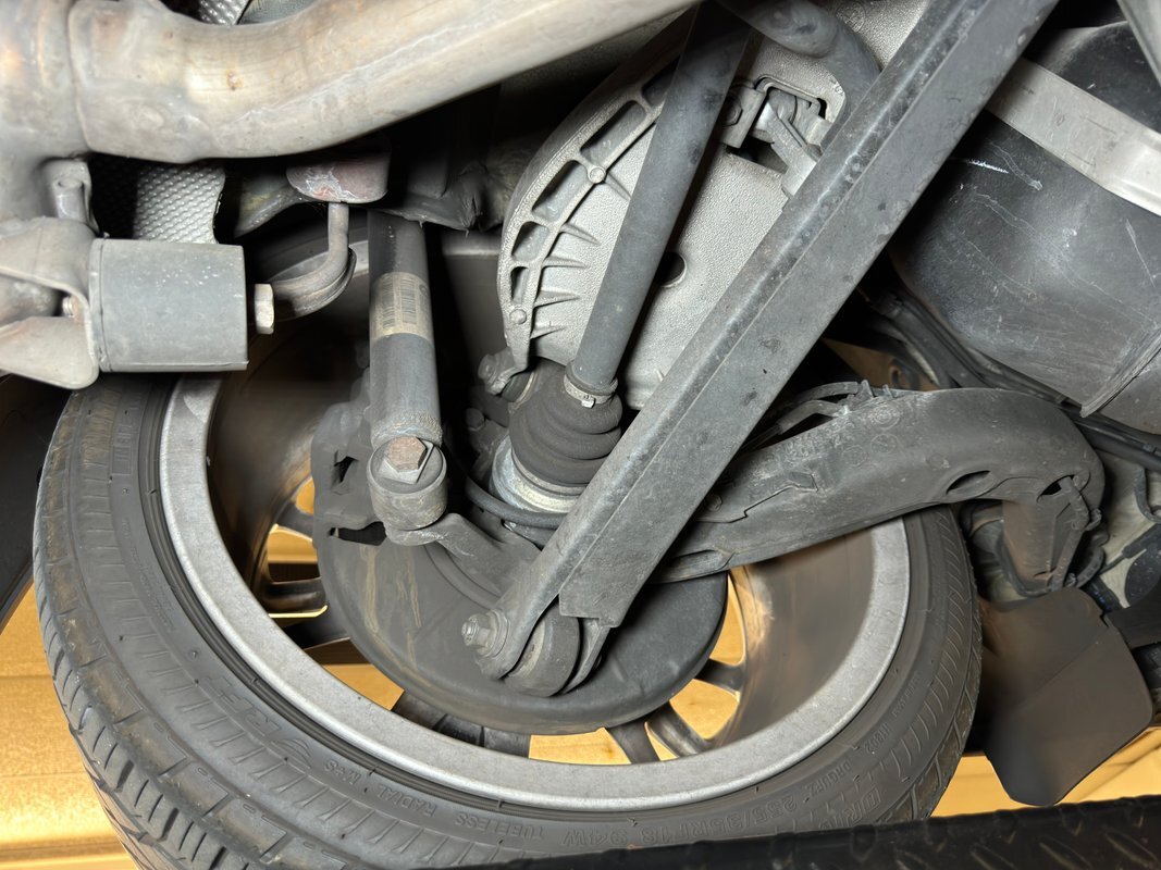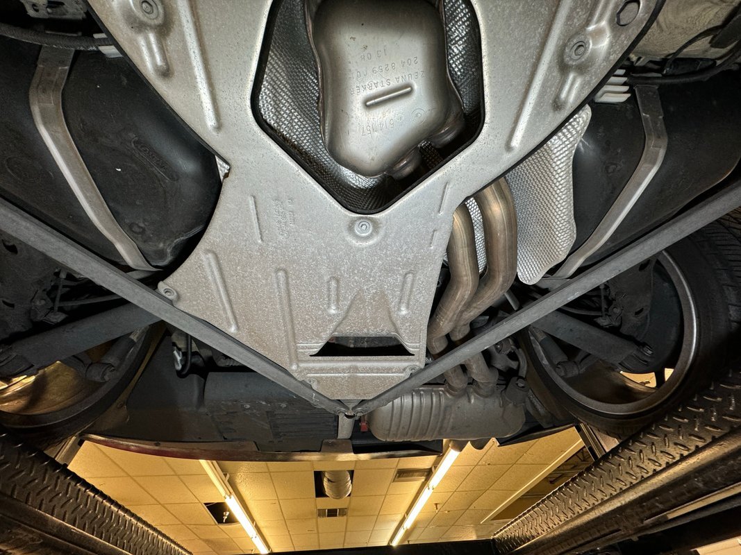 Straight and rust free panels to give some ground effect aero to this car are seen along with a solid unibody. Twin exhaust pipes enter a single catalytic converter, come out as two, enter a stock muffler then exit via twin tips. Front independent coil spring suspension is seen with an independent multilink and coil spring suspension in the rear. It's all in very nice condition, lacking oil leaks and surface rust.