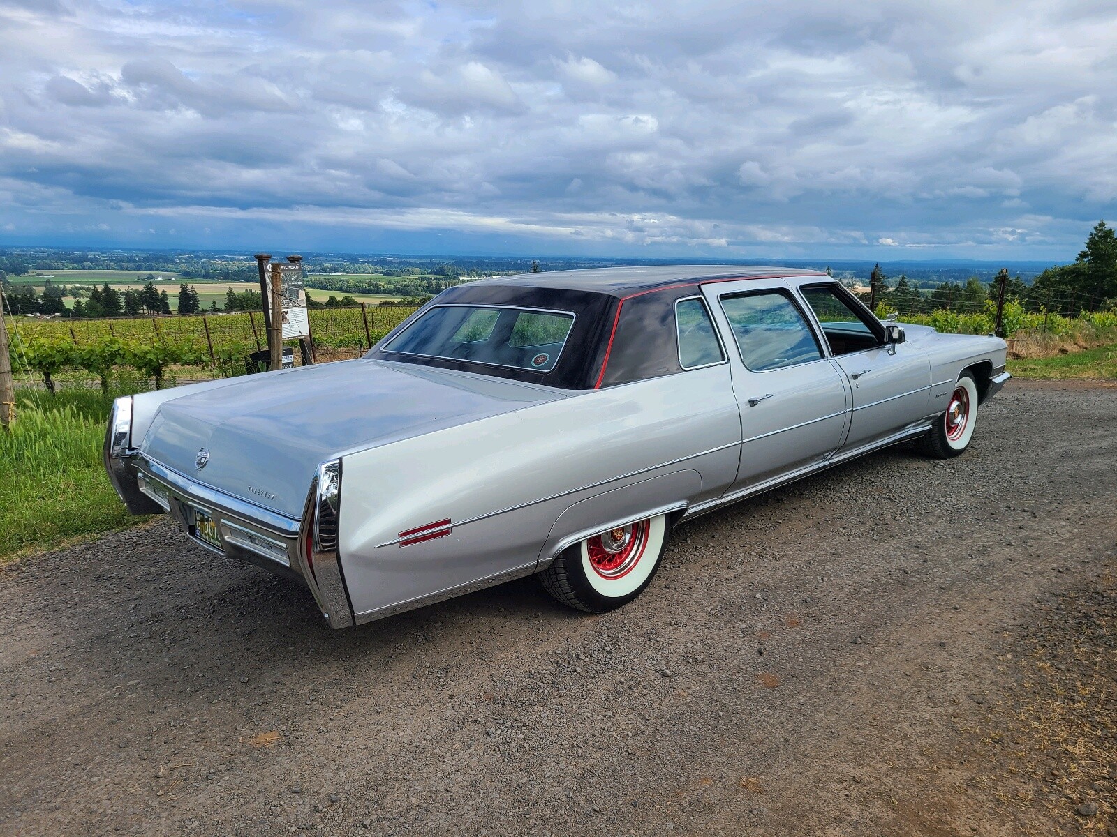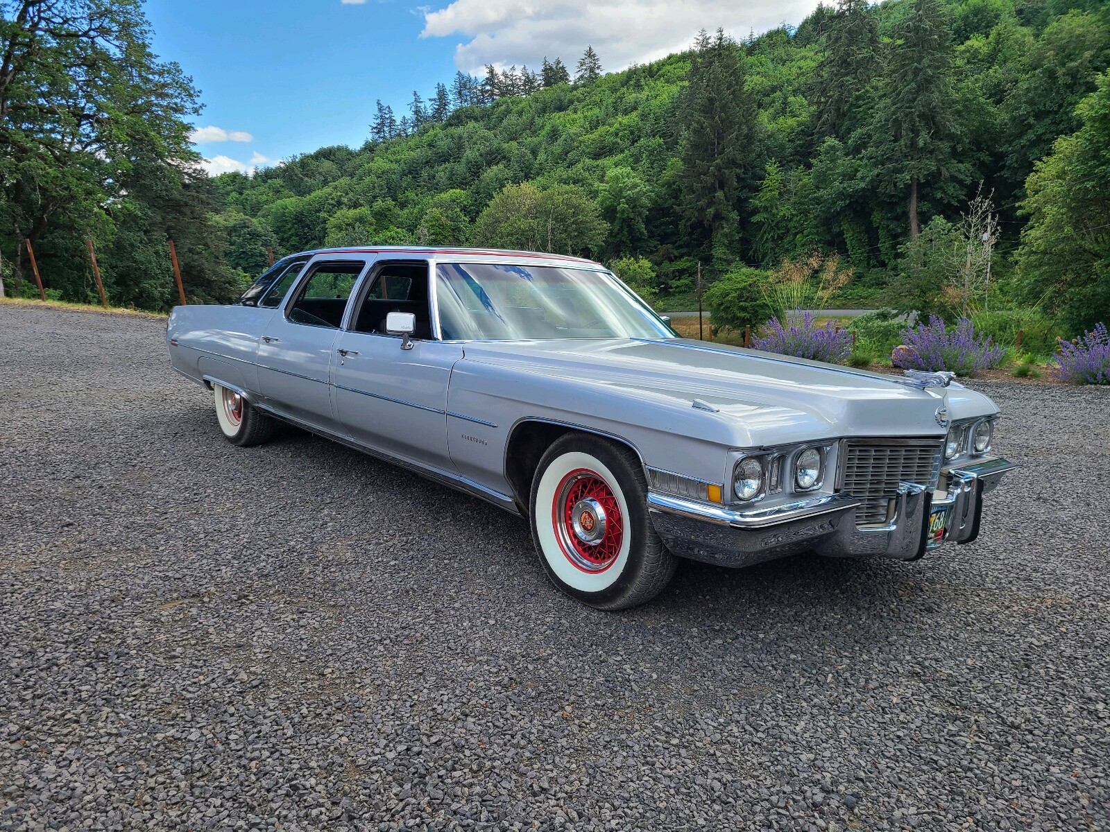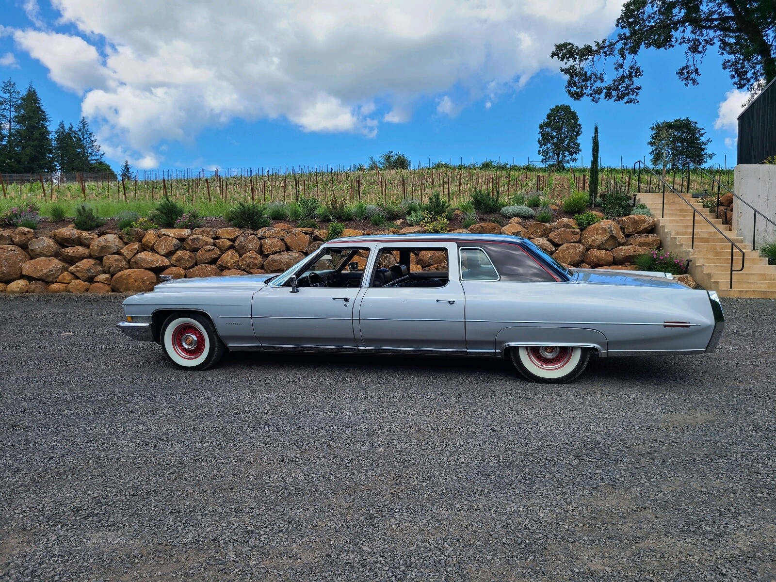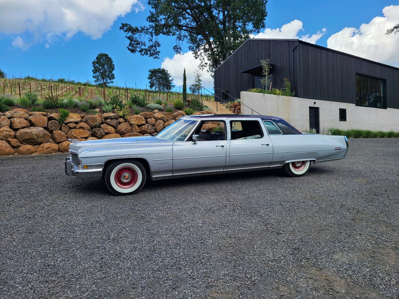 1972 Cadillac Fleetwood Series 75 factory limo. Interior is in great shape and is all original. Runs and drives well. New steering gear box, power steering pressure hose, radiator, fuel pump, rubber fuel lines, spark plugs, spark plug wires, distributor cap and rotor, exhaust manifold gaskets, alternator, and fresh oil change. Still has some exhaust leaks that need to be addressed. Tires are in good shape. A/C probably needs a recharge but it's been converted to R-134. Custom oil pressure, alternator, and temperature gauges mounted under dash. Radio does not work. I've driven it to work many times which is a 35 mile drive one way and it drives beautifully each time. Paint is not perfect, was originally black before being painted silver. Vinyl top was deleted and roof was painted black. Silver paint has some chips in it and minor scratches but nothing major. I was planning on using this car to host wine tours in but I don't enjoy working on older cars like I used to and can't afford for a mechanic shop to maintain it. The wine tour decals on the roof will be removed before sale.