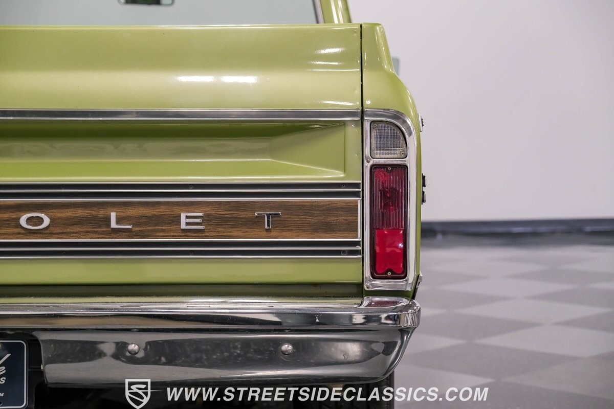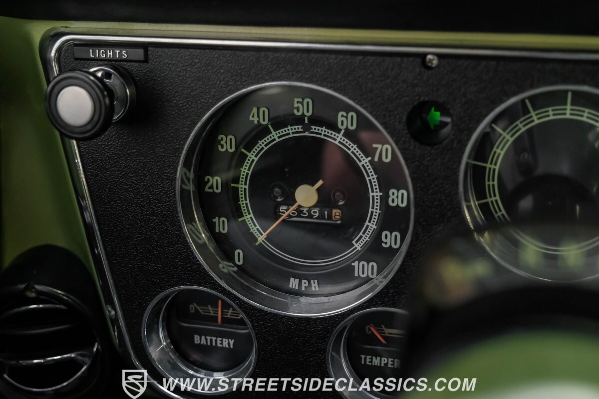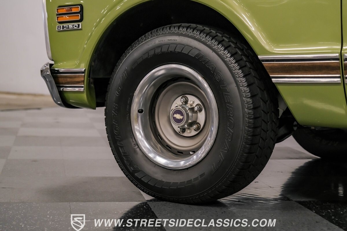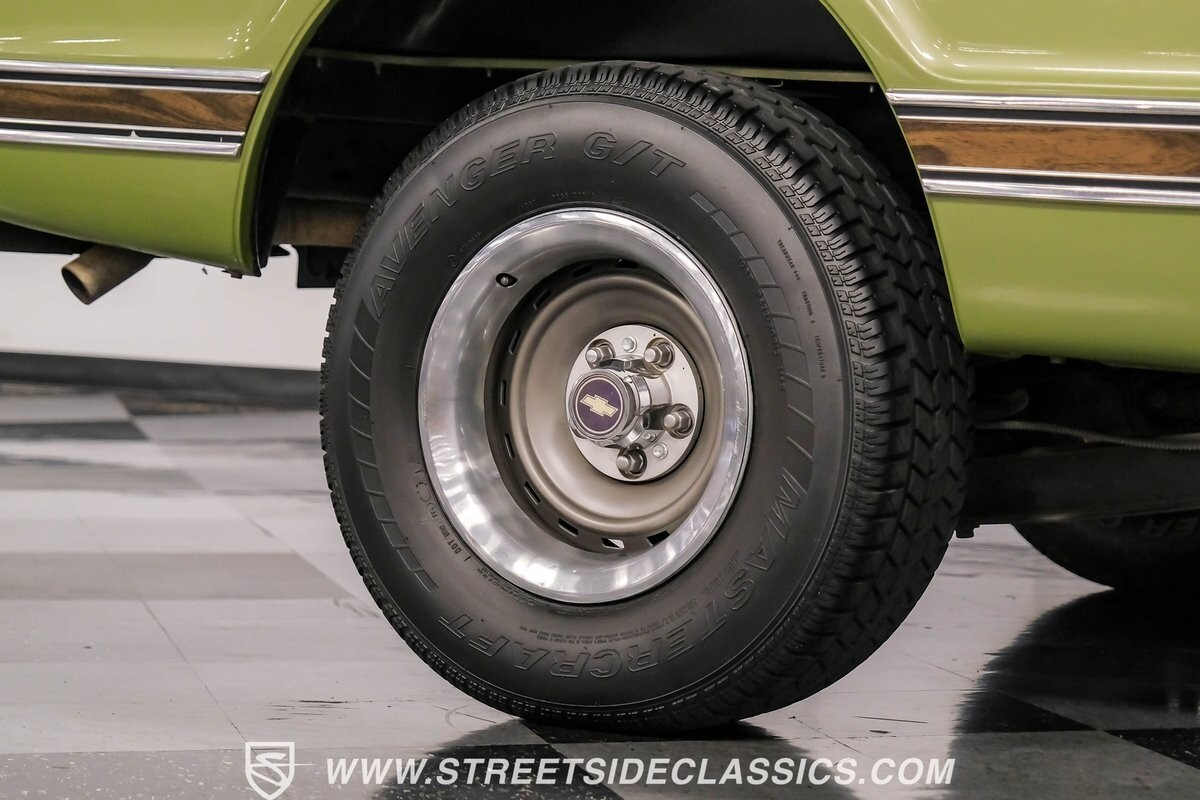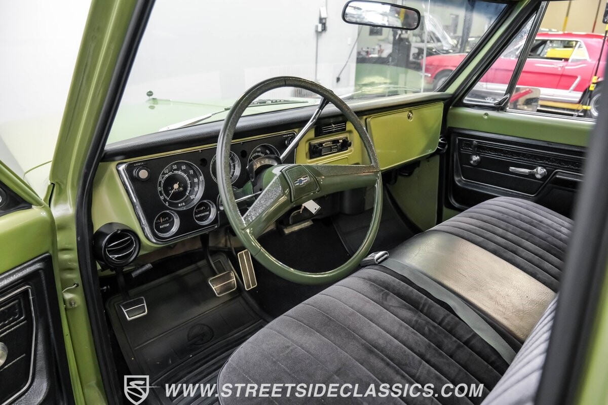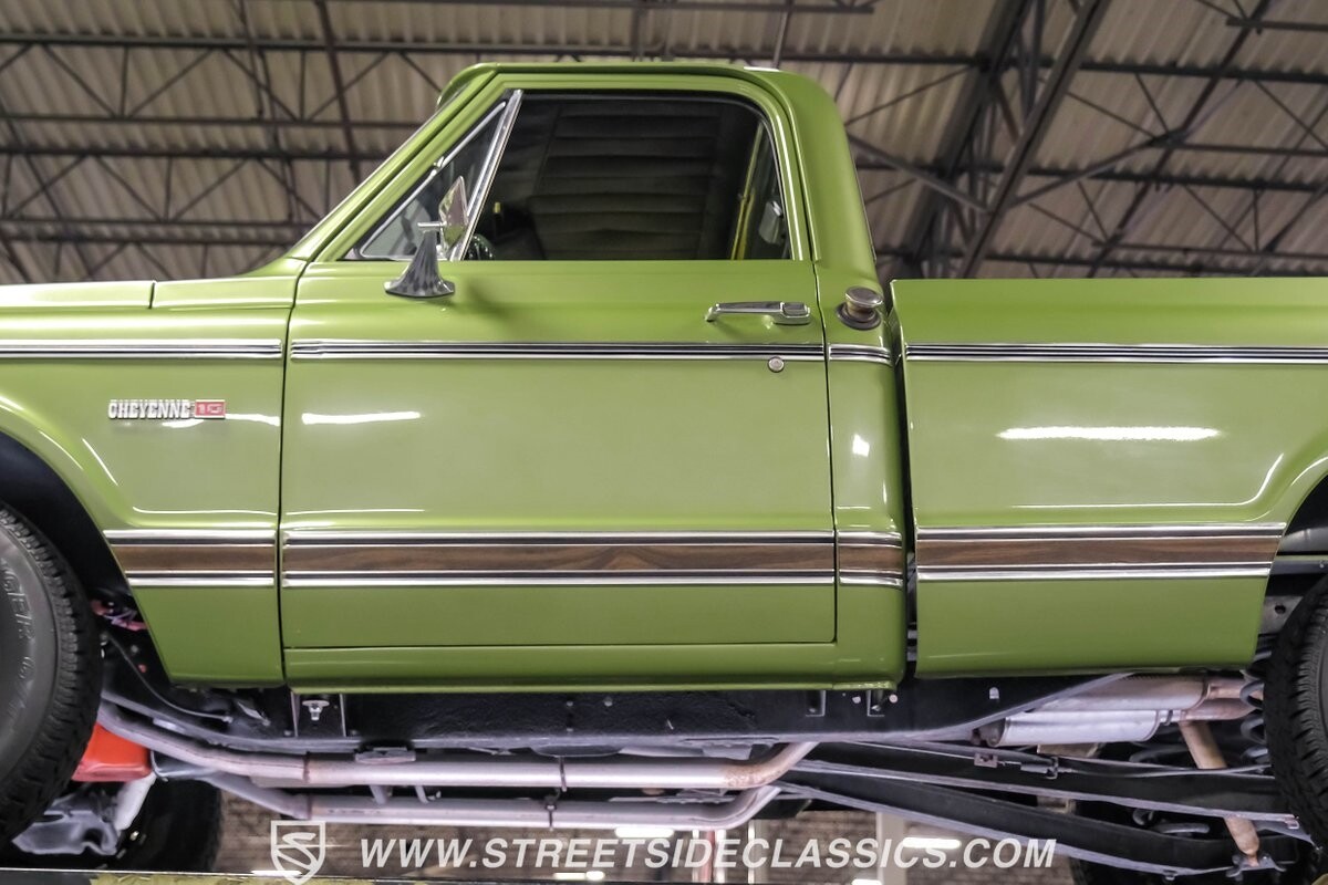 This 1972 Chevrolet C10 Cheyenne, drenched in a stunning Medium Olive paint, is a true gem that's been meticulously maintained and restored. The metallic flake in the paint catches the light just right, giving this classic truck an undeniable presence on the road. The straight body lines and newer-looking side trim, complete with wood grain stickers, add to its visual appeal. Riding on a set of 15" stock Chevy rims wrapped in 255/70R15 tires, this C10 has a stance that's both confident and capable. The front grille and the newer hood ornament tie the look together perfectly.