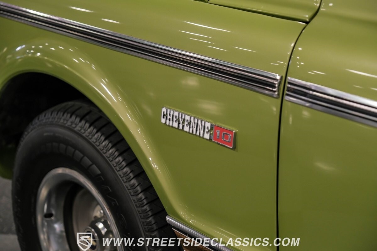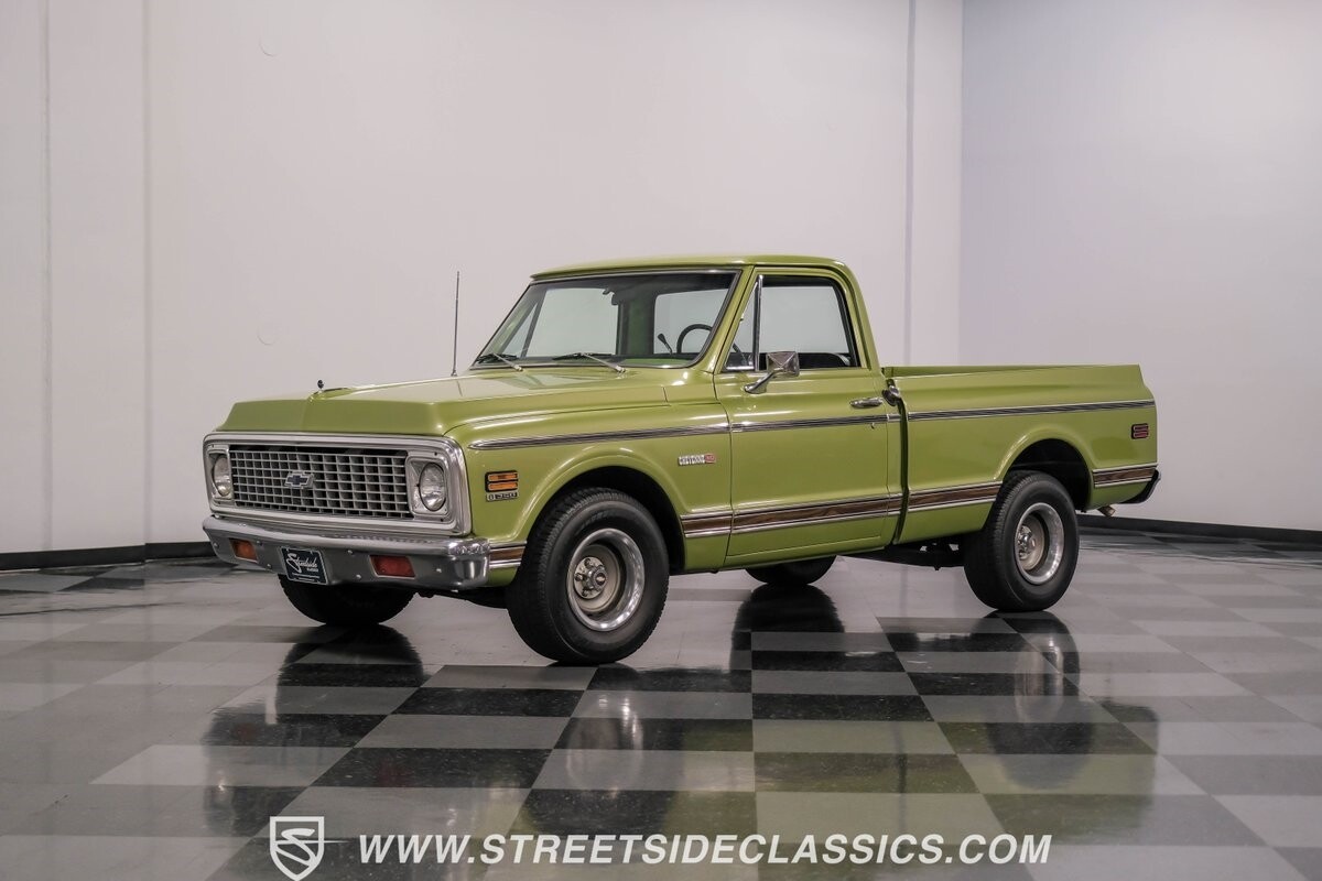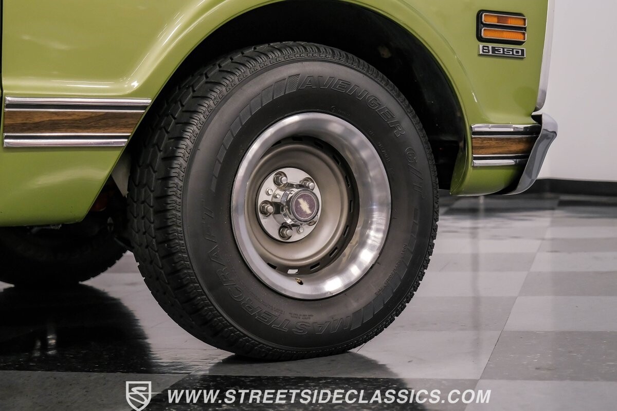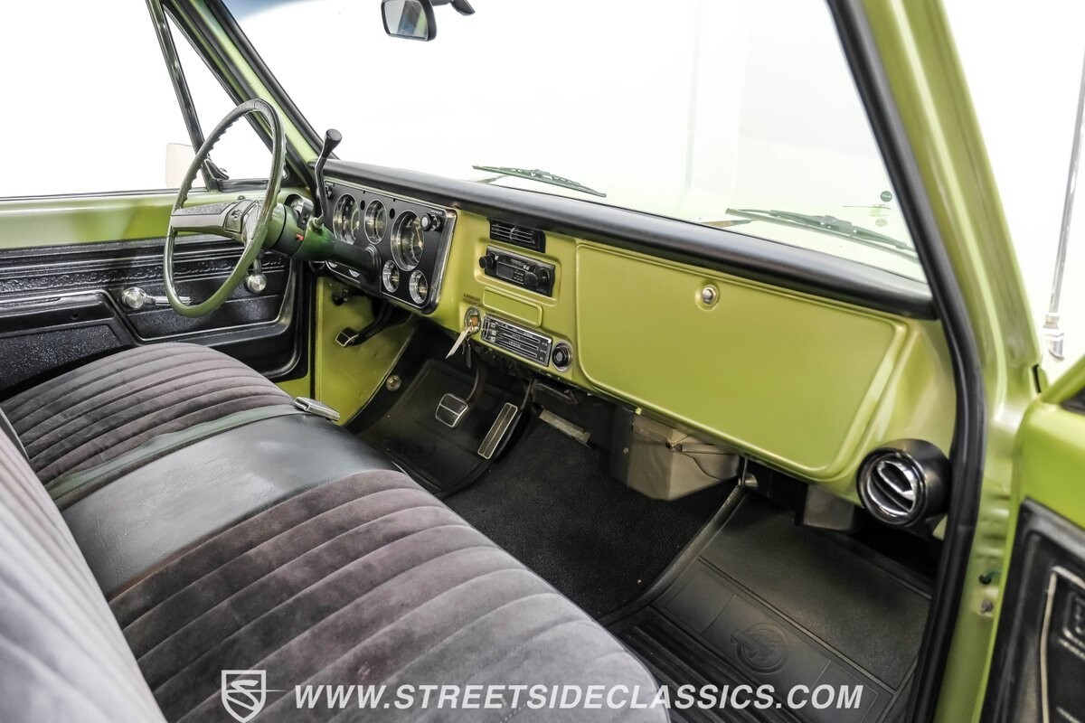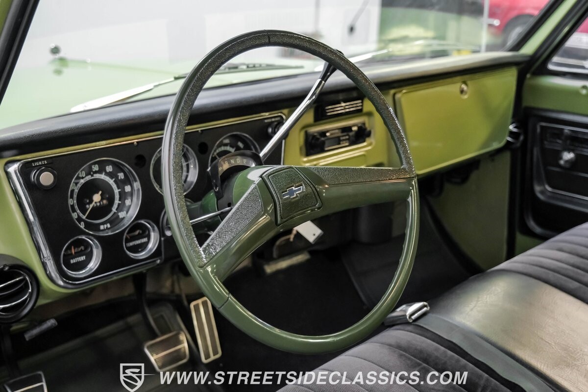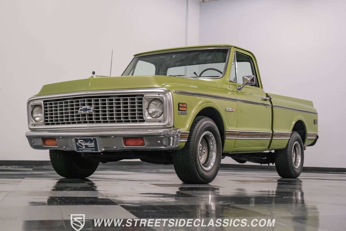This 1972 Chevrolet C10 Cheyenne, drenched in a stunning Medium Olive paint, is a true gem that's been meticulously maintained and restored. The metallic flake in the paint catches the light just right, giving this classic truck an undeniable presence on the road. The straight body lines and newer-looking side trim, complete with wood grain stickers, add to its visual appeal. Riding on a set of 15" stock Chevy rims wrapped in 255/70R15 tires, this C10 has a stance that's both confident and capable. The front grille and the newer hood ornament tie the look together perfectly.