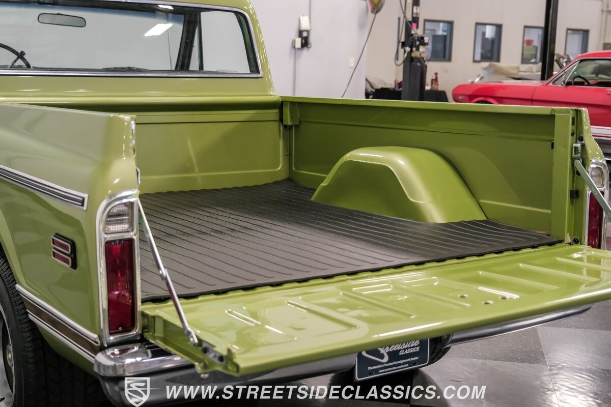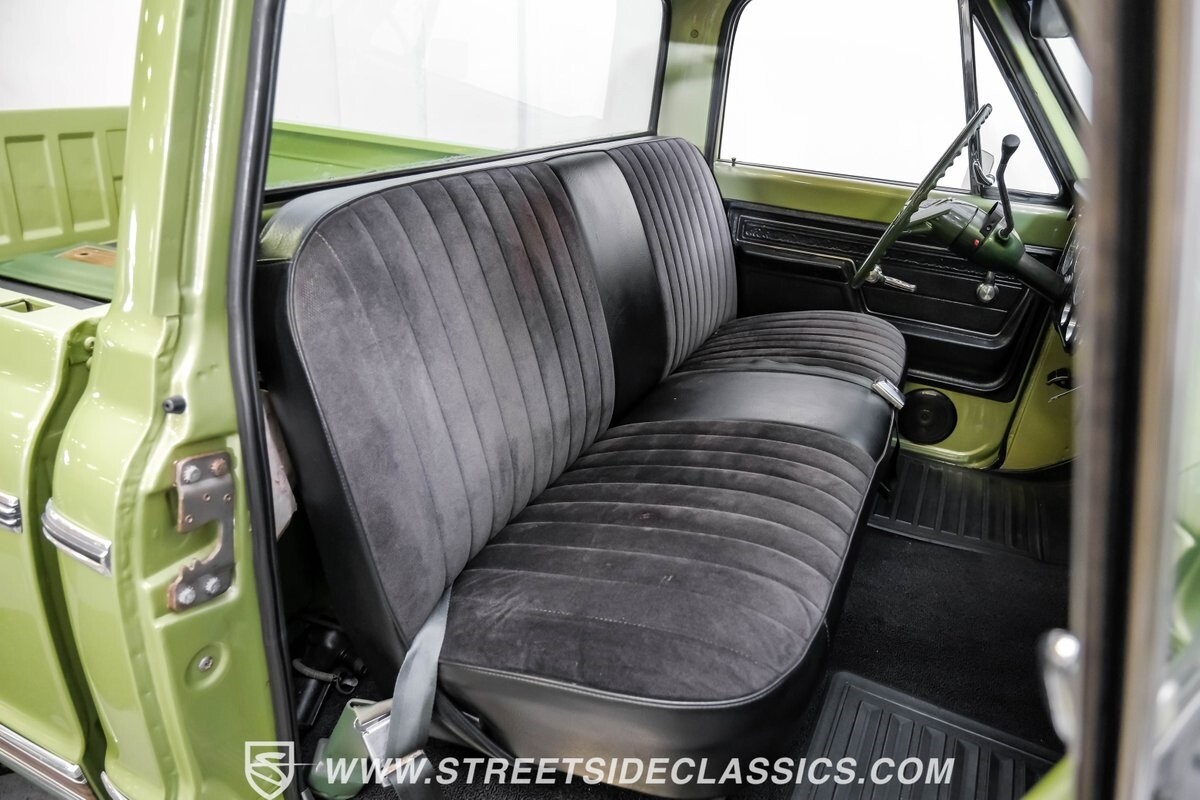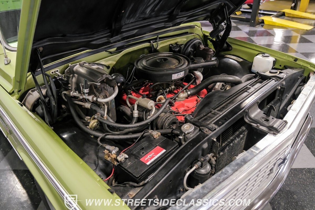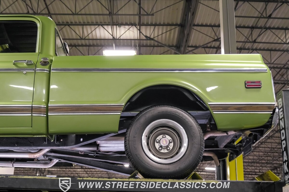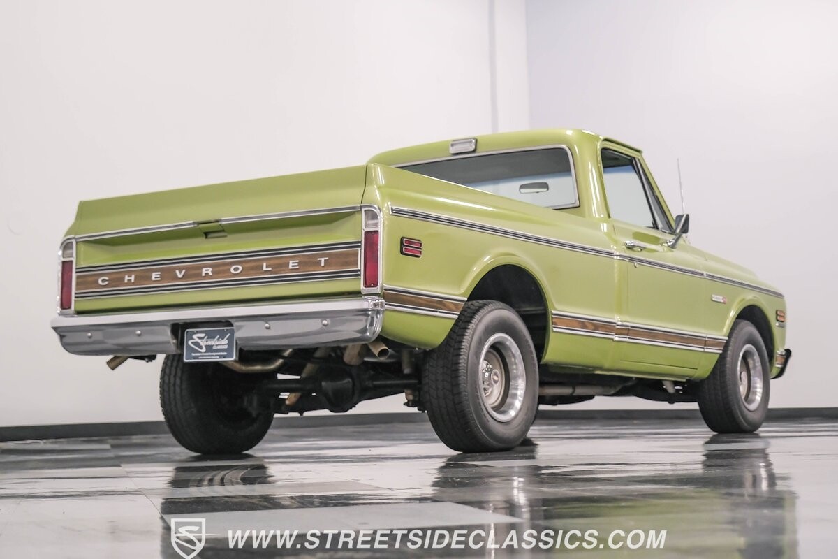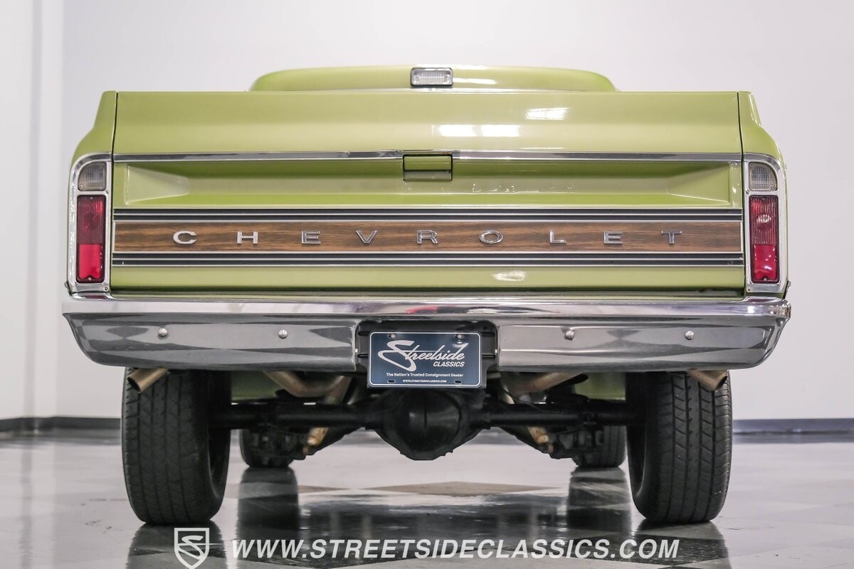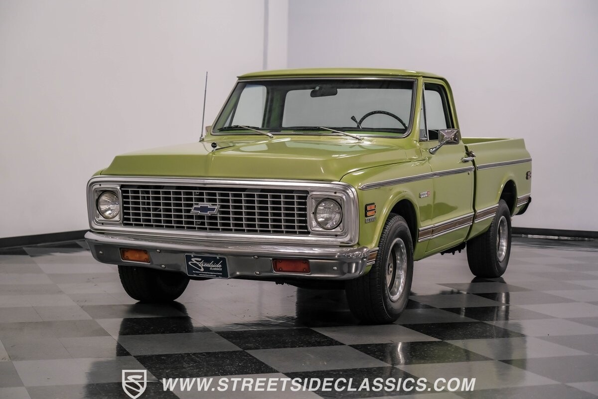 This 1972 Chevrolet C10 Cheyenne, drenched in a stunning Medium Olive paint, is a true gem that's been meticulously maintained and restored. The metallic flake in the paint catches the light just right, giving this classic truck an undeniable presence on the road. The straight body lines and newer-looking side trim, complete with wood grain stickers, add to its visual appeal. Riding on a set of 15" stock Chevy rims wrapped in 255/70R15 tires, this C10 has a stance that's both confident and capable. The front grille and the newer hood ornament tie the look together perfectly.