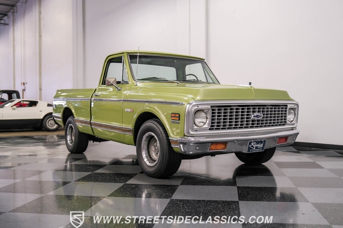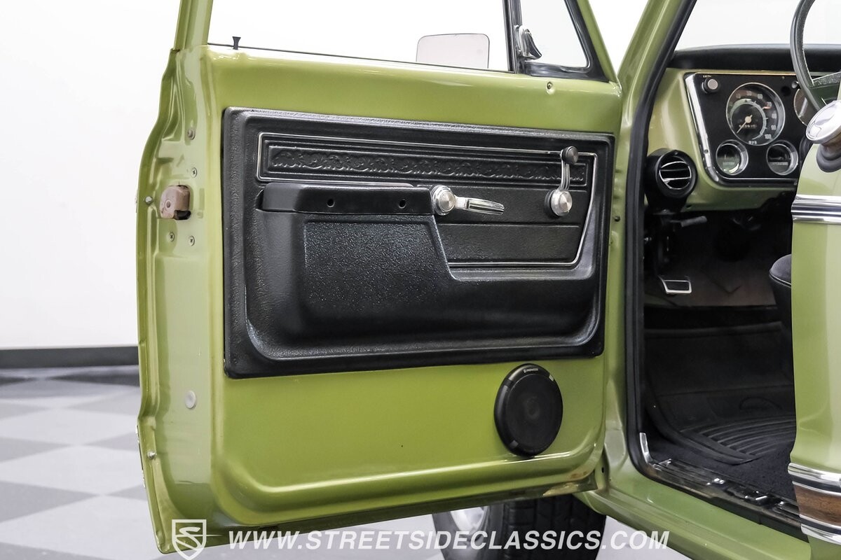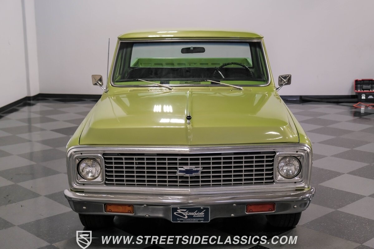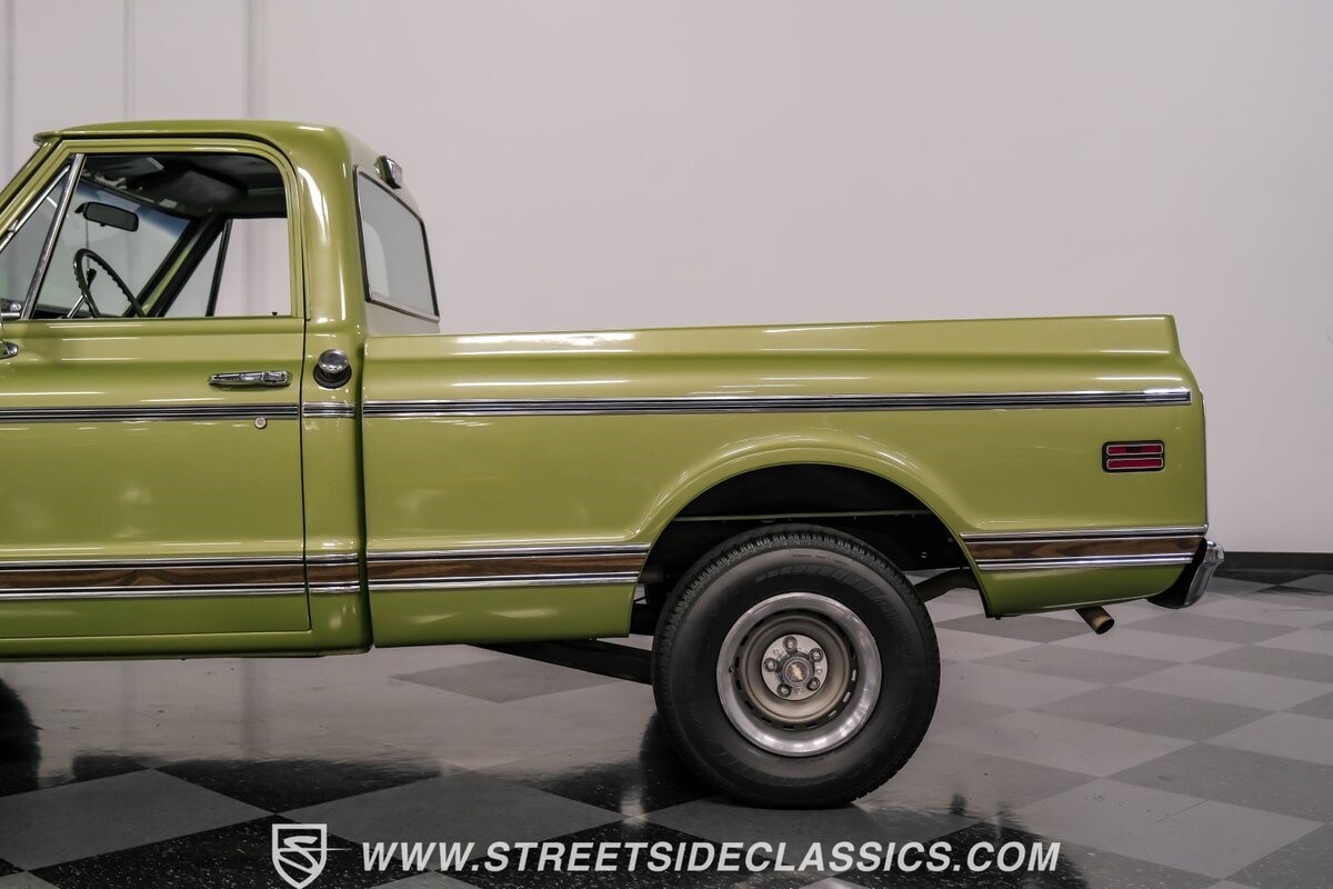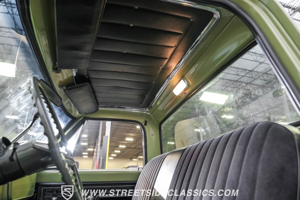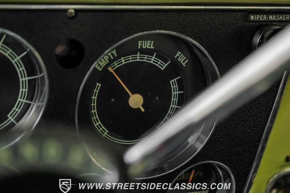 This 1972 Chevrolet C10 Cheyenne, drenched in a stunning Medium Olive paint, is a true gem that's been meticulously maintained and restored. The metallic flake in the paint catches the light just right, giving this classic truck an undeniable presence on the road. The straight body lines and newer-looking side trim, complete with wood grain stickers, add to its visual appeal. Riding on a set of 15" stock Chevy rims wrapped in 255/70R15 tires, this C10 has a stance that's both confident and capable. The front grille and the newer hood ornament tie the look together perfectly.