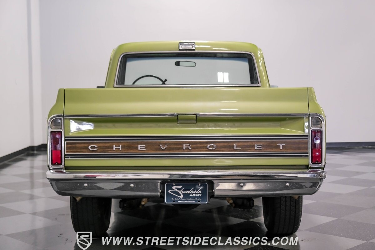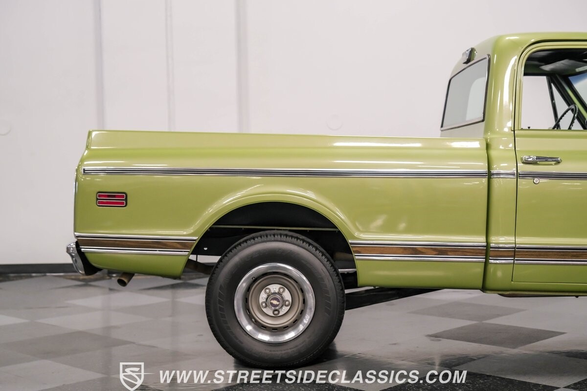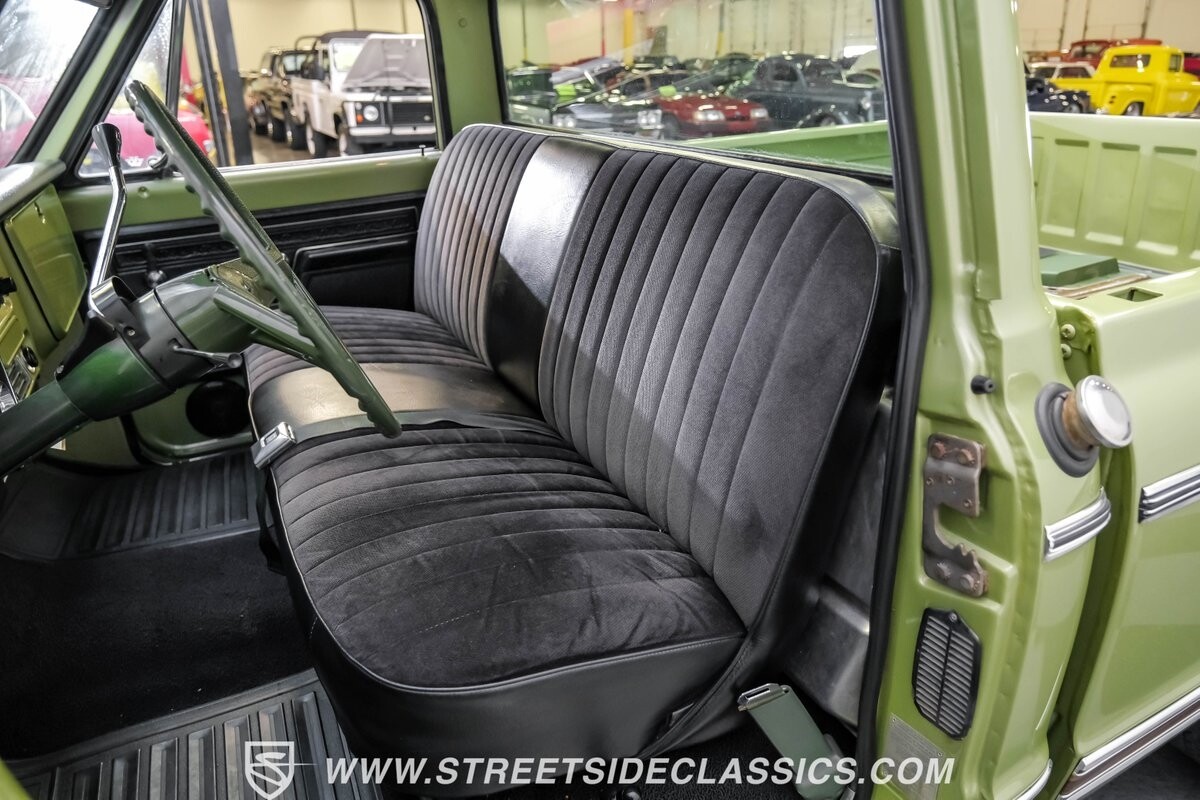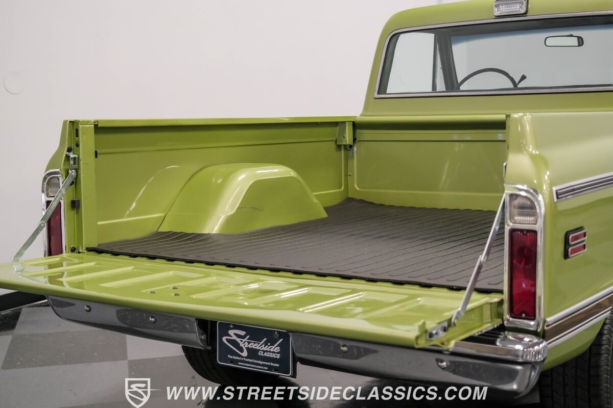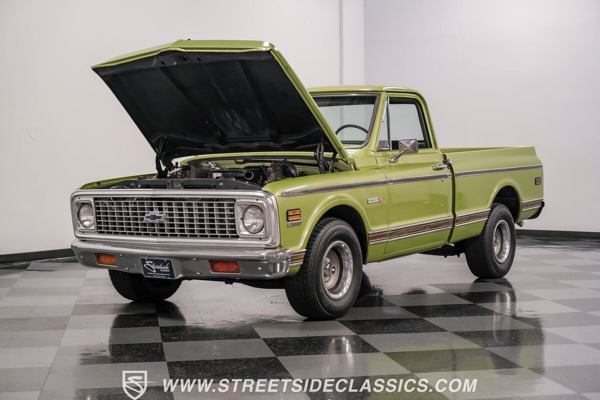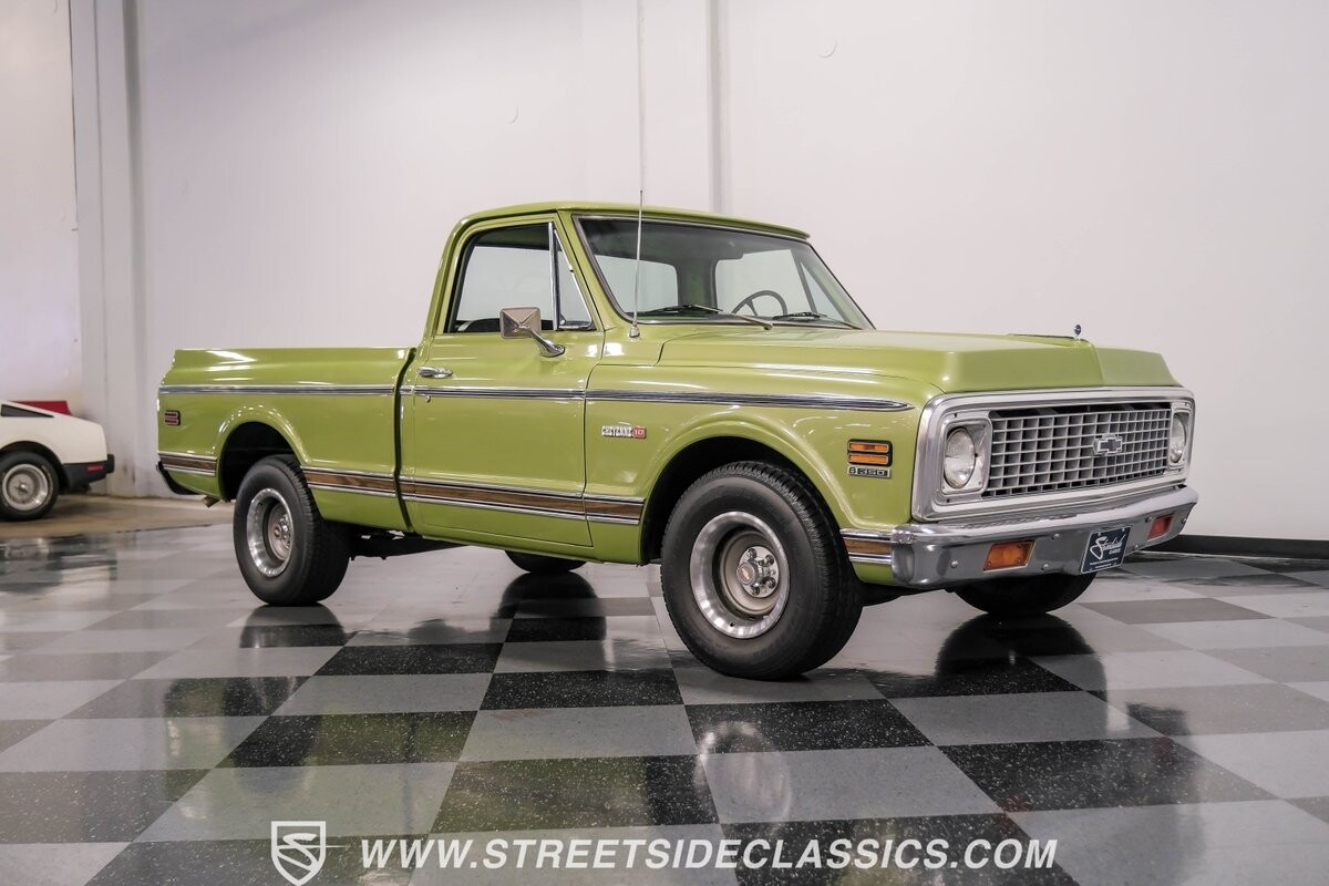 This 1972 Chevrolet C10 Cheyenne, drenched in a stunning Medium Olive paint, is a true gem that's been meticulously maintained and restored. The metallic flake in the paint catches the light just right, giving this classic truck an undeniable presence on the road. The straight body lines and newer-looking side trim, complete with wood grain stickers, add to its visual appeal. Riding on a set of 15" stock Chevy rims wrapped in 255/70R15 tires, this C10 has a stance that's both confident and capable. The front grille and the newer hood ornament tie the look together perfectly.