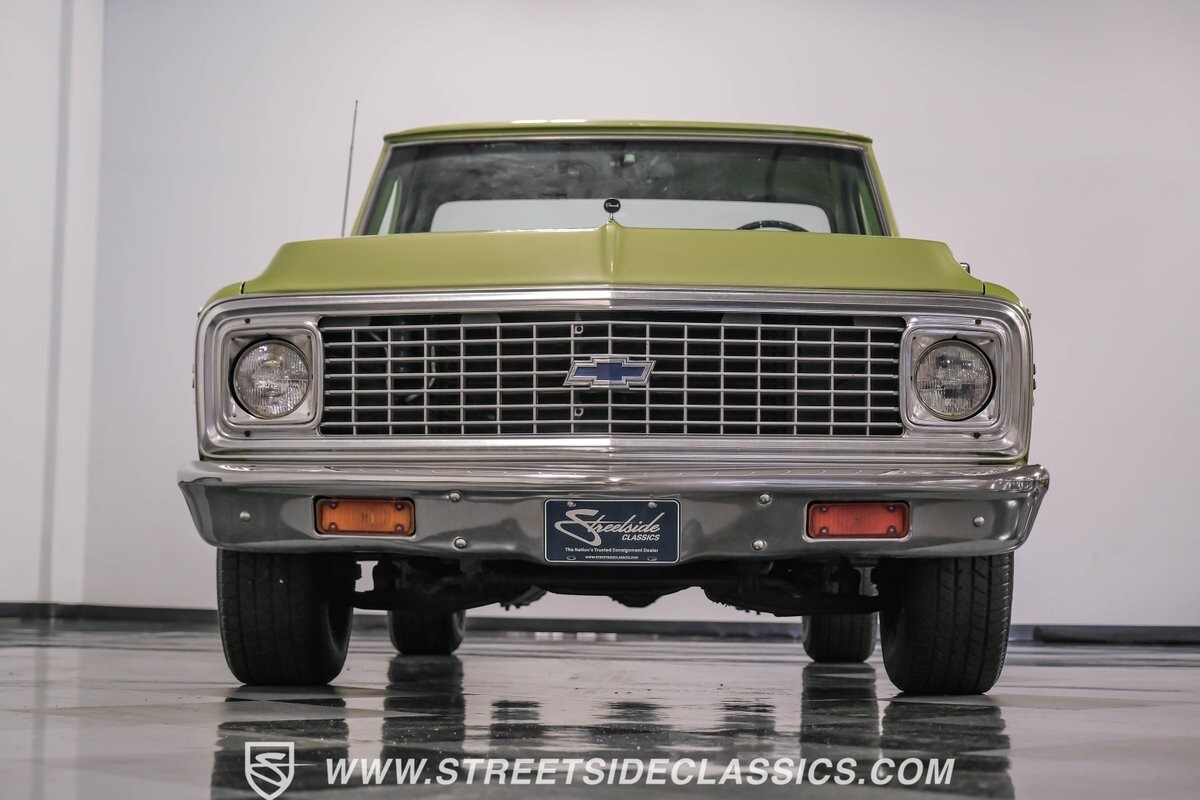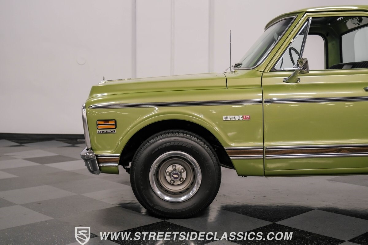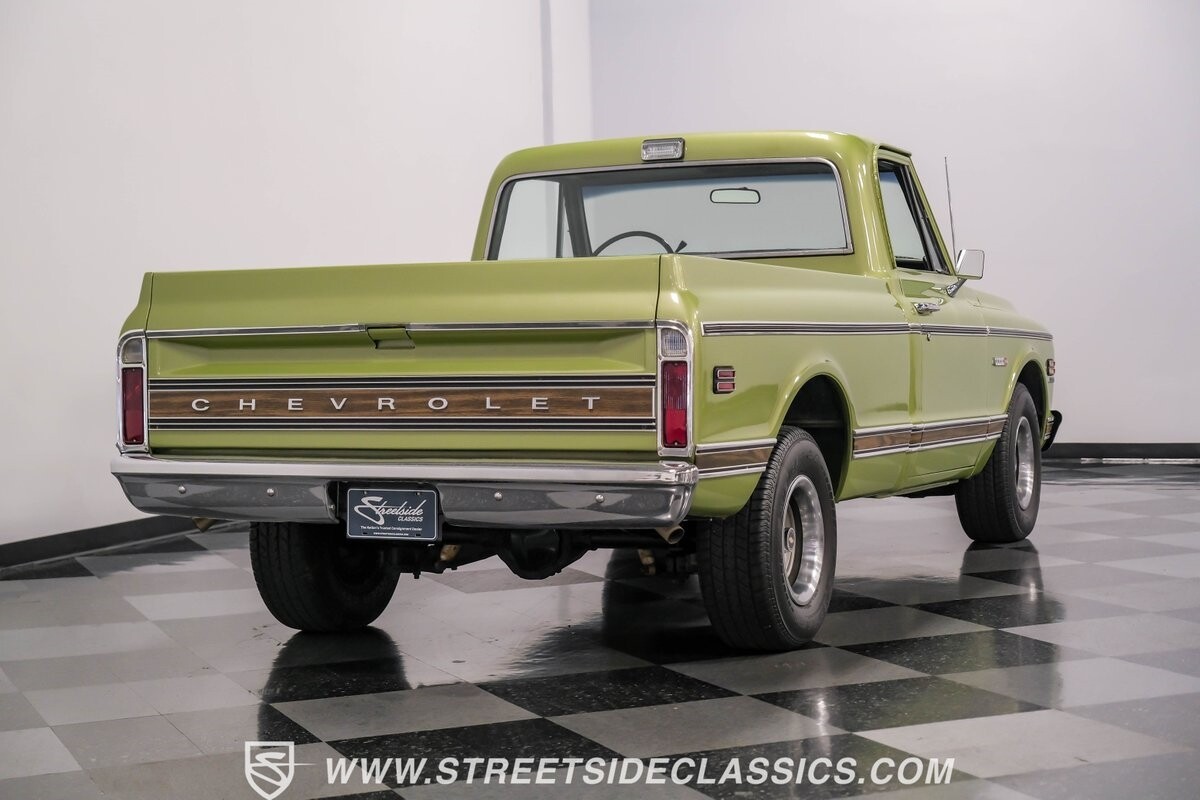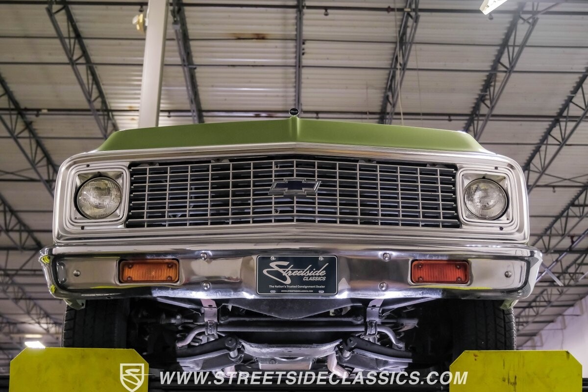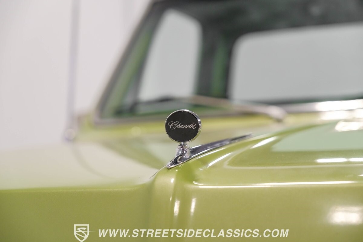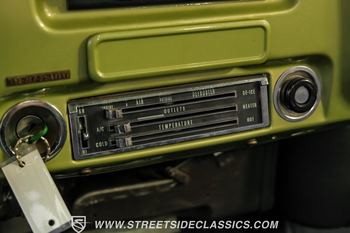 This 1972 Chevrolet C10 Cheyenne, drenched in a stunning Medium Olive paint, is a true gem that's been meticulously maintained and restored. The metallic flake in the paint catches the light just right, giving this classic truck an undeniable presence on the road. The straight body lines and newer-looking side trim, complete with wood grain stickers, add to its visual appeal. Riding on a set of 15" stock Chevy rims wrapped in 255/70R15 tires, this C10 has a stance that's both confident and capable. The front grille and the newer hood ornament tie the look together perfectly.