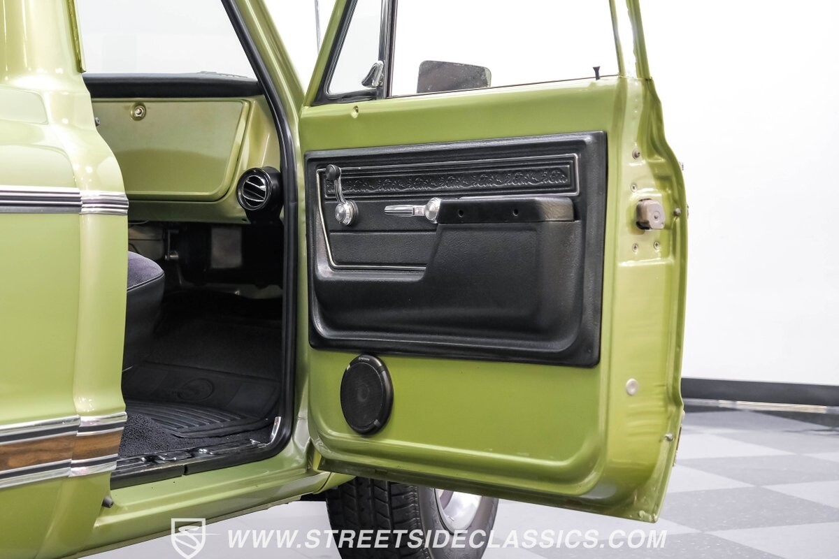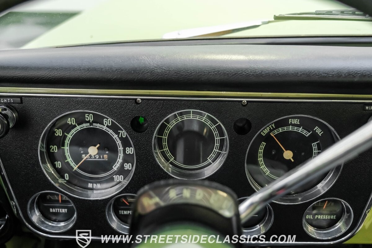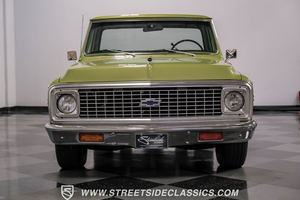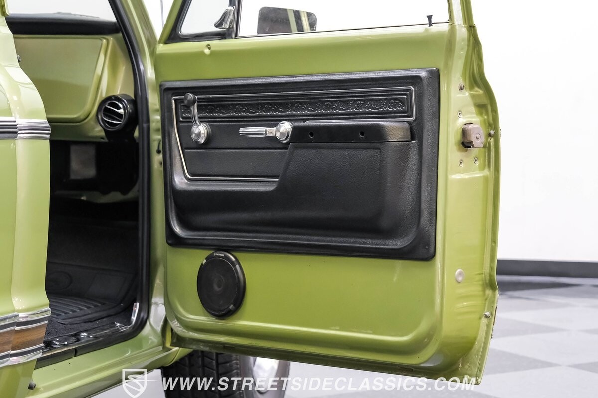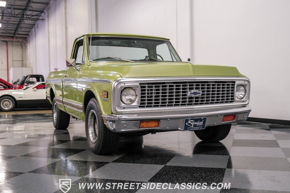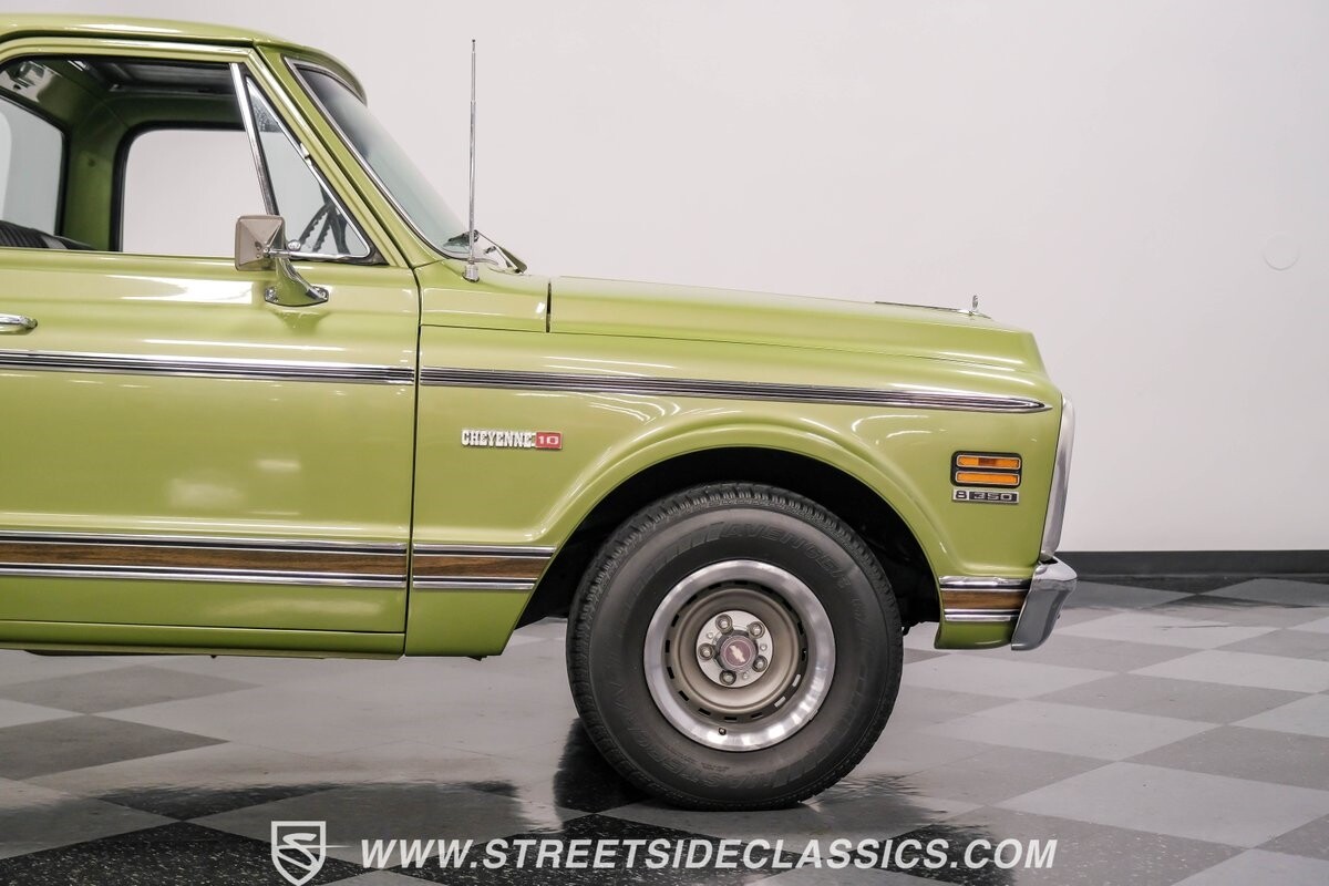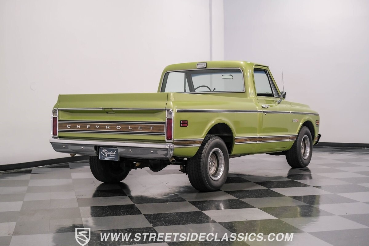This 1972 Chevrolet C10 Cheyenne, drenched in a stunning Medium Olive paint, is a true gem that's been meticulously maintained and restored. The metallic flake in the paint catches the light just right, giving this classic truck an undeniable presence on the road. The straight body lines and newer-looking side trim, complete with wood grain stickers, add to its visual appeal. Riding on a set of 15" stock Chevy rims wrapped in 255/70R15 tires, this C10 has a stance that's both confident and capable. The front grille and the newer hood ornament tie the look together perfectly.
