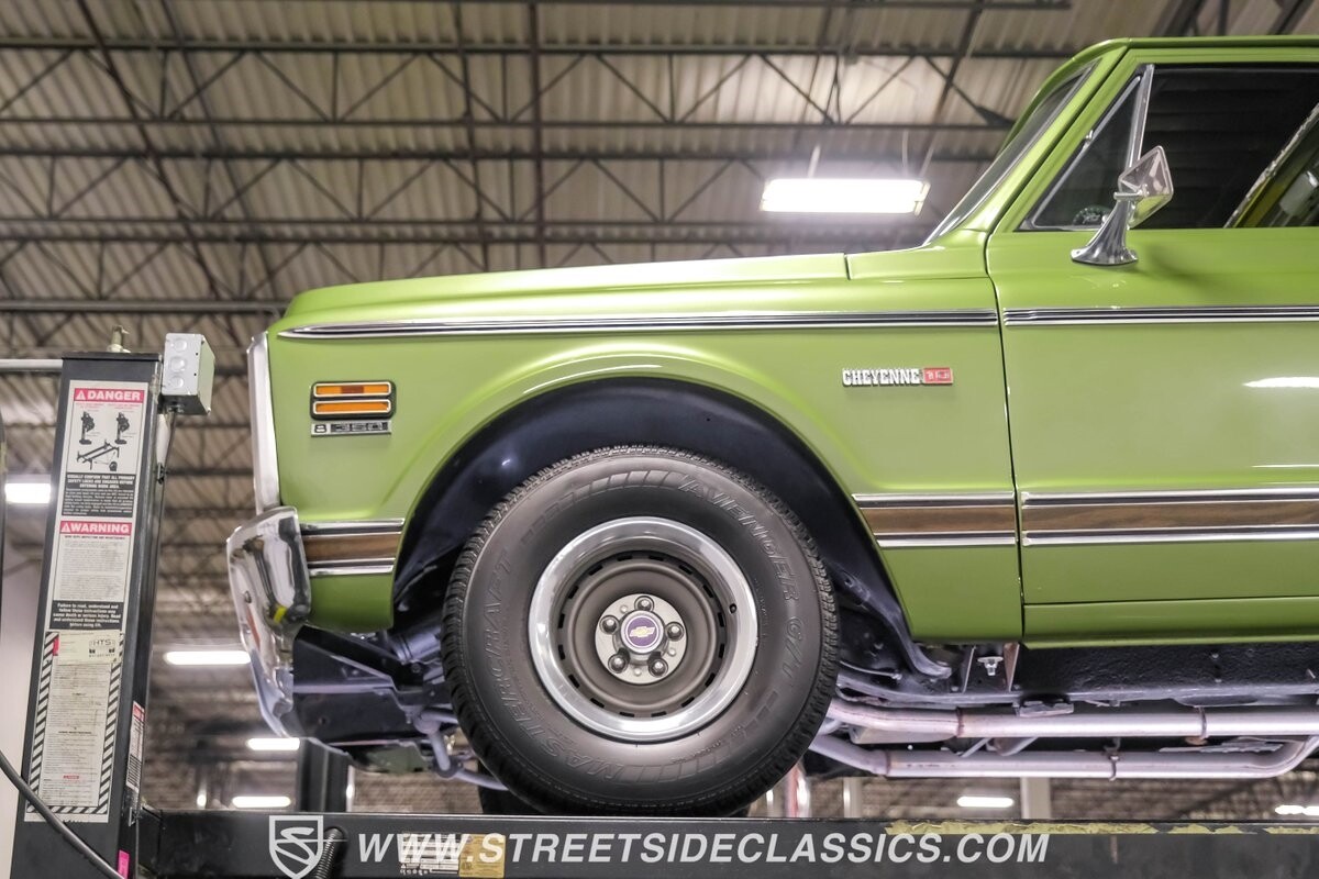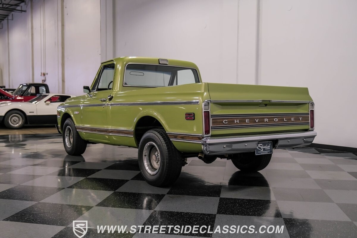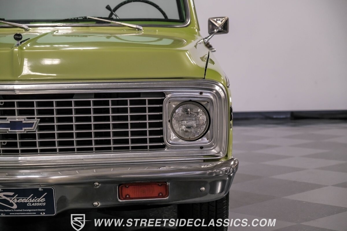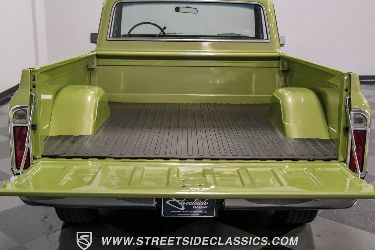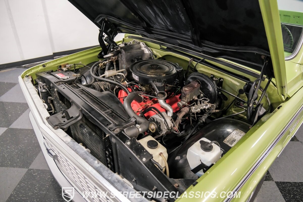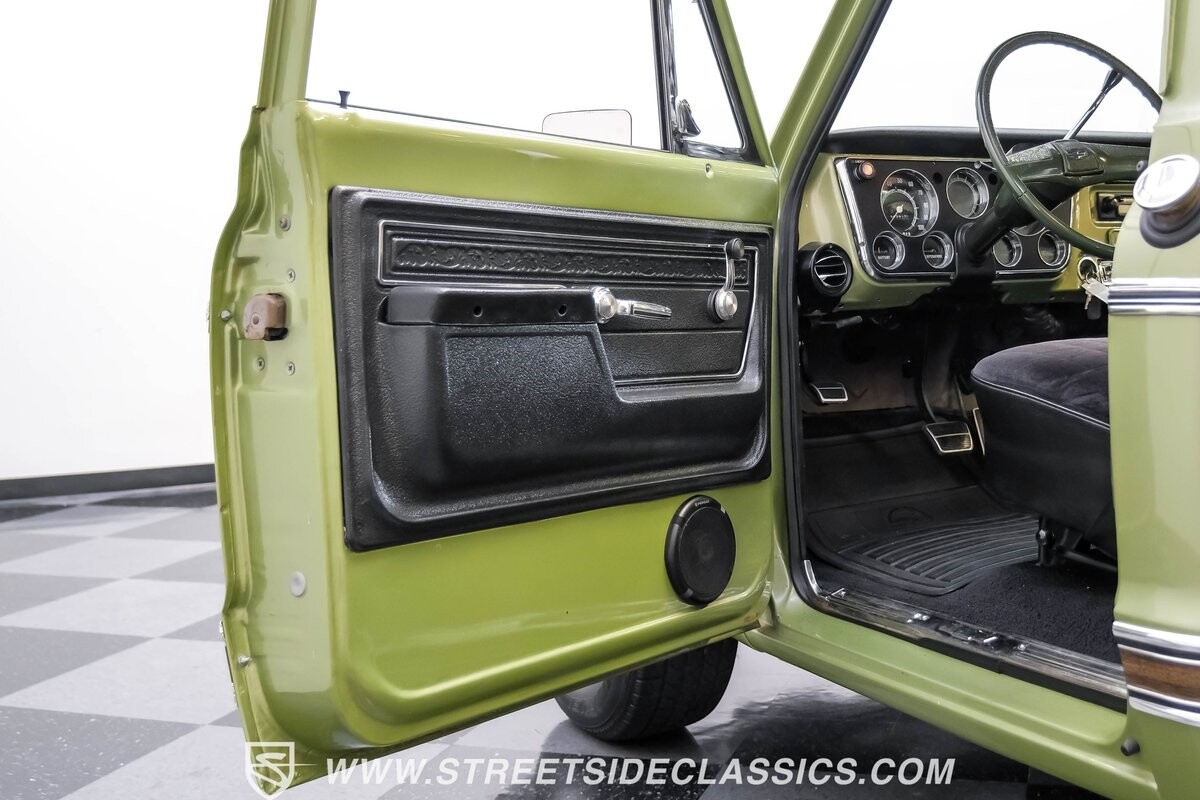This 1972 Chevrolet C10 Cheyenne, drenched in a stunning Medium Olive paint, is a true gem that's been meticulously maintained and restored. The metallic flake in the paint catches the light just right, giving this classic truck an undeniable presence on the road. The straight body lines and newer-looking side trim, complete with wood grain stickers, add to its visual appeal. Riding on a set of 15" stock Chevy rims wrapped in 255/70R15 tires, this C10 has a stance that's both confident and capable. The front grille and the newer hood ornament tie the look together perfectly.