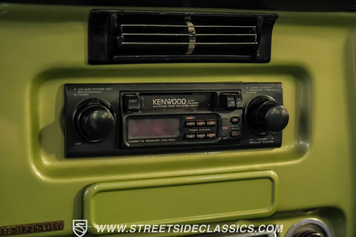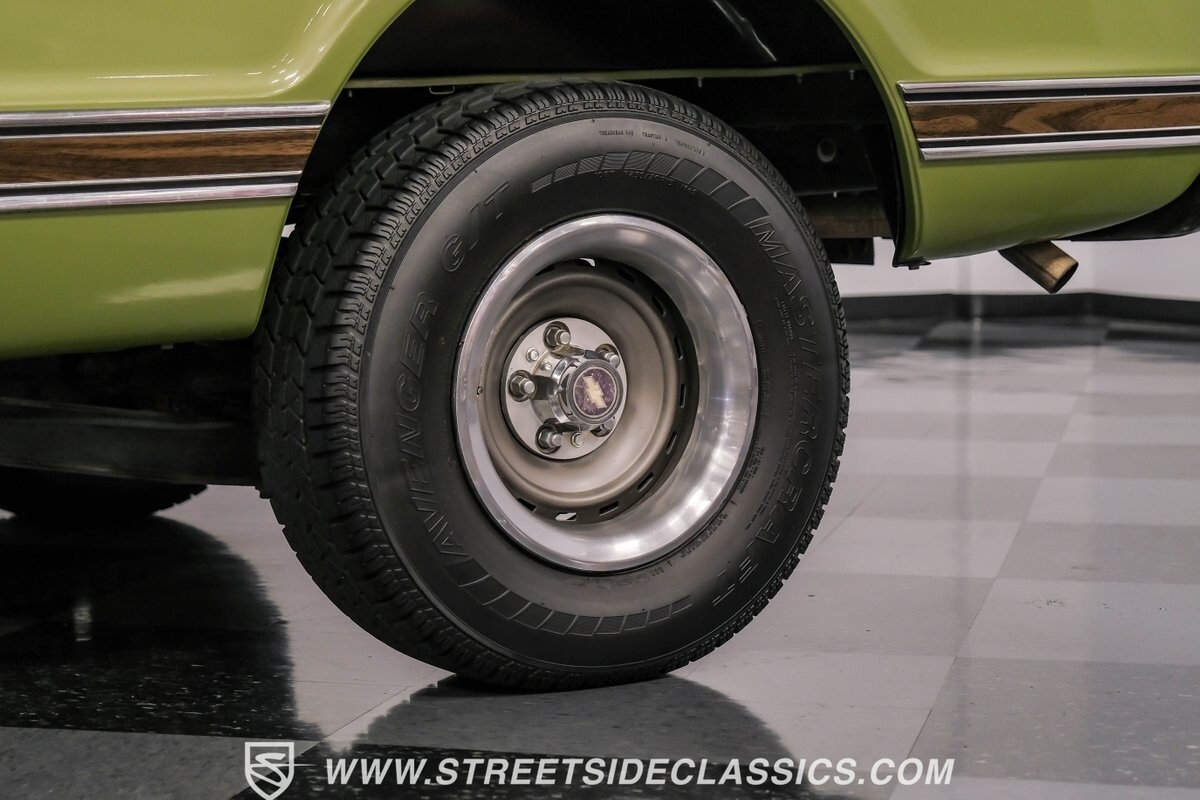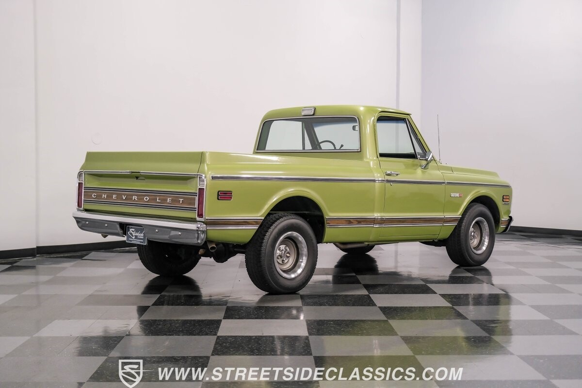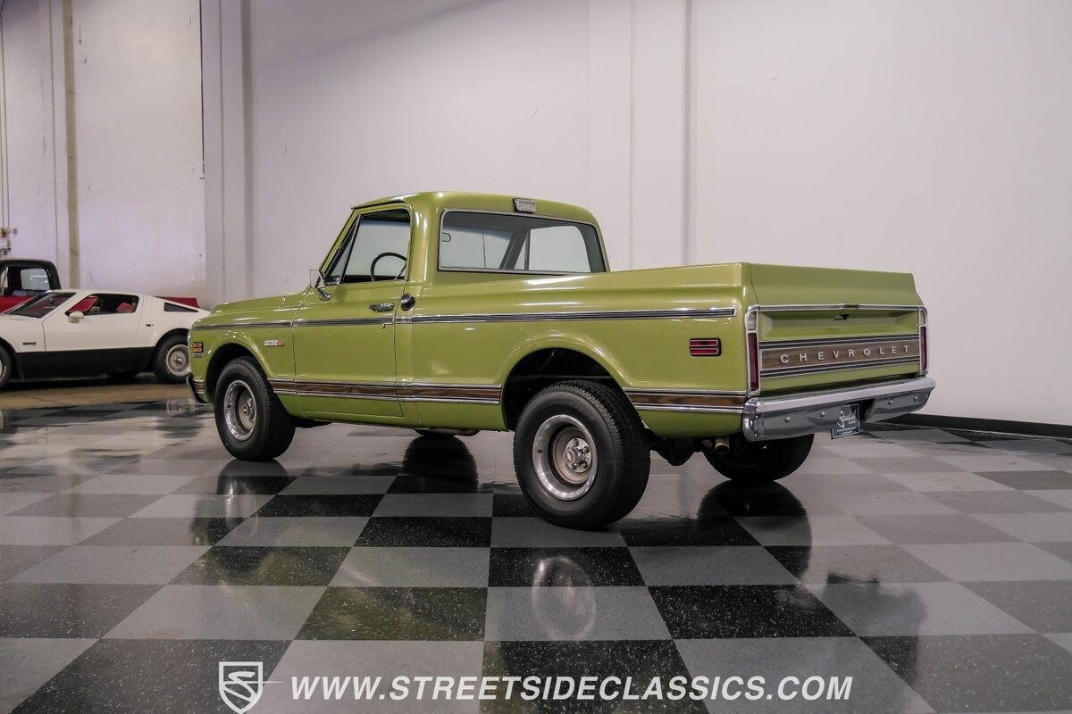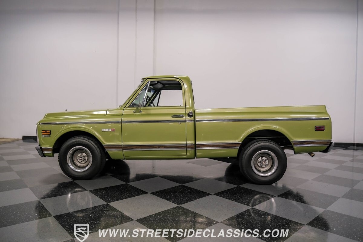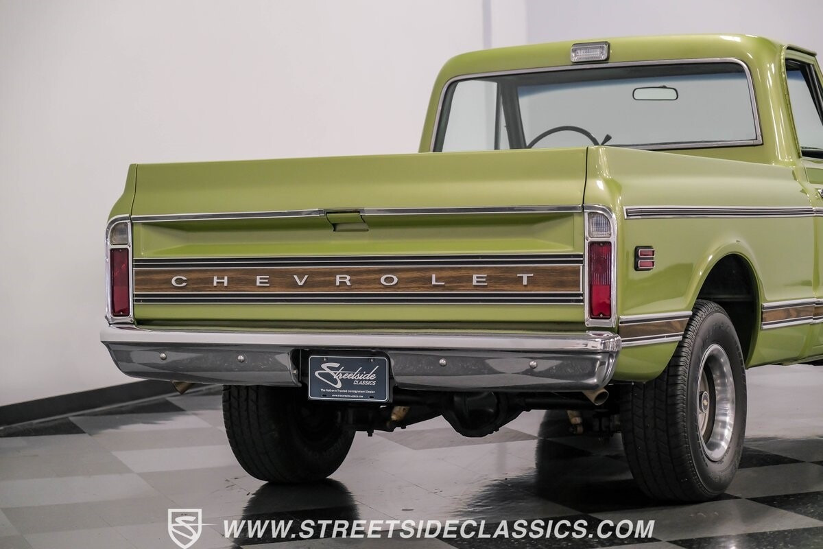This 1972 Chevrolet C10 Cheyenne, drenched in a stunning Medium Olive paint, is a true gem that's been meticulously maintained and restored. The metallic flake in the paint catches the light just right, giving this classic truck an undeniable presence on the road. The straight body lines and newer-looking side trim, complete with wood grain stickers, add to its visual appeal. Riding on a set of 15" stock Chevy rims wrapped in 255/70R15 tires, this C10 has a stance that's both confident and capable. The front grille and the newer hood ornament tie the look together perfectly.