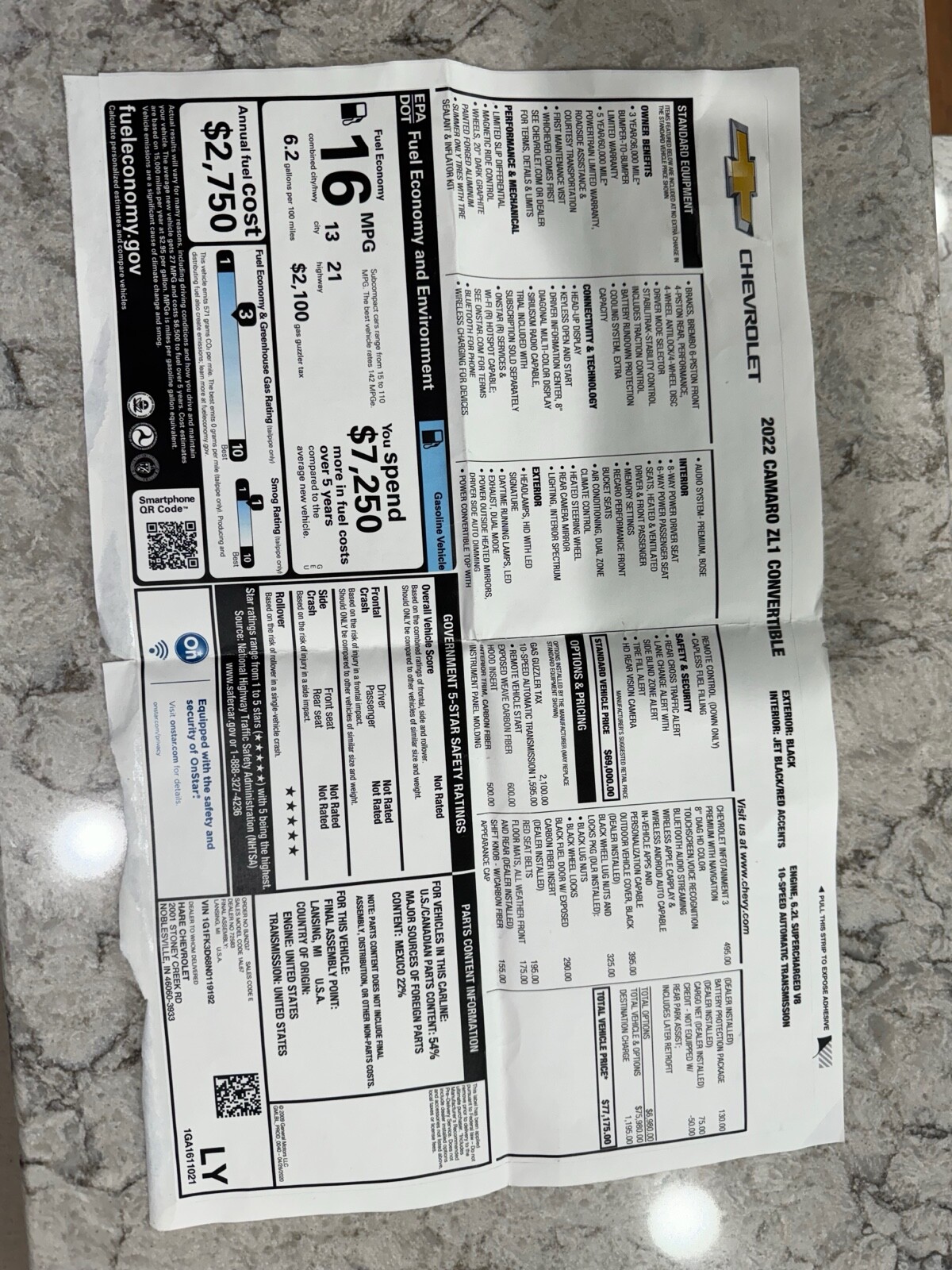Immaculate condition. Heated & ventilated seats, heads up display, car cover, and every option available for ZL1 convertible in 2022.