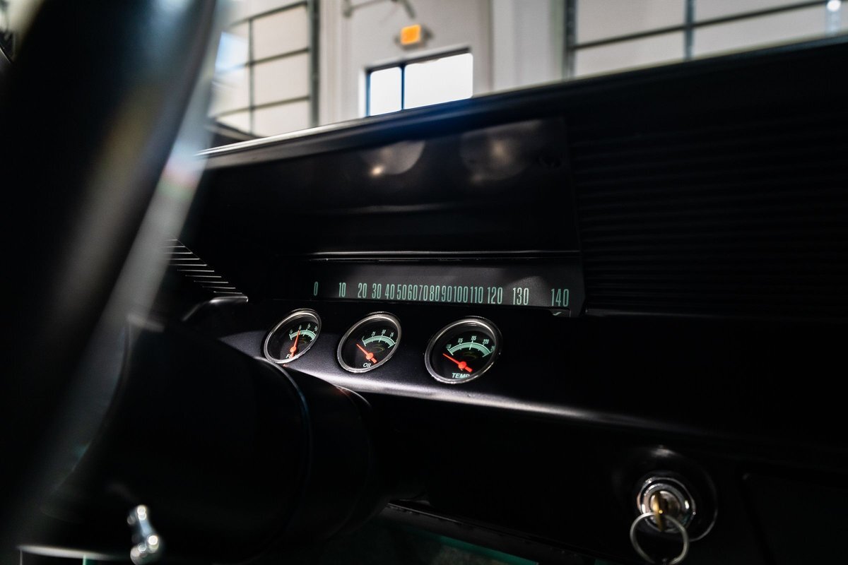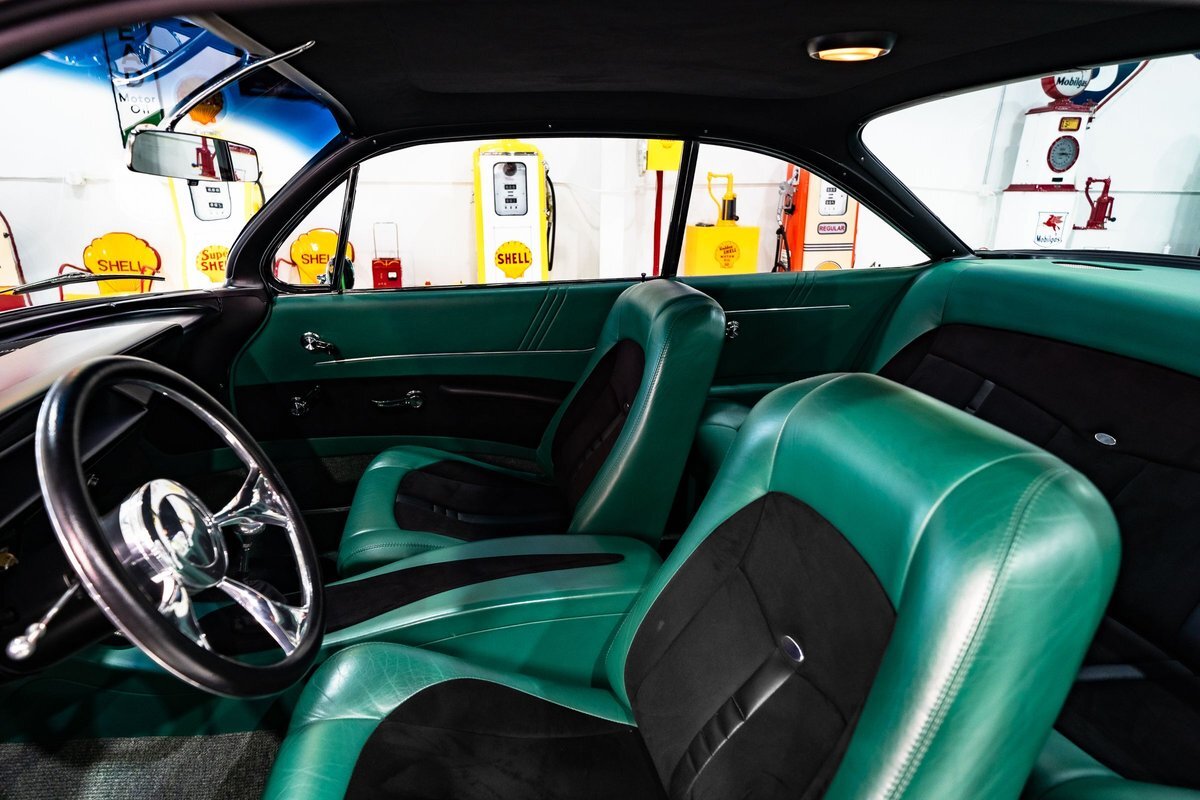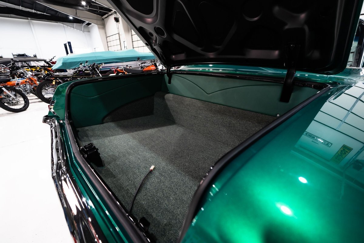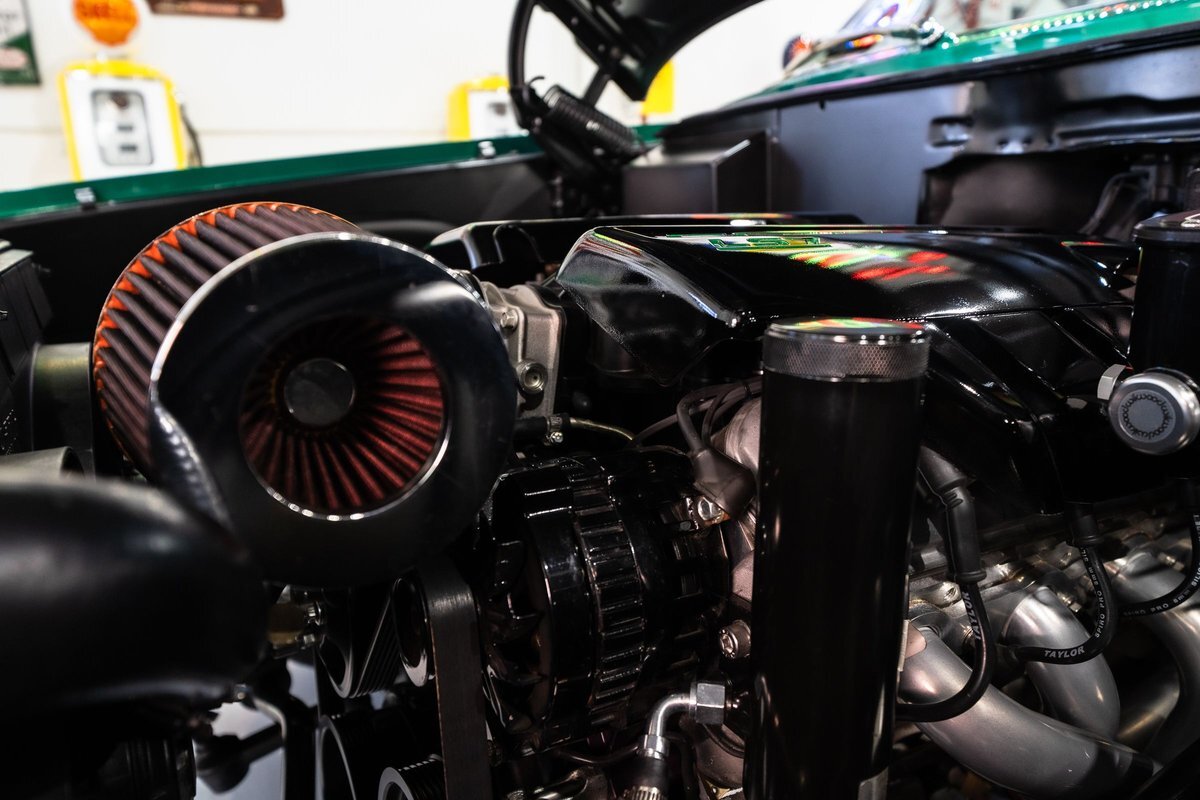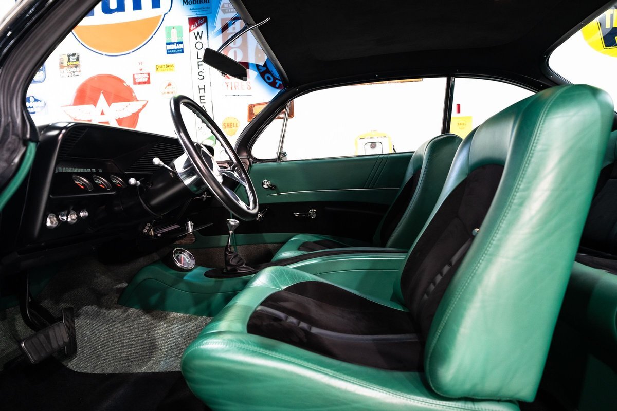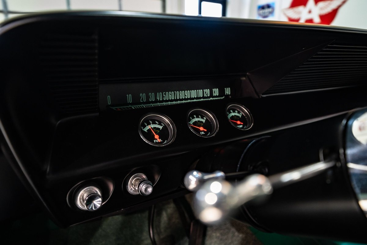 that you need a sweet interior. The stock dash was smoothed off completely before a sweet custom green-on-black gauge set was made for the ride. The Pioneer tunes and Vintage Air controls were slipped into the driver's glovebox. The interior was then delivered to the legendary hands of Paul Atkins' in Alabama, Paul made the center console and then covered everything in black suede and green leather that wasn't covered with wool carpet. Painless Wiring was used to get everything powered up and on the road.