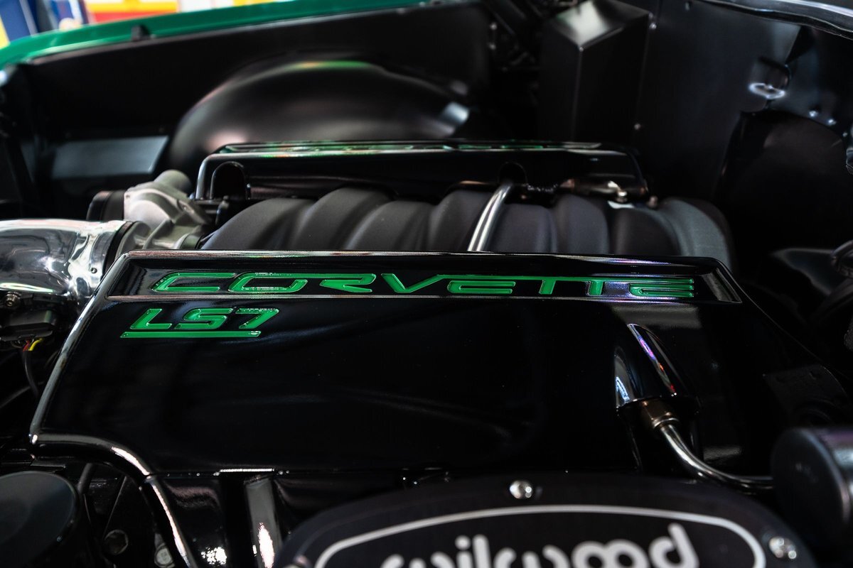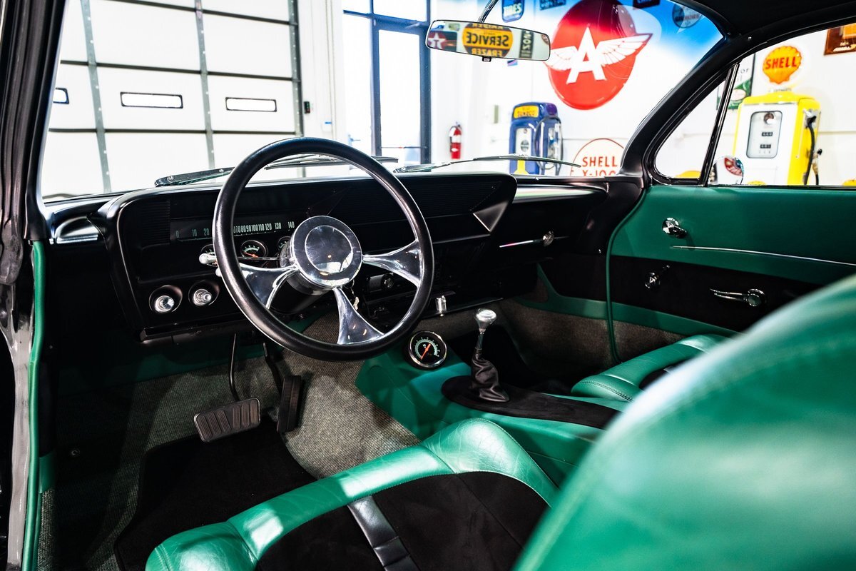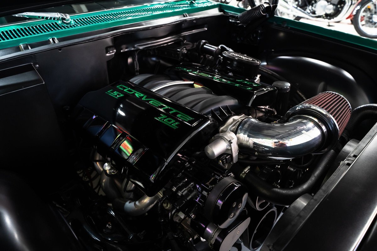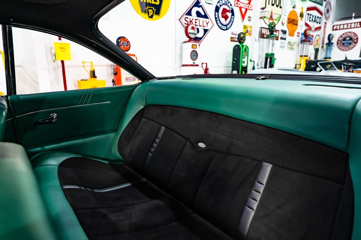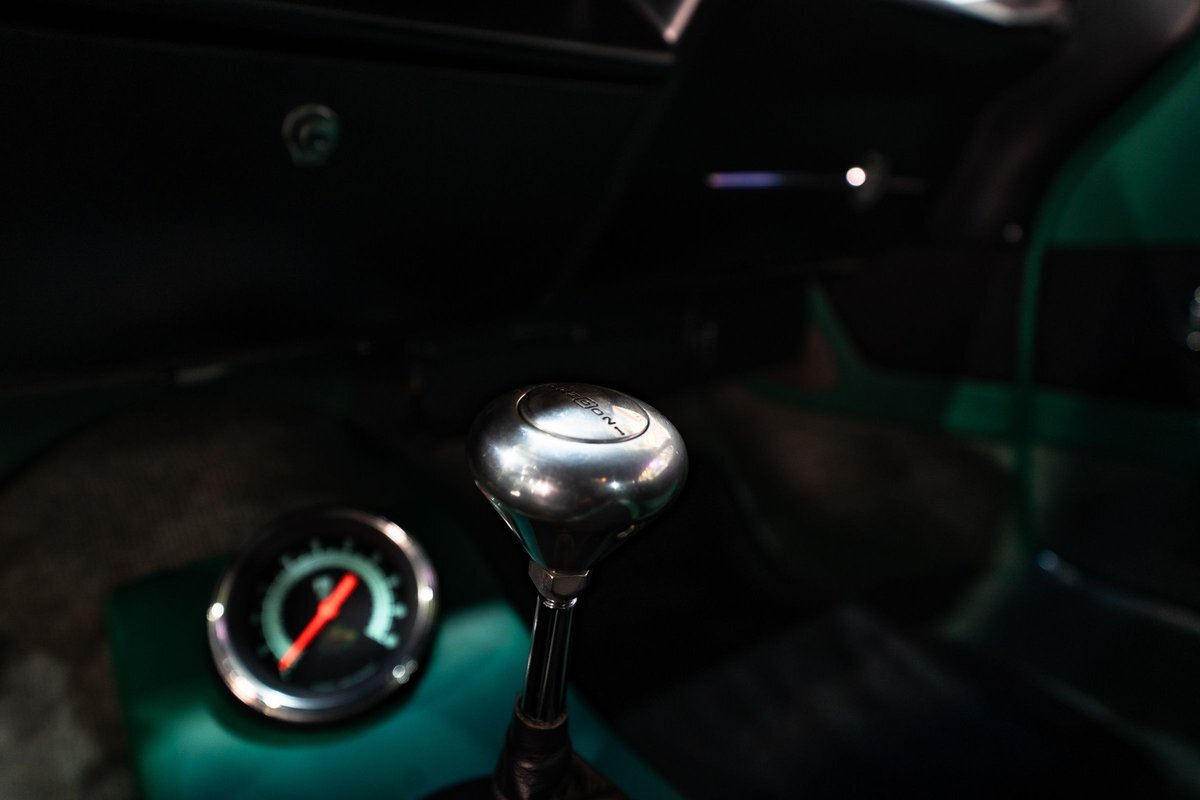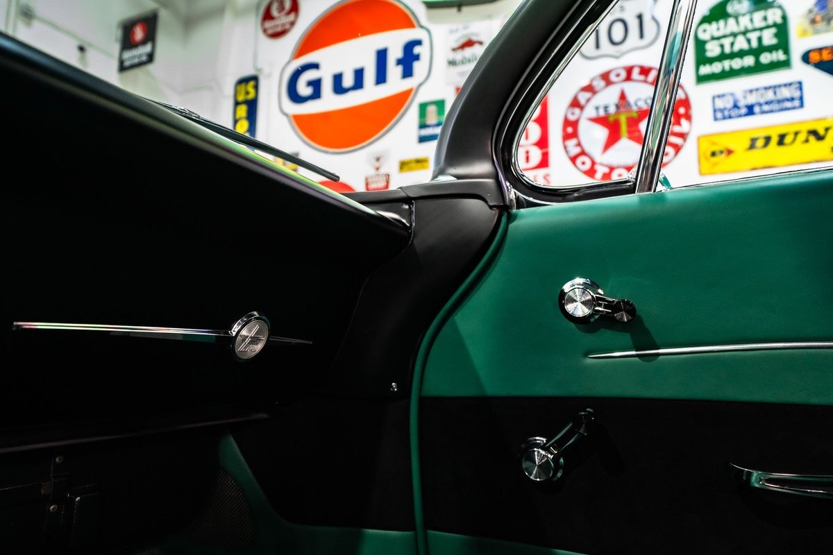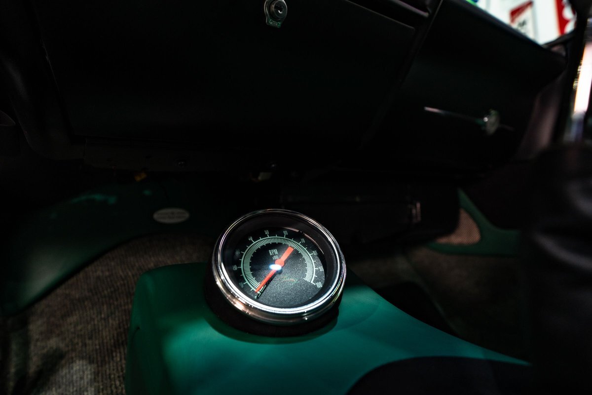 that you need a sweet interior. The stock dash was smoothed off completely before a sweet custom green-on-black gauge set was made for the ride. The Pioneer tunes and Vintage Air controls were slipped into the driver's glovebox. The interior was then delivered to the legendary hands of Paul Atkins' in Alabama, Paul made the center console and then covered everything in black suede and green leather that wasn't covered with wool carpet. Painless Wiring was used to get everything powered up and on the road.