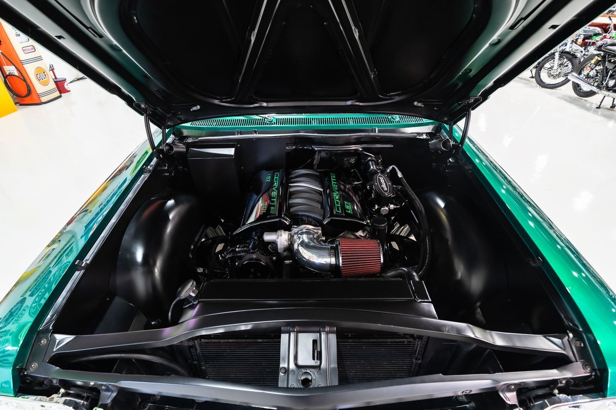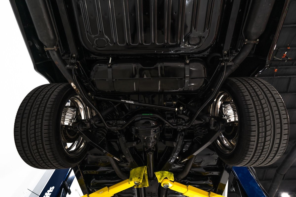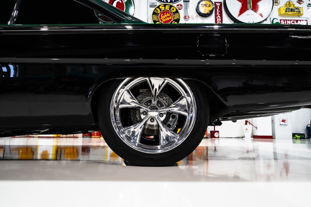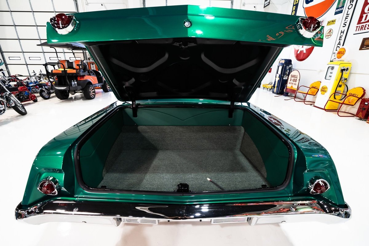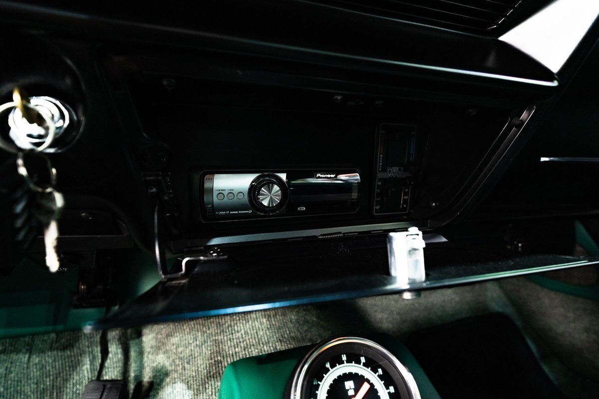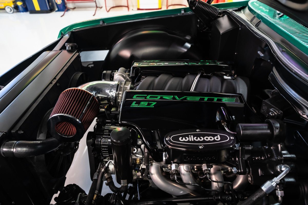 that you need a sweet interior. The stock dash was smoothed off completely before a sweet custom green-on-black gauge set was made for the ride. The Pioneer tunes and Vintage Air controls were slipped into the driver's glovebox. The interior was then delivered to the legendary hands of Paul Atkins' in Alabama, Paul made the center console and then covered everything in black suede and green leather that wasn't covered with wool carpet. Painless Wiring was used to get everything powered up and on the road.