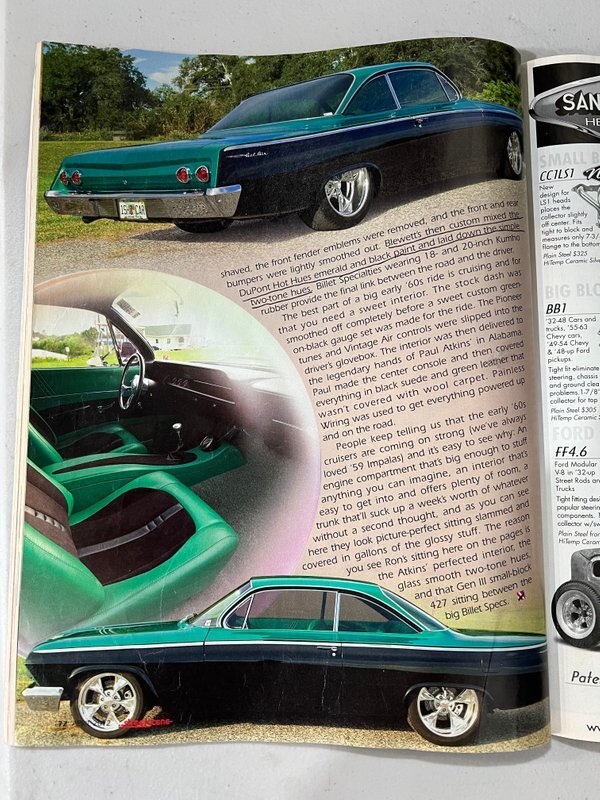 People keep telling us that the early 60s cruisers are coming on strong (we've always loved 59 Impalas) and its easy to see why: An engine compartment thats big enough to stuff anything you can imagine, an interior that's easy to get into and offers plenty of room, a trunk that'll suck up a weeks worth of whatever without a second thought, and as you can see here they look picture-perfect sitting slammed and covered in gallons of the glossy stuff. The reason you see Ron's sitting here on the pages is the Atkins' perfected interior, the glass smooth two-tone hues, and that Gen III small-block 427 sitting between the big Billet specs."