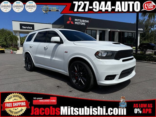 Durango SRT, 4D Sport Utility, SRT HEMI 6.4L V8 MDS, 8-Speed Automatic, AWD, White Knuckle Clearcoat, Black w/Leather Trimmed Bucket Seats or High Performance Laguna Leather Seats, 1 USB Charging Port in Console, 10 Speakers, 12V Auxiliary Power Outlet In Console, 2nd Row Console w/Armrest & Storage, 3.70 Rear Axle Ratio, 3rd Row Floor Mat & Full Console, 3rd row seats: split-bench, 4-Wheel Disc Brakes, 7 & 4 Pin Wiring Harness, ABS brakes, Adaptive Cruise Control w/Stop, Advanced Brake Assist, Air Conditioning, Alloy wheels, AM/FM radio: SiriusXM, Anti-whiplash front head restraints, Apple CarPlay, Apple CarPlay/Android Auto, Audio memory, Auto High-beam Headlights, Auto-dimming door mirrors, Auto-dimming Rear-View mirror, Automatic temperature control, Black Roof Rails w/AZ2 (DISC), Blind Spot & Cross Path Detection, Blu-Ray Compatible Dual Screen Video, Brake assist, Bumpers: body-color, Cargo Compartment Cover, Cargo Plus Group (DISC), Class IV Receiver Hitch, Compass, Delay-off headlights, Driver door bin, Driver vanity mirror, Dual front impact airbags, Dual front side impact airbags, Electronic Stability Control, Emergency communication system: Roadside Assistance/9-1-1 Call, Four wheel independent suspension, Front anti-roll bar, Front Bucket Seats, Front Center Armrest w/Storage, Front dual zone A/C, Front fog lights, Front reading lights, Full Speed Forward Collision Warning Plus, Fully automatic headlights, Garage door transmitter, Google Android Auto, Heated door mirrors, Heated front seats, Heated rear seats, Heated steering wheel, High-Intensity Discharge Headlights, Illuminated entry, Illuminated Rear Cupholders, Integrated Roof Rail Crossbars, Knee airbag, Lane Departure Warning Plus, Leather Shift Knob, Leather Trimmed Bucket Seats, Low tire pressure warning, Manufacturer's Statement of Origin, Memory seat, Navigation System, Navigation system: Garmin, Occupant sensing airbag, Outside temperature display, Overhead airbag, Overhead console, Panic alarm, ParkView Rear Back-Up Camera, Passenger door bin, Passenger vanity mirror, Power 8-Way Driver Memory 8-Way Passenger Seats, Power door mirrors, Power driver seat, Power Liftgate, Power passenger seat, Power steering, Power Sunroof, Power windows, Premium Wrapped I/P Bezel, Quick Order Package 27L (DISC), Radio data system, Radio: Uconnect 4C Nav w/8.4 Display, Rain sensing wipers, Real Carbon Fiber Interior Accents, Real Carbon Fiber Interior Accents (DISC), Rear air conditioning, Rear anti-roll bar, Rear DVD Entertainment Center, Rear reading lights, Rear window defroster, Rear window wiper, Rear-Seat Video System, Remote keyless entry, Security system, Speed control, Speed-Sensitive Wipers, Split folding rear seat, Spoiler, SRT Interior Appearance Group, Steering wheel mounted audio controls, Tachometer, Technology Group, Telescoping steering wheel, Tilt steering wheel, Traction control, Trailer Tow Group IV, Trip computer, Turn signal indicator mirrors, Variably intermittent wipers, Ventilated front seats, Wheels: 20 x 10 Lo-Gloss Black Multispoke. Clean CARFAX.White Knuckle Clearcoat 2018 Dodge Durango SRT AWD SRT HEMI 6.4L V8 MDSHere at Jacobs Mitsubishi our goal is to make you a customer for life. We want you to have the most enjoyable car buying experience possible . All prices displayed do not include additional accessories or fees and costs of closing including any government, additional packages applied to vehicle, including but not limited to Jacobs Care, Reconditioning fees,federal, dealer fees, taxes, registration, dealer document, cost of accessories, emissions testing, or any other fees. All prices, specifications and availability are subject to change at any time, without notice. Not all applicants will be approved, offers may change at any time and may not reflect accuracy online, see dealer for most updated offers. Not all offers can be combined. Applicant may qualify for partial discount displayed by financing with another approved lender through and provided by Jacobs Mitsubishi. Contact dealer for most current information, availability, or details.