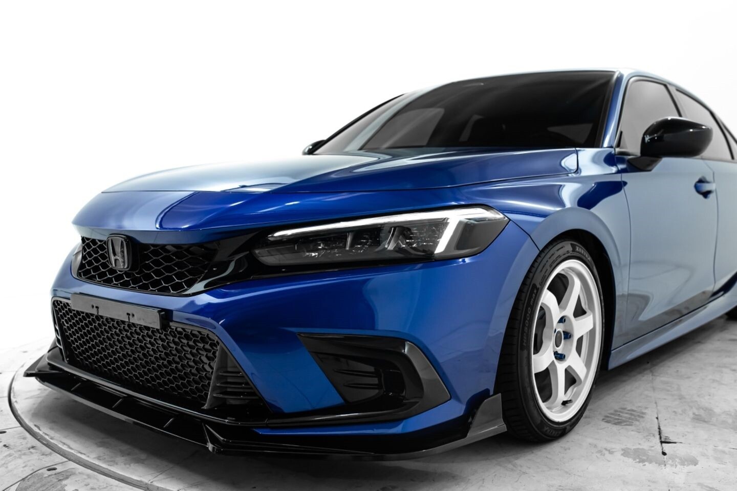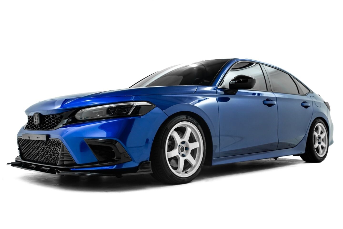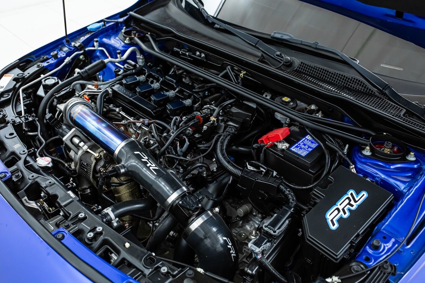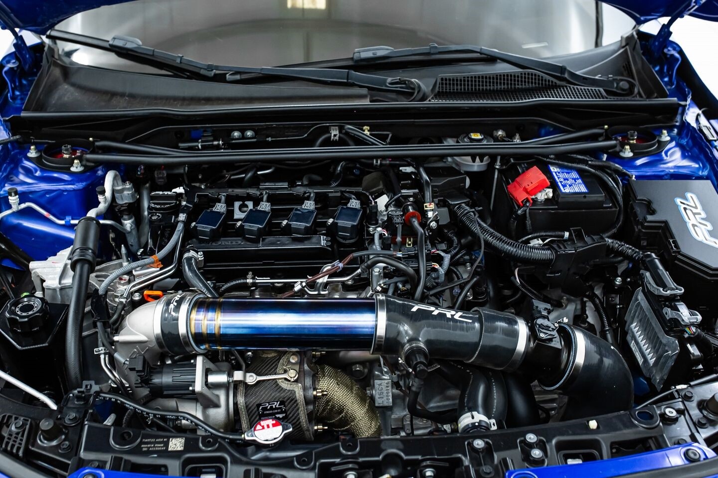 This 2022 Honda Civic Si is a heavily modified sedan that is ready to be driven at the limit. Under the hood is a turbocharged 1.5-liter inline four-cylinder engine that produces 200 horsepower and 192 lb-ft of torque, all of which is sent through a six-speed manual transmission to the front wheels. The engine is not stock, however, having received an RV6 R365 Red Ball Bearing turbocharger upgrade, a PRL Motorsports front-mount intercooler, a PRL Motorsports coolant expansion tank, a PRL/PTP turbocharger blanket, an aftermarket downpipe, a PRL Motorsports cold-side charge pipe, and performance tuning, among other modifications. This sleek vehicle comes equipped with 17" Rota wheels and is finished in Aegean Blue Metallic, a breathtaking color that perfectly suits the car's lines. The exterior of this Honda has been made even more unique with the addition of some cosmetic modifications, which include an aftermarket ducktail spoiler, smoked LED aftermarket taillights, smoked rear reflectors, and aftermarket front lip. In the interior, this Civic Si offers cloth "Si" bucket seats, a flat-bottomed carbon fiber and leather steering wheel, selectable drive modes, push-to-start, an "Si" ball shift knob, a semi-digital gauge cluster, and an infotainment system with Bluetooth, apps, phone connectivity, AUX, Apple CarPlay, Android Auto, and a backup camera, truly making this car the complete package.