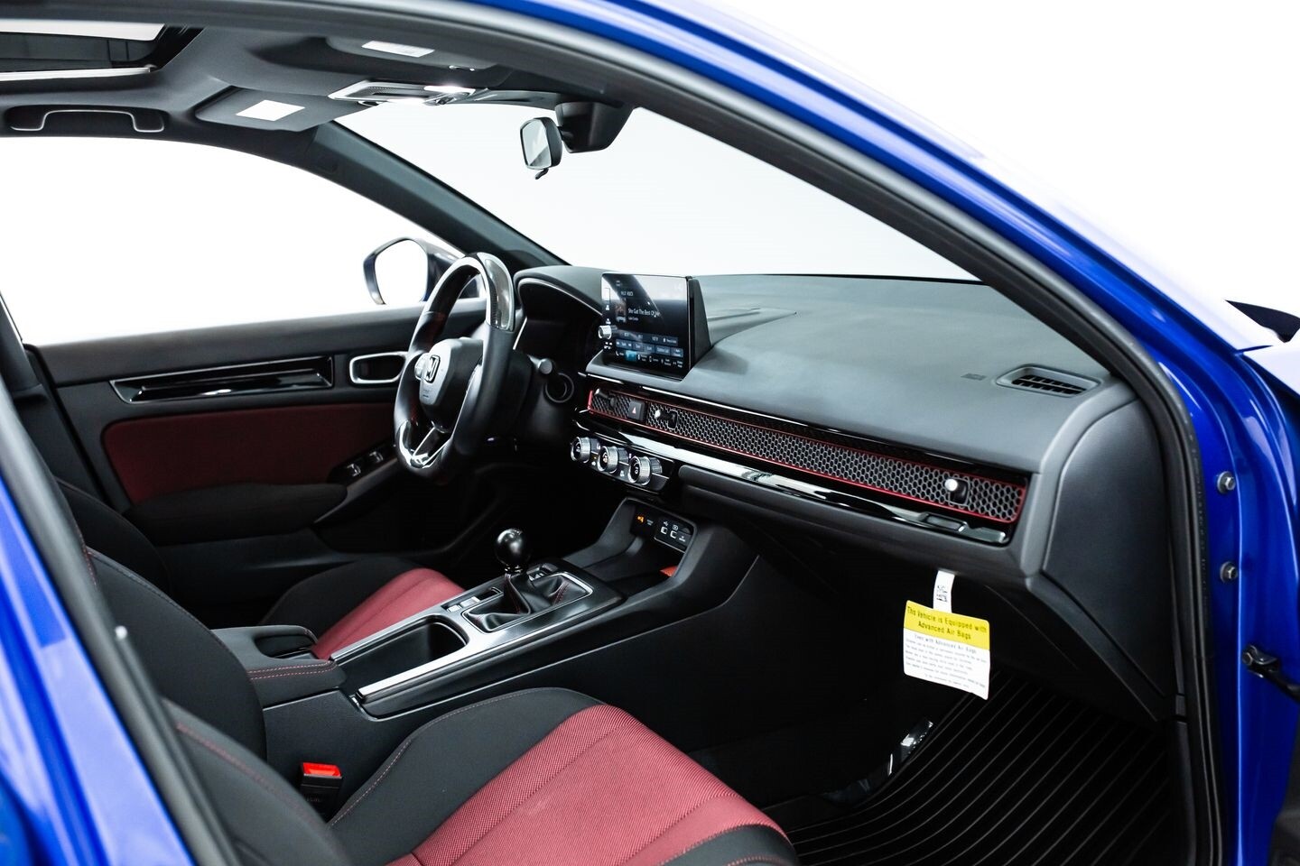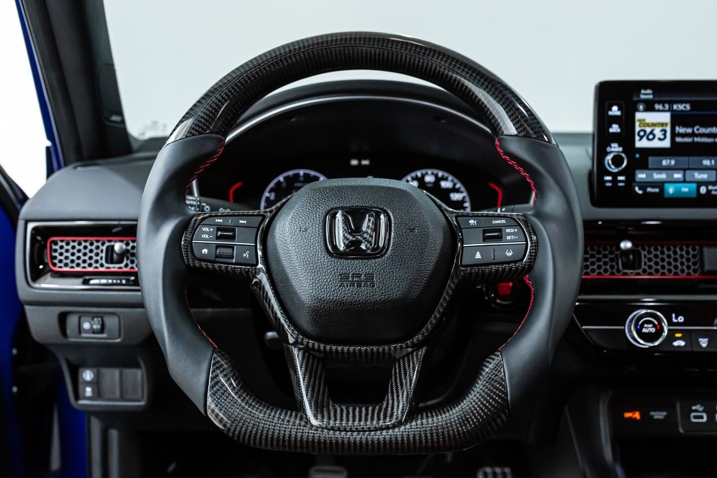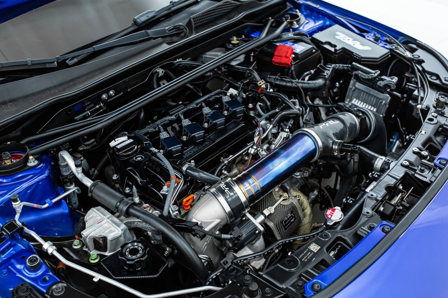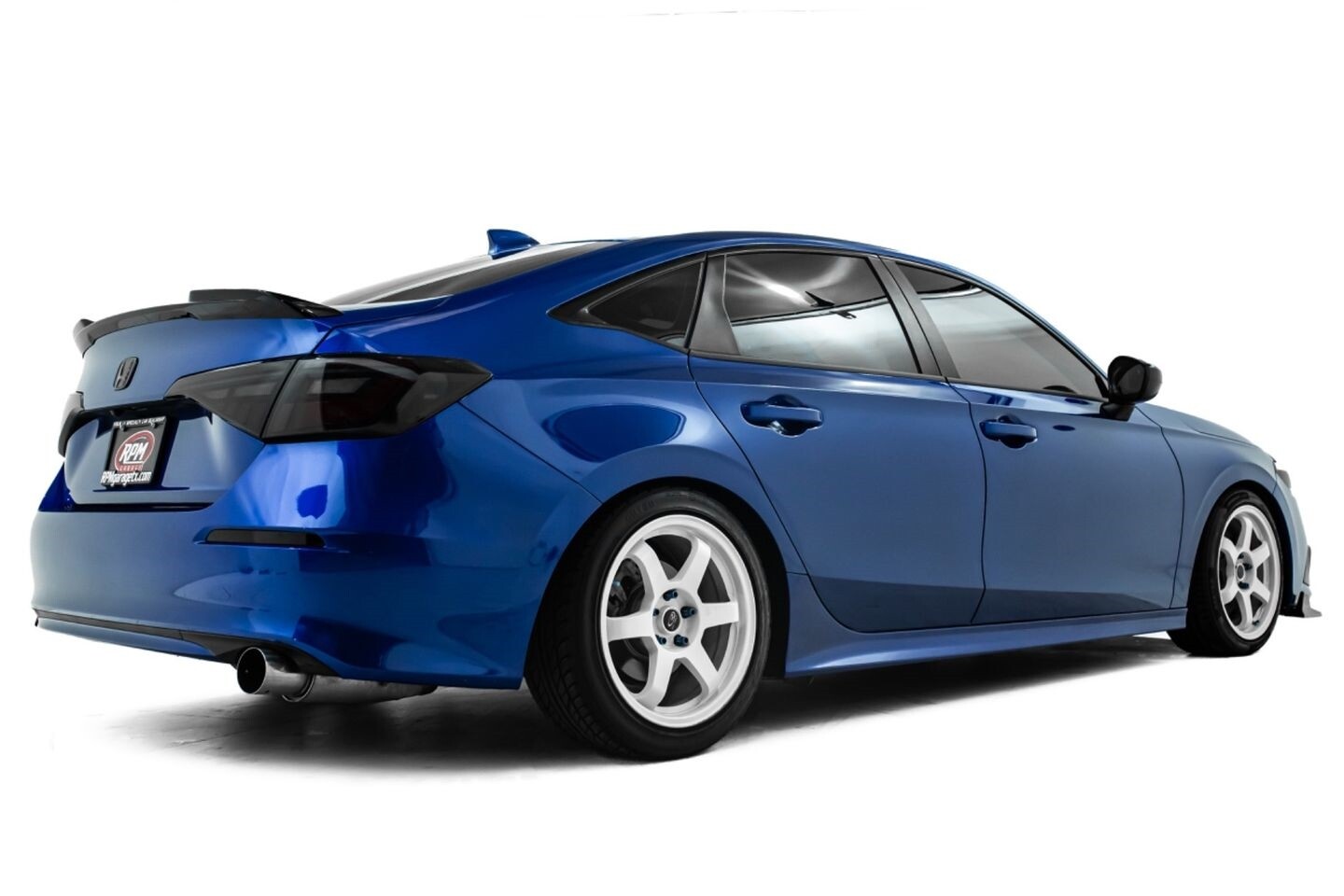 This 2022 Honda Civic Si is a heavily modified sedan that is ready to be driven at the limit. Under the hood is a turbocharged 1.5-liter inline four-cylinder engine that produces 200 horsepower and 192 lb-ft of torque, all of which is sent through a six-speed manual transmission to the front wheels. The engine is not stock, however, having received an RV6 R365 Red Ball Bearing turbocharger upgrade, a PRL Motorsports front-mount intercooler, a PRL Motorsports coolant expansion tank, a PRL/PTP turbocharger blanket, an aftermarket downpipe, a PRL Motorsports cold-side charge pipe, and performance tuning, among other modifications. This sleek vehicle comes equipped with 17" Rota wheels and is finished in Aegean Blue Metallic, a breathtaking color that perfectly suits the car's lines. The exterior of this Honda has been made even more unique with the addition of some cosmetic modifications, which include an aftermarket ducktail spoiler, smoked LED aftermarket taillights, smoked rear reflectors, and aftermarket front lip. In the interior, this Civic Si offers cloth "Si" bucket seats, a flat-bottomed carbon fiber and leather steering wheel, selectable drive modes, push-to-start, an "Si" ball shift knob, a semi-digital gauge cluster, and an infotainment system with Bluetooth, apps, phone connectivity, AUX, Apple CarPlay, Android Auto, and a backup camera, truly making this car the complete package.