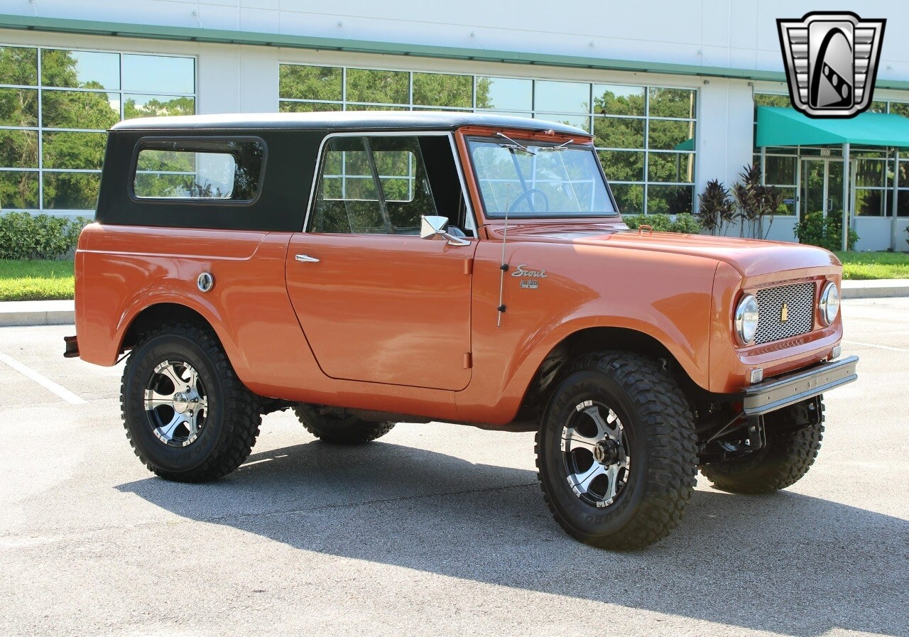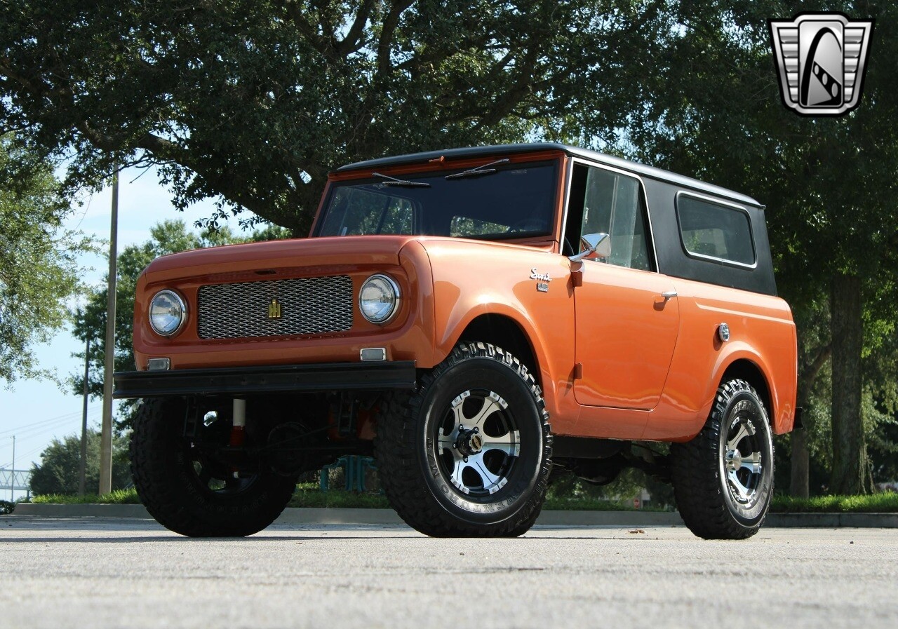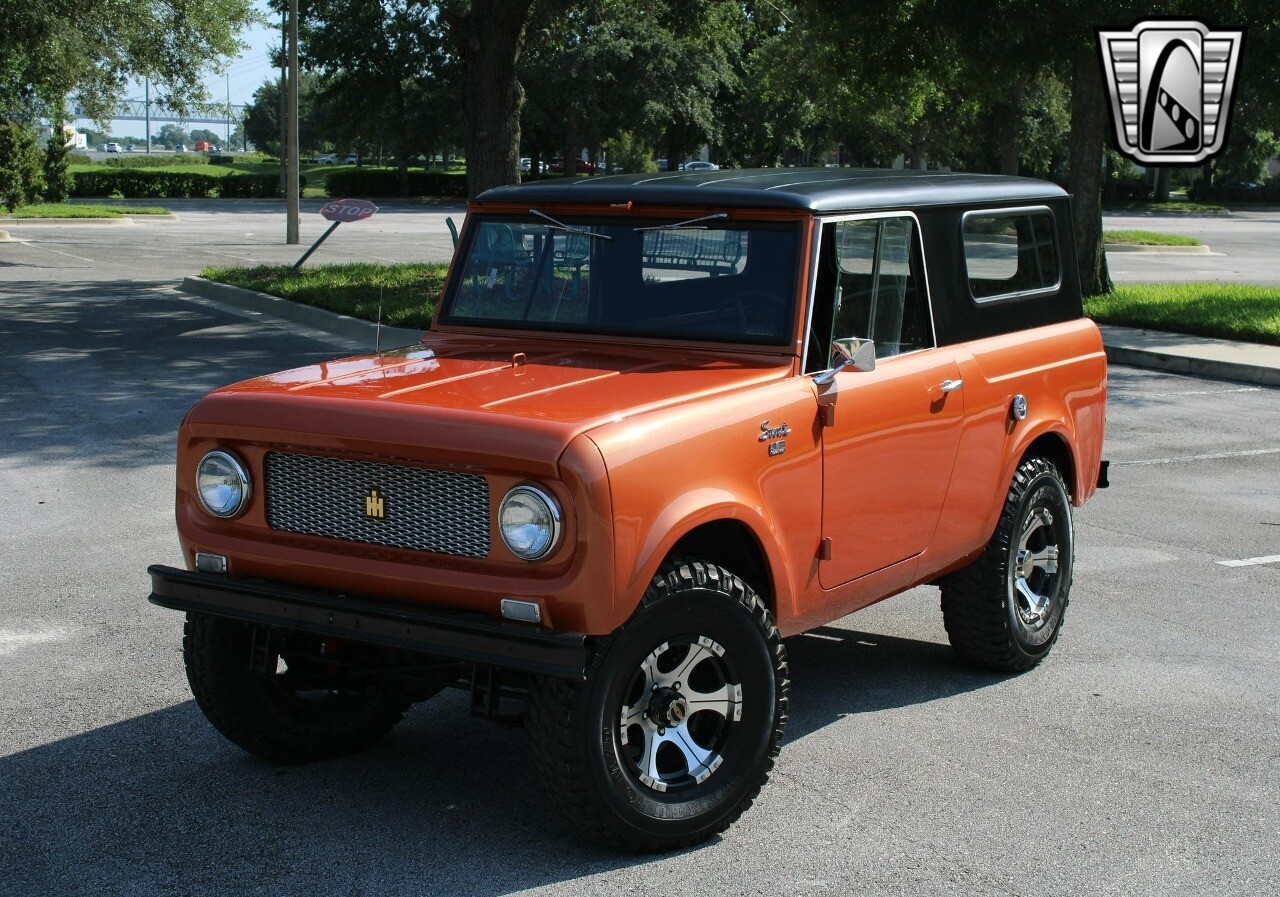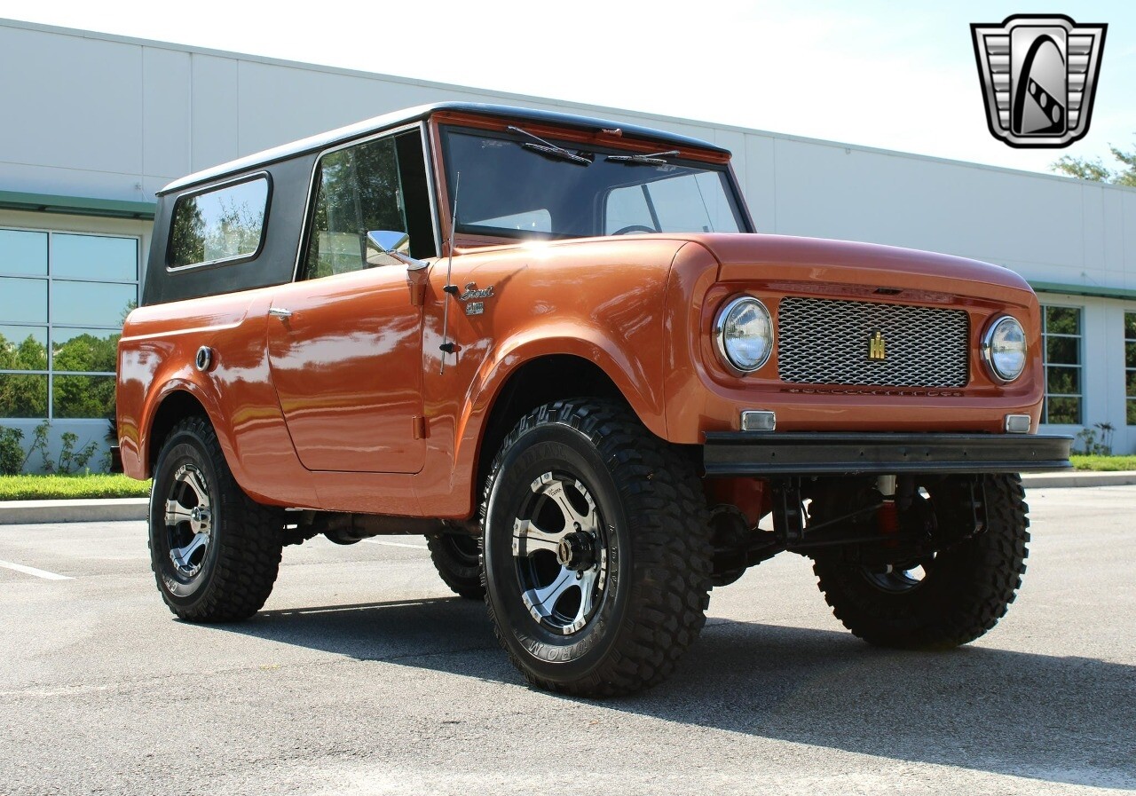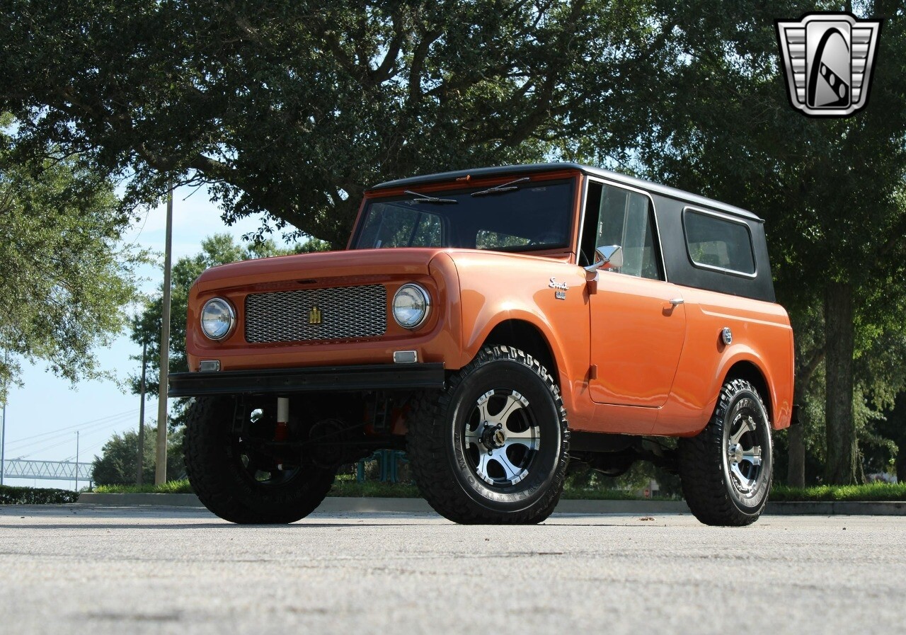 Introducing the 1963 International Harvester Scout, a classic embodiment of rugged utility and timeless design. This particular model stands out with its striking orange exterior, a color that not only commands attention but also pays homage to the vibrant spirit of the 1960s. The Scout's bold exterior is complemented by a sleek black interior, creating a visually appealing contrast that enhances its vintage charm.