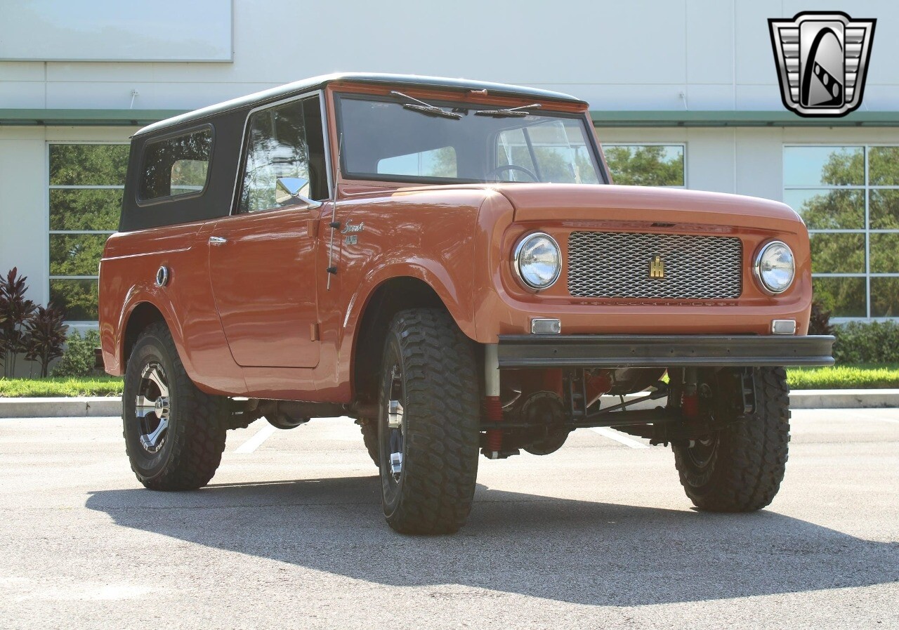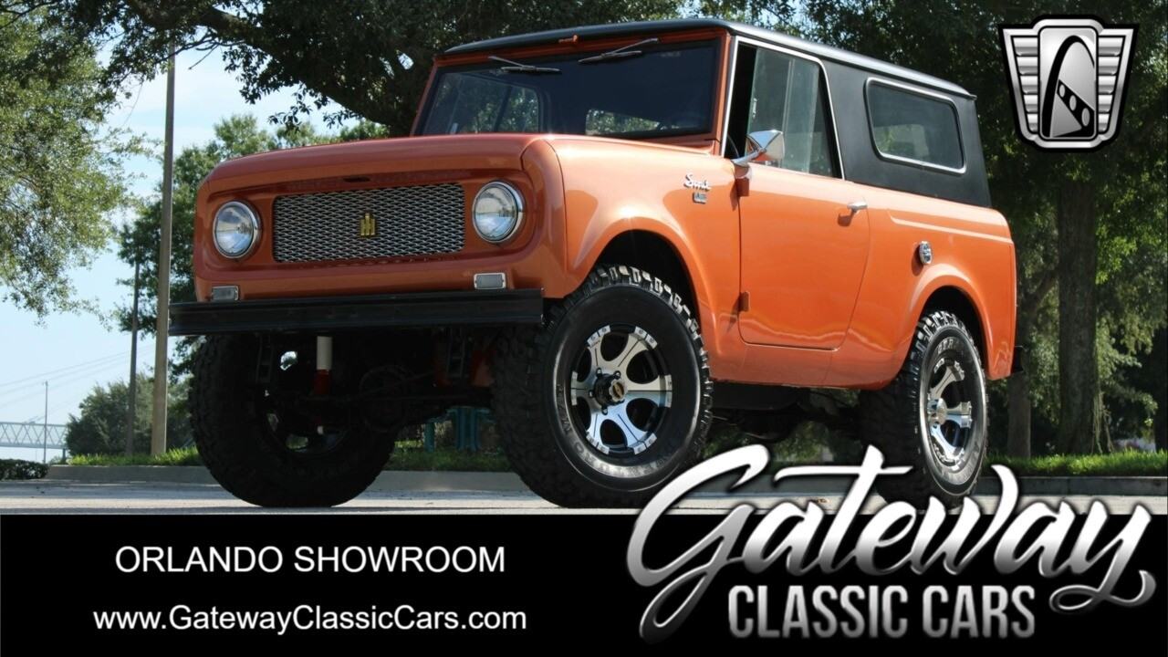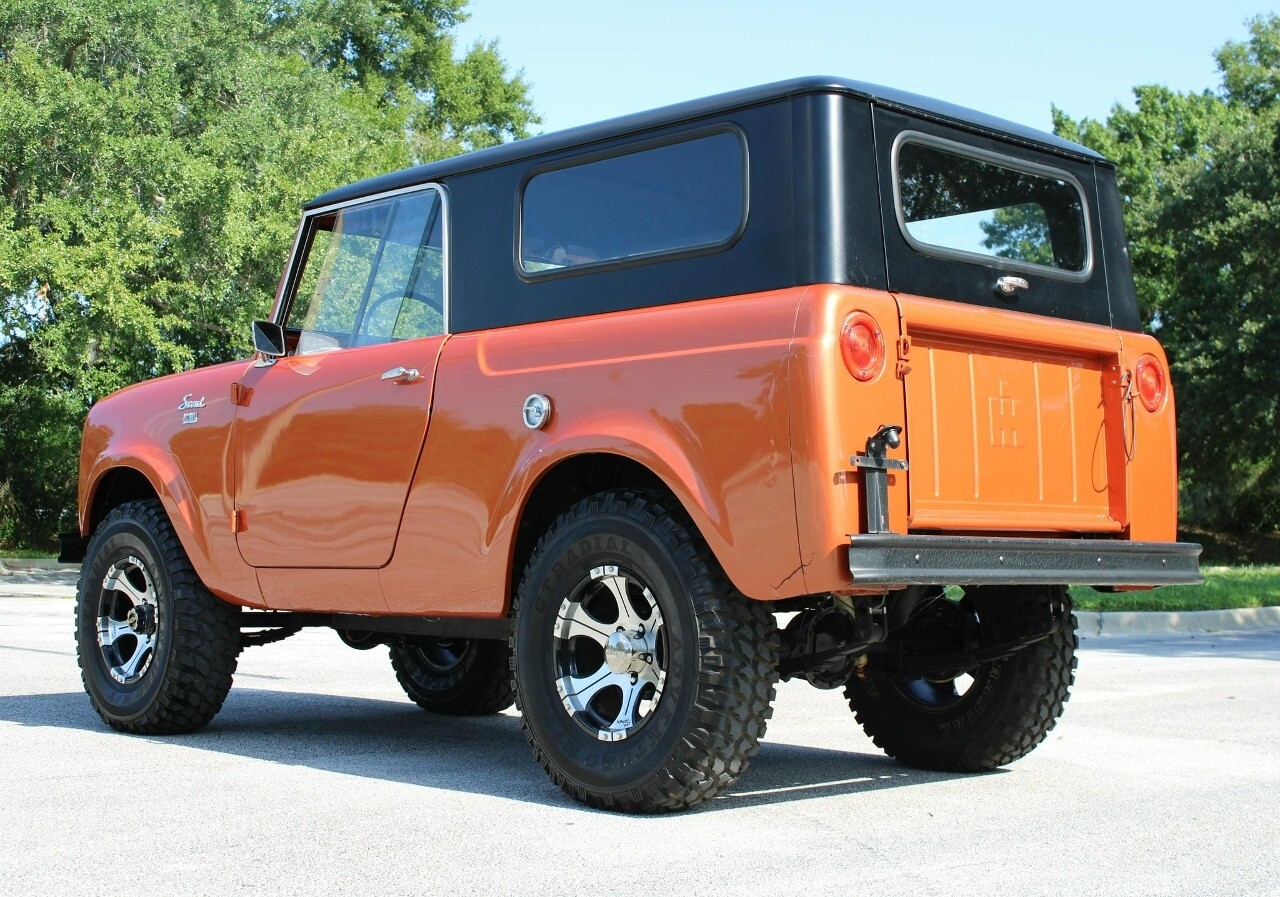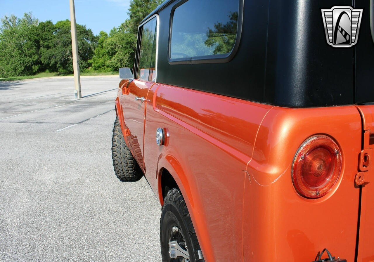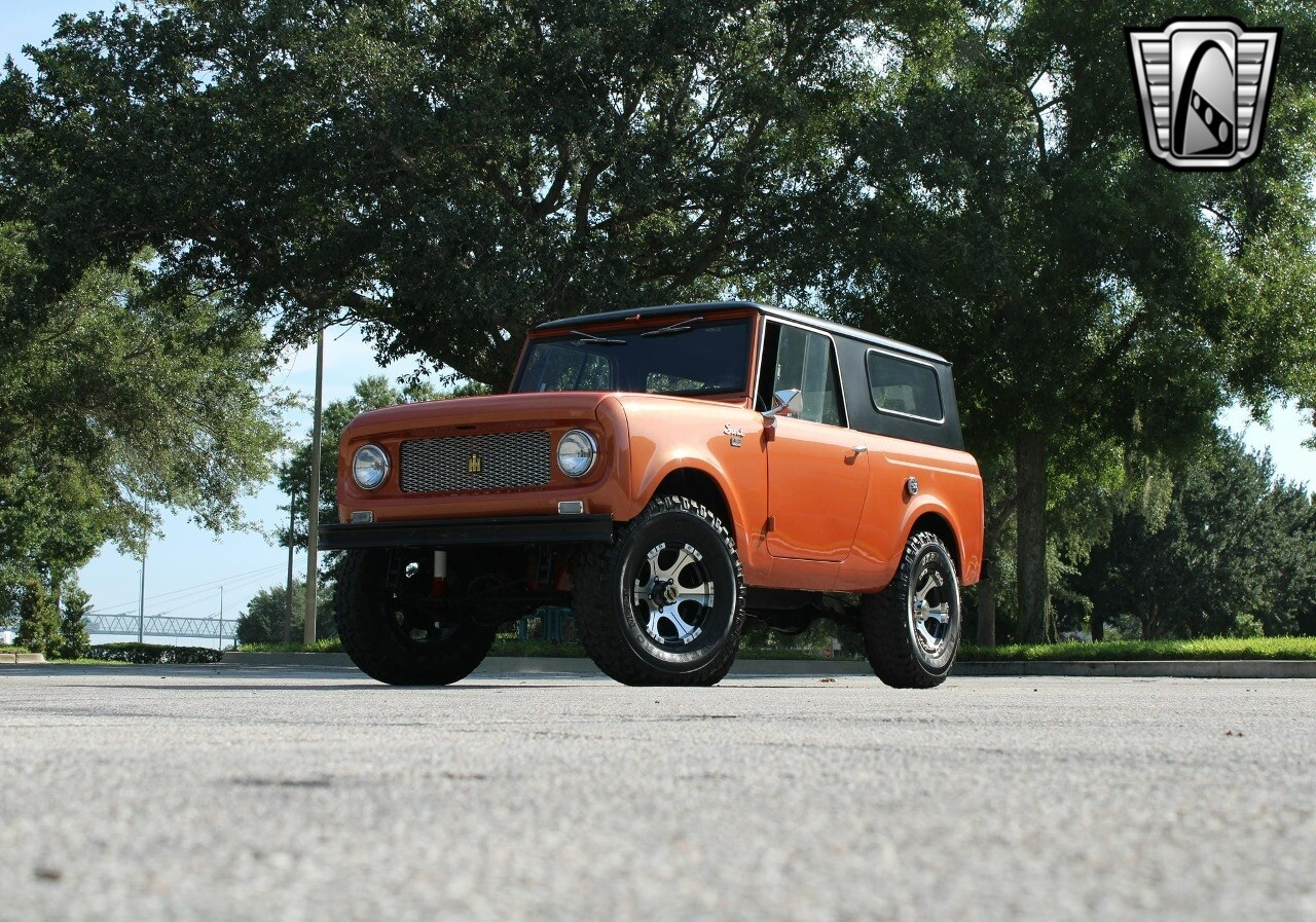 Introducing the 1963 International Harvester Scout, a classic embodiment of rugged utility and timeless design. This particular model stands out with its striking orange exterior, a color that not only commands attention but also pays homage to the vibrant spirit of the 1960s. The Scout's bold exterior is complemented by a sleek black interior, creating a visually appealing contrast that enhances its vintage charm.