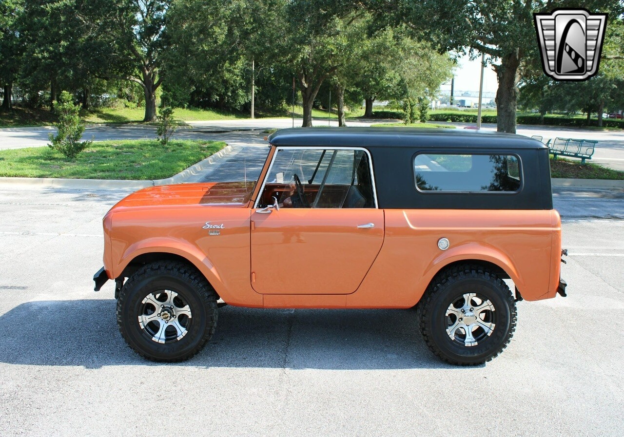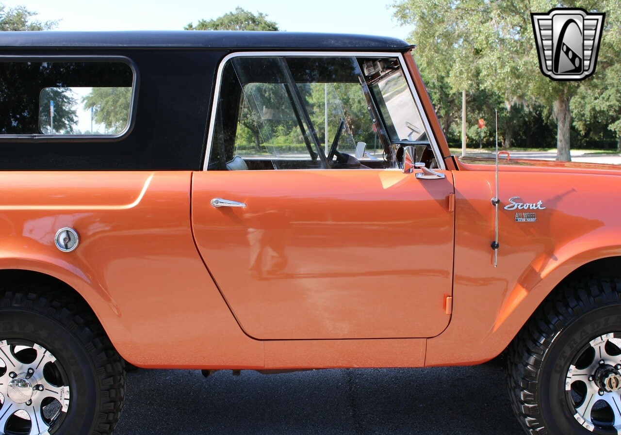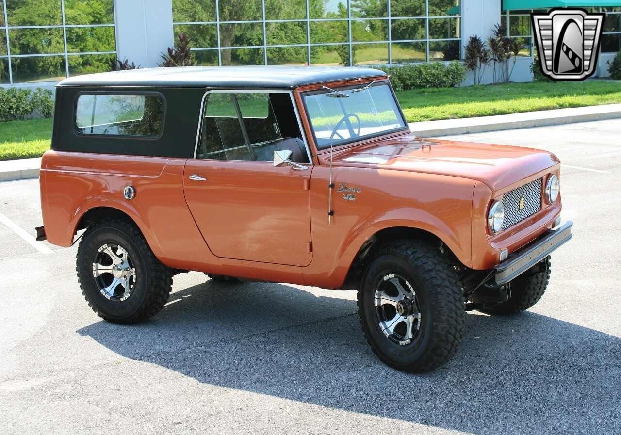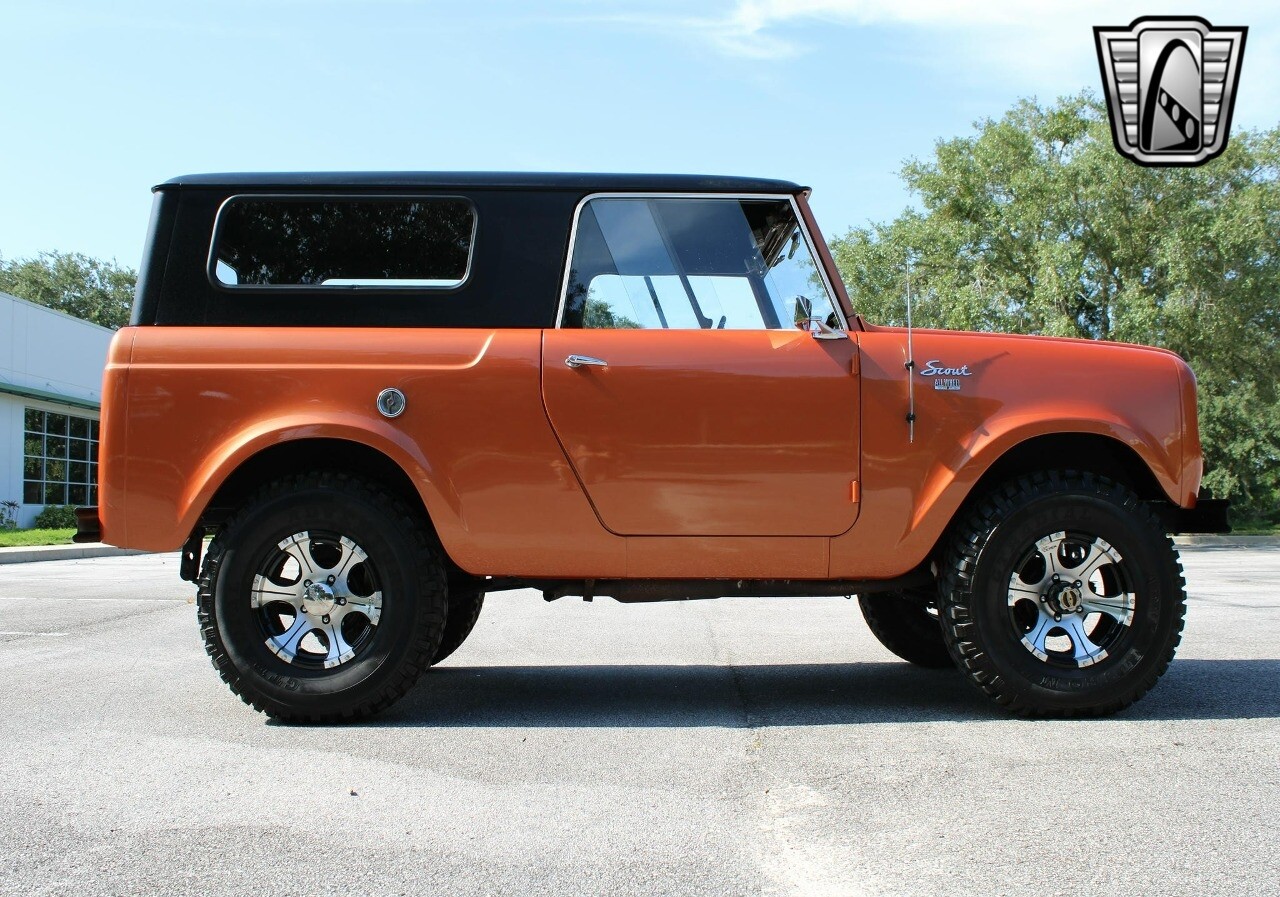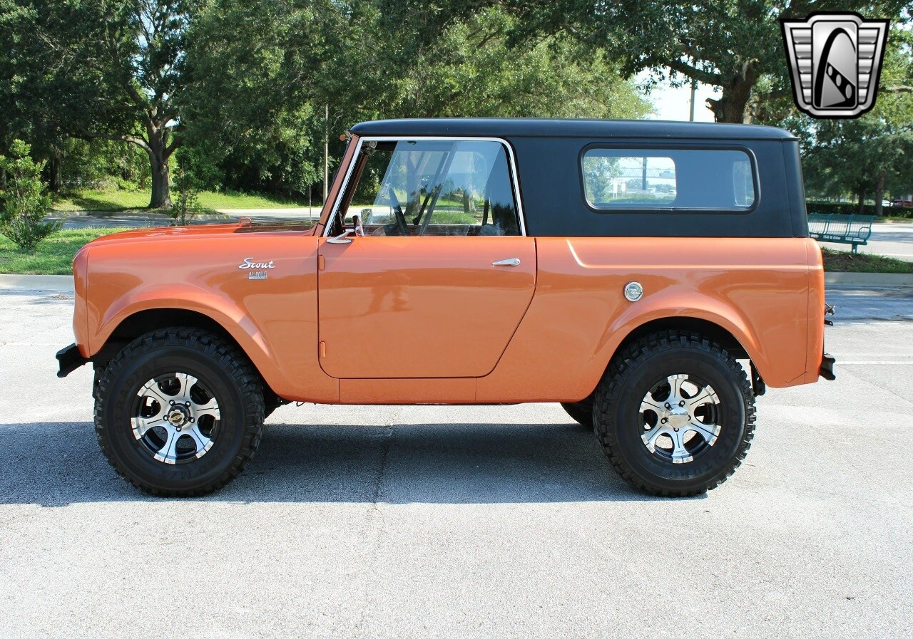Introducing the 1963 International Harvester Scout, a classic embodiment of rugged utility and timeless design. This particular model stands out with its striking orange exterior, a color that not only commands attention but also pays homage to the vibrant spirit of the 1960s. The Scout's bold exterior is complemented by a sleek black interior, creating a visually appealing contrast that enhances its vintage charm.