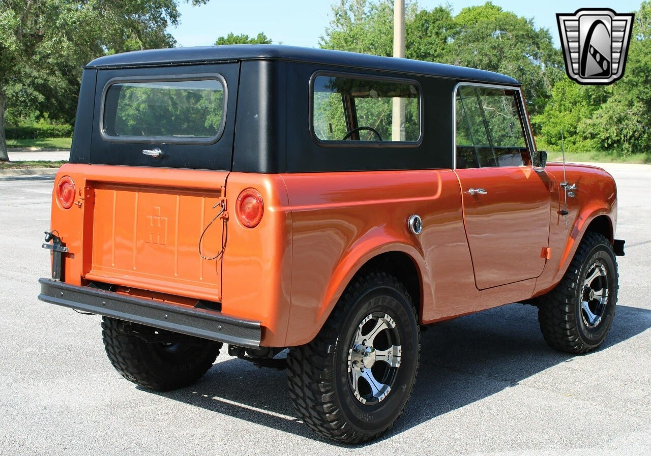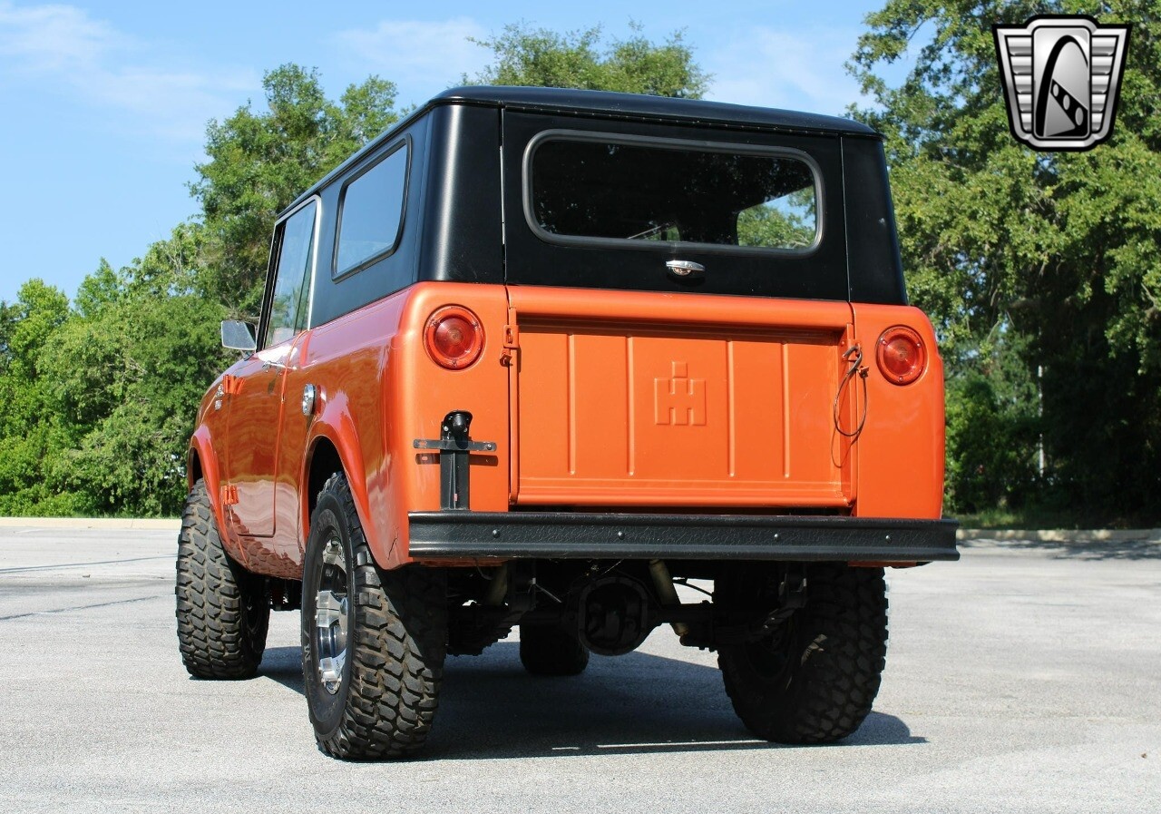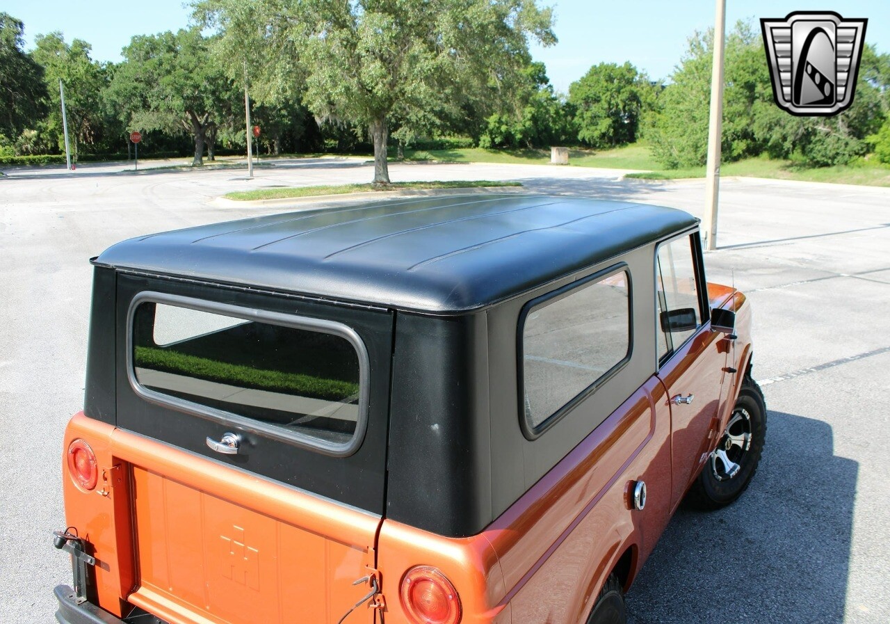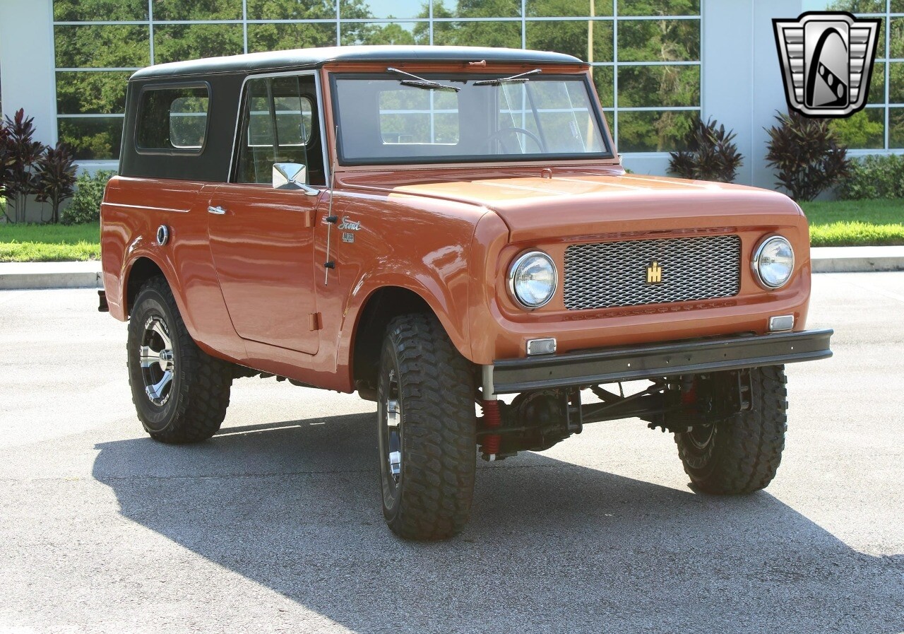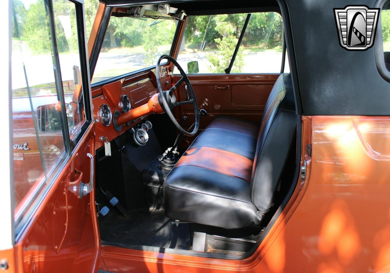 Introducing the 1963 International Harvester Scout, a classic embodiment of rugged utility and timeless design. This particular model stands out with its striking orange exterior, a color that not only commands attention but also pays homage to the vibrant spirit of the 1960s. The Scout's bold exterior is complemented by a sleek black interior, creating a visually appealing contrast that enhances its vintage charm.