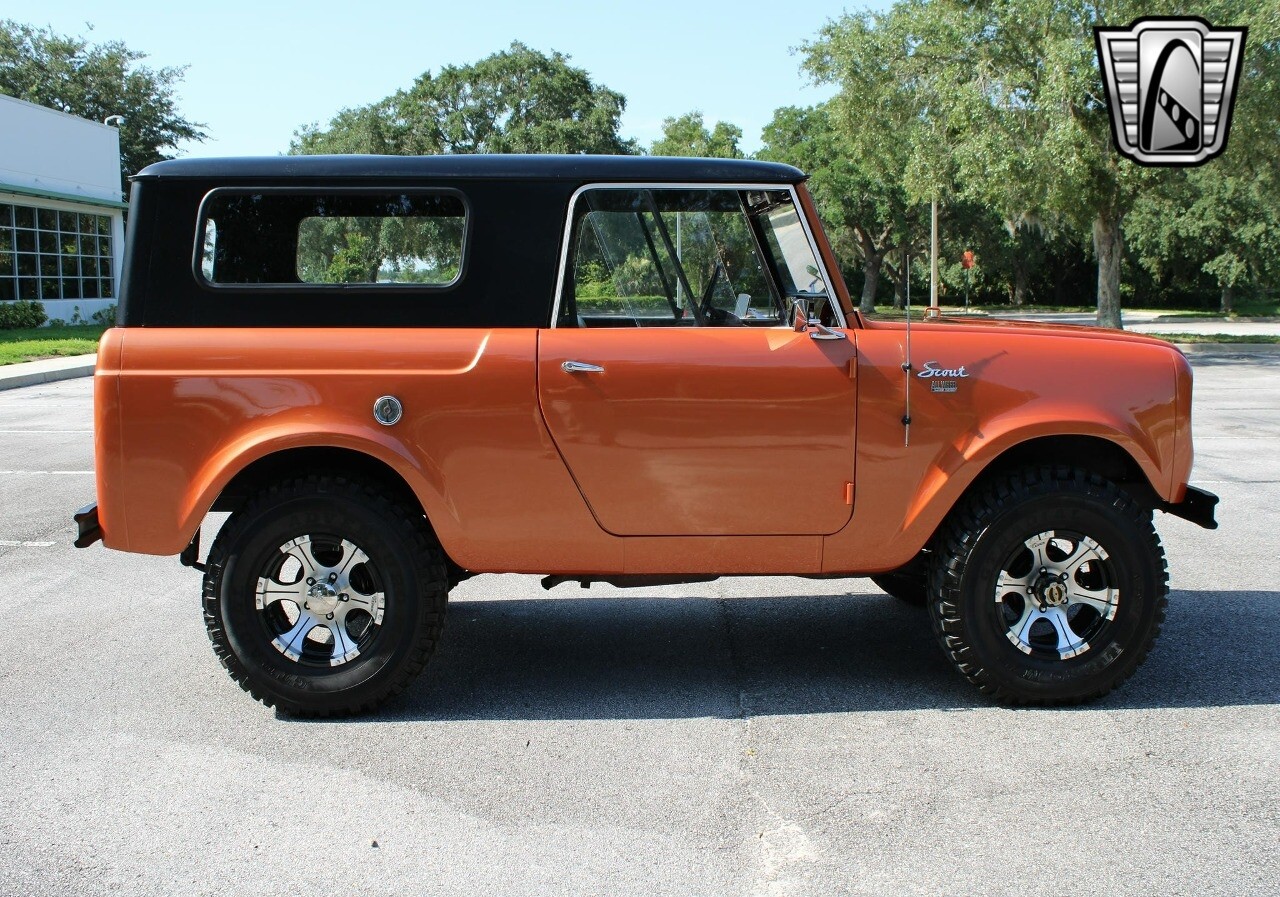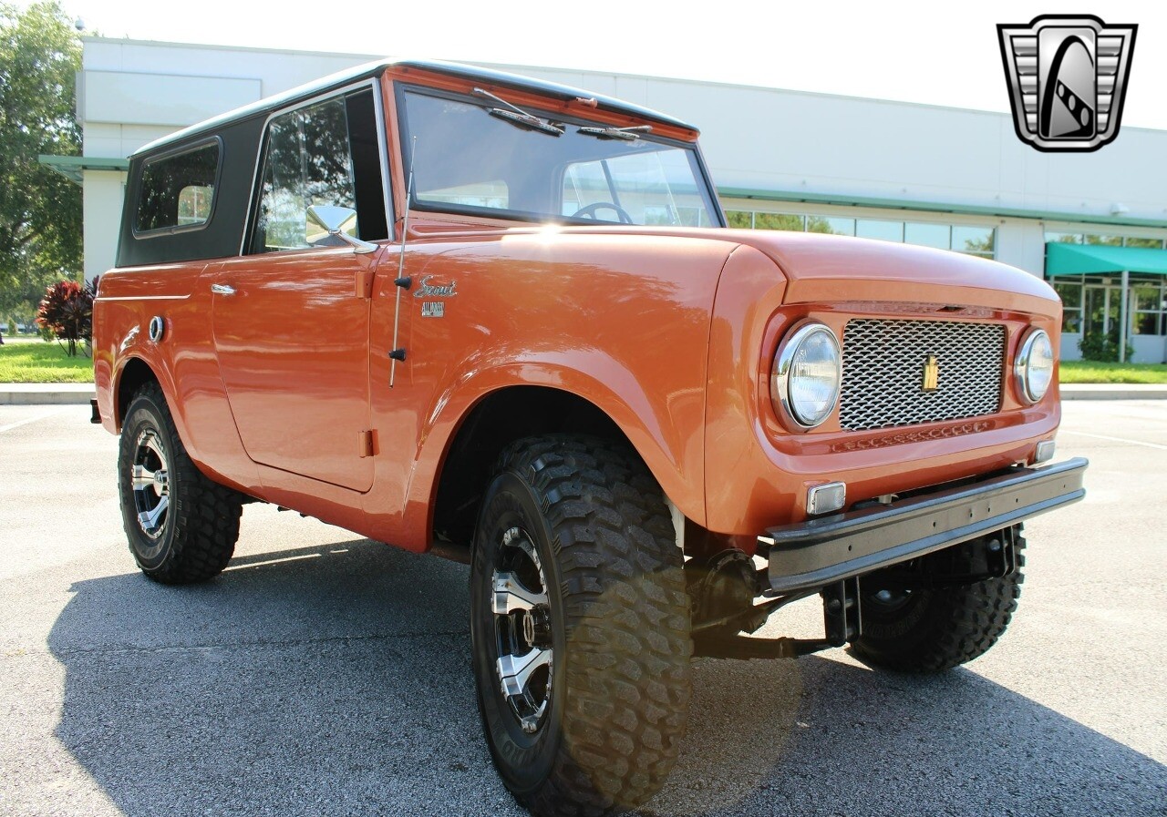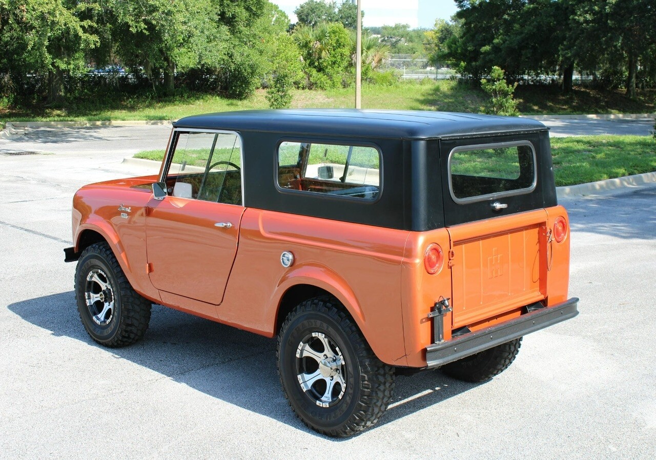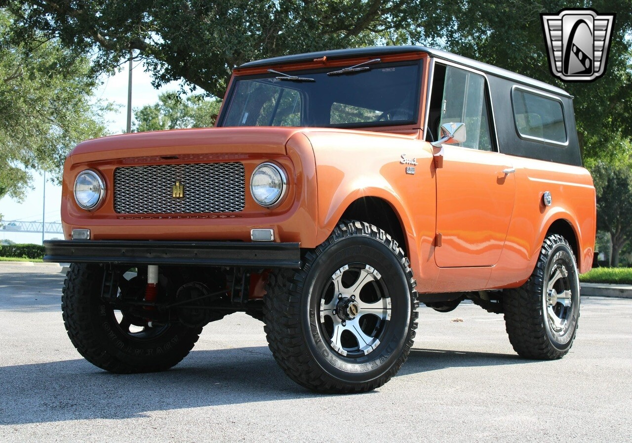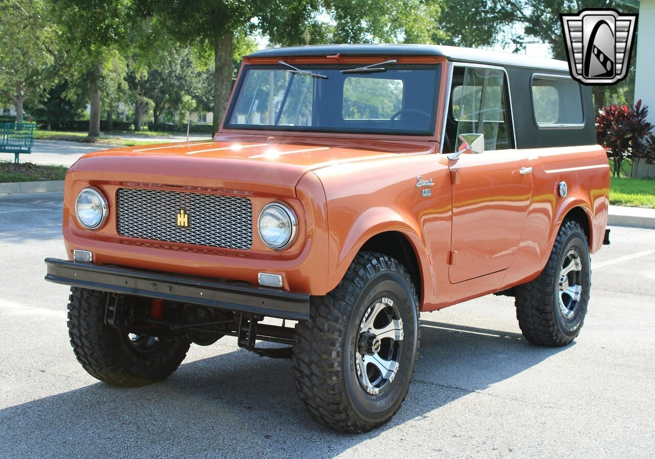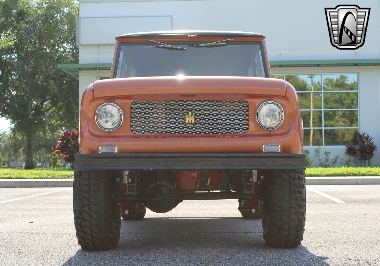 Introducing the 1963 International Harvester Scout, a classic embodiment of rugged utility and timeless design. This particular model stands out with its striking orange exterior, a color that not only commands attention but also pays homage to the vibrant spirit of the 1960s. The Scout's bold exterior is complemented by a sleek black interior, creating a visually appealing contrast that enhances its vintage charm.