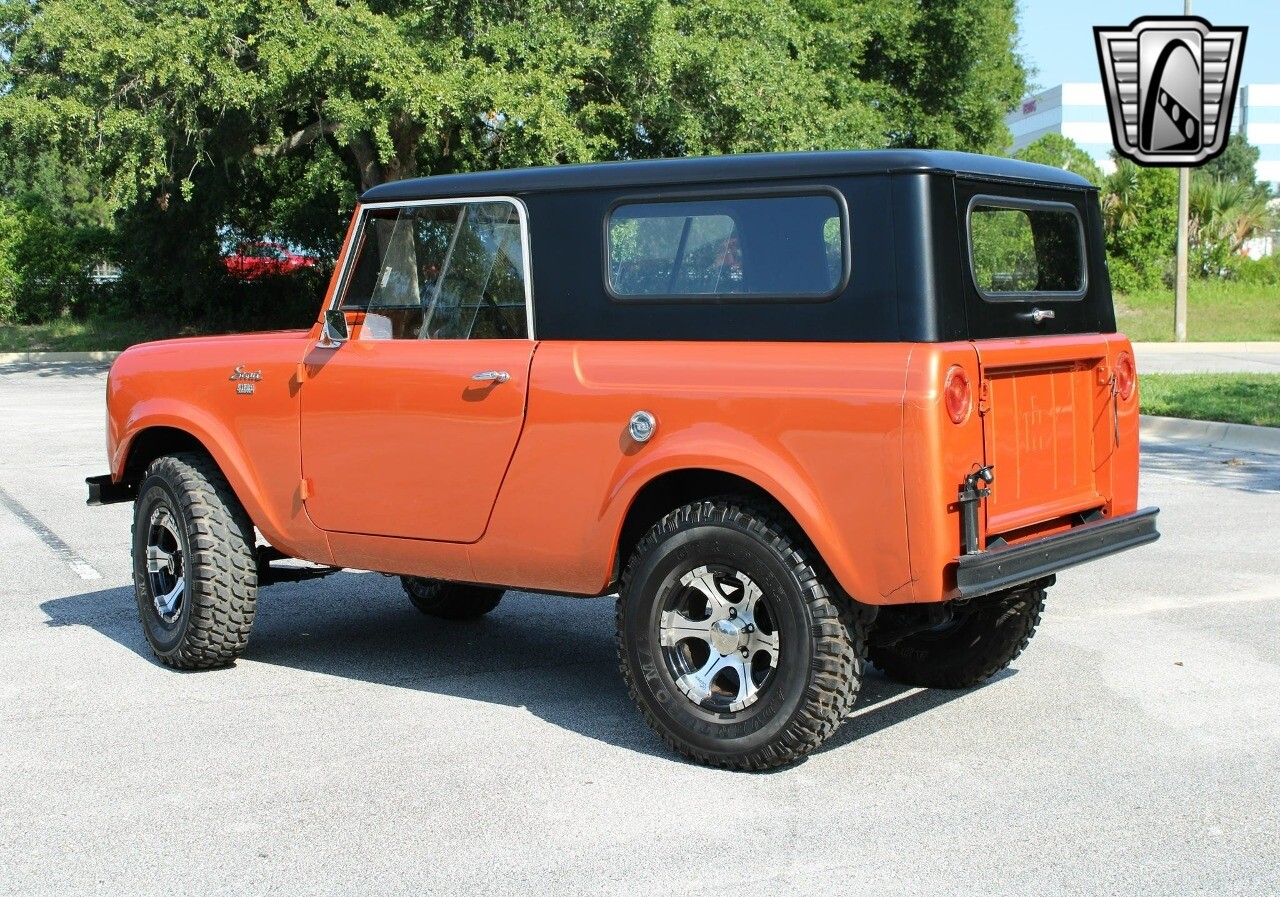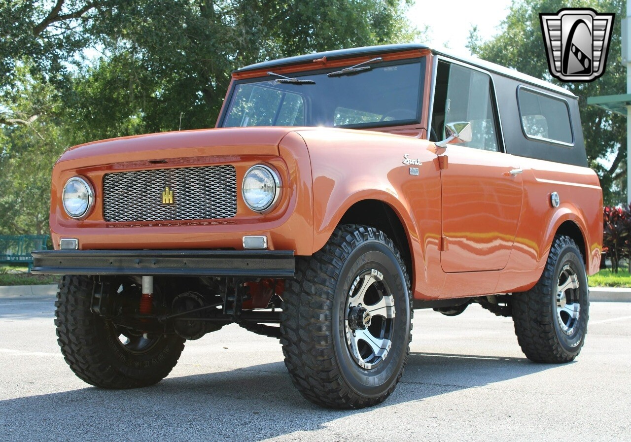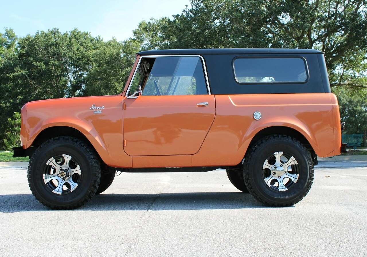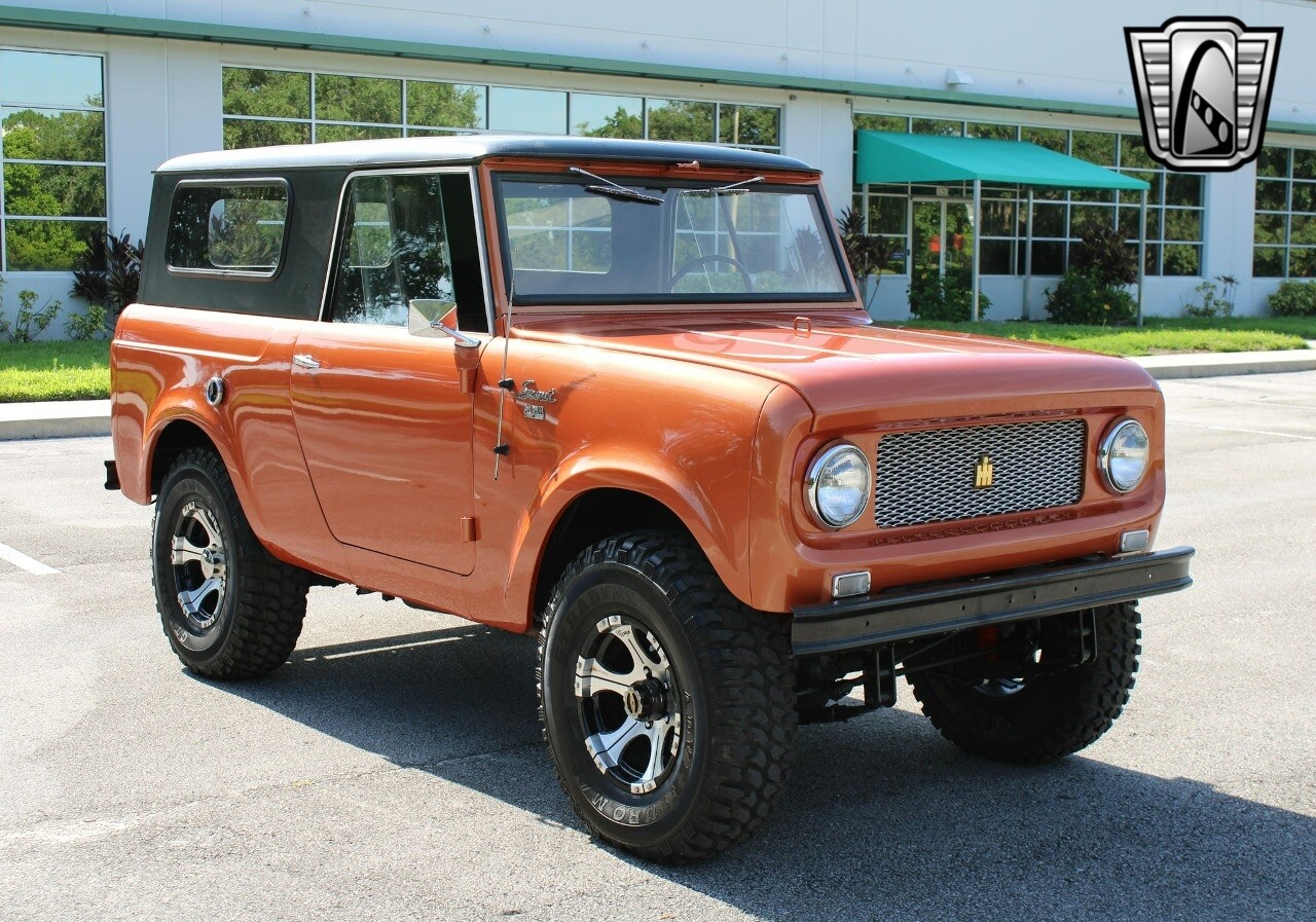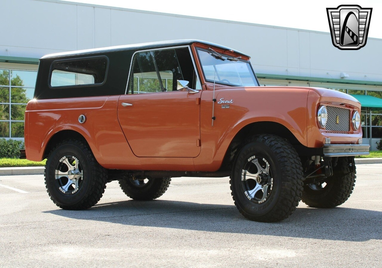 Introducing the 1963 International Harvester Scout, a classic embodiment of rugged utility and timeless design. This particular model stands out with its striking orange exterior, a color that not only commands attention but also pays homage to the vibrant spirit of the 1960s. The Scout's bold exterior is complemented by a sleek black interior, creating a visually appealing contrast that enhances its vintage charm.