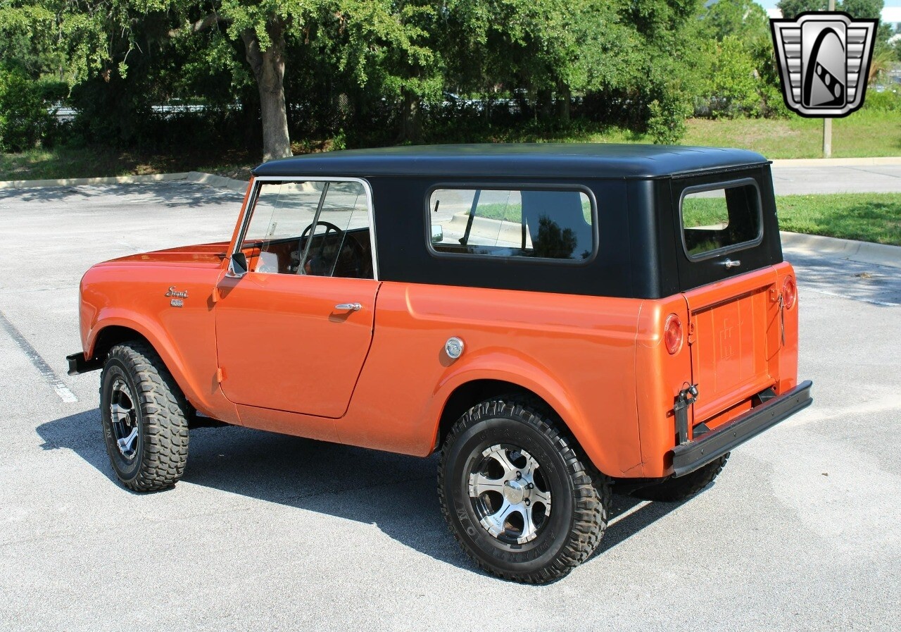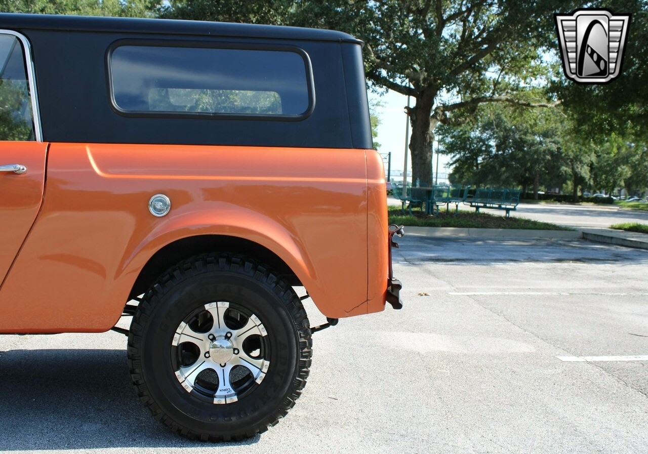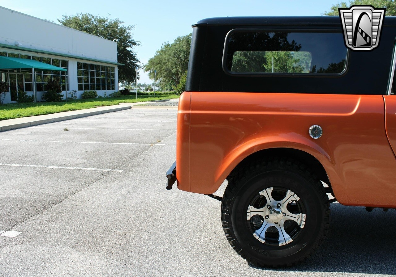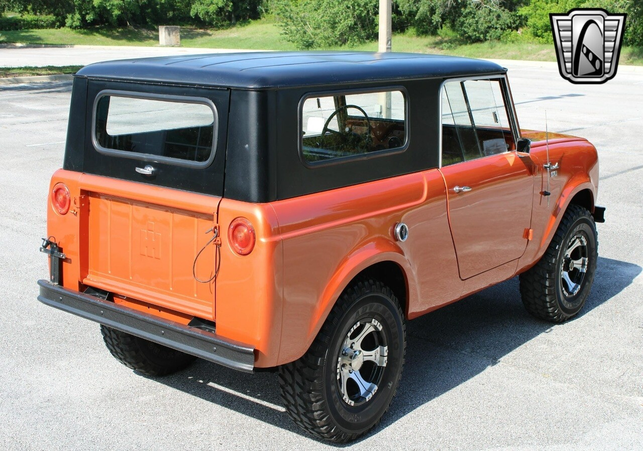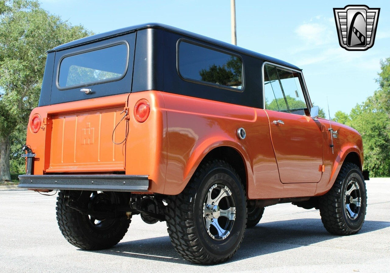 Introducing the 1963 International Harvester Scout, a classic embodiment of rugged utility and timeless design. This particular model stands out with its striking orange exterior, a color that not only commands attention but also pays homage to the vibrant spirit of the 1960s. The Scout's bold exterior is complemented by a sleek black interior, creating a visually appealing contrast that enhances its vintage charm.