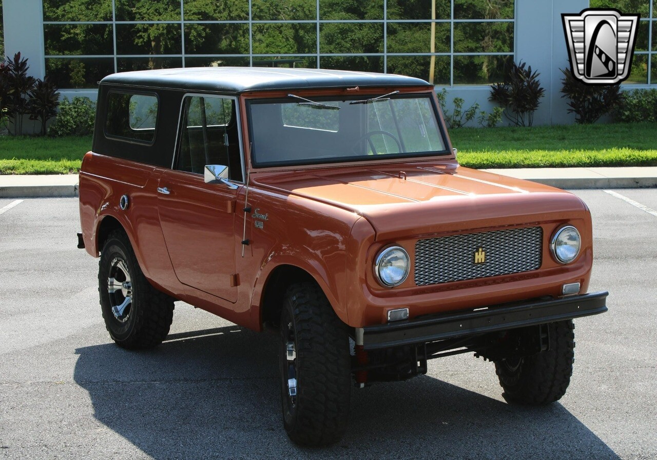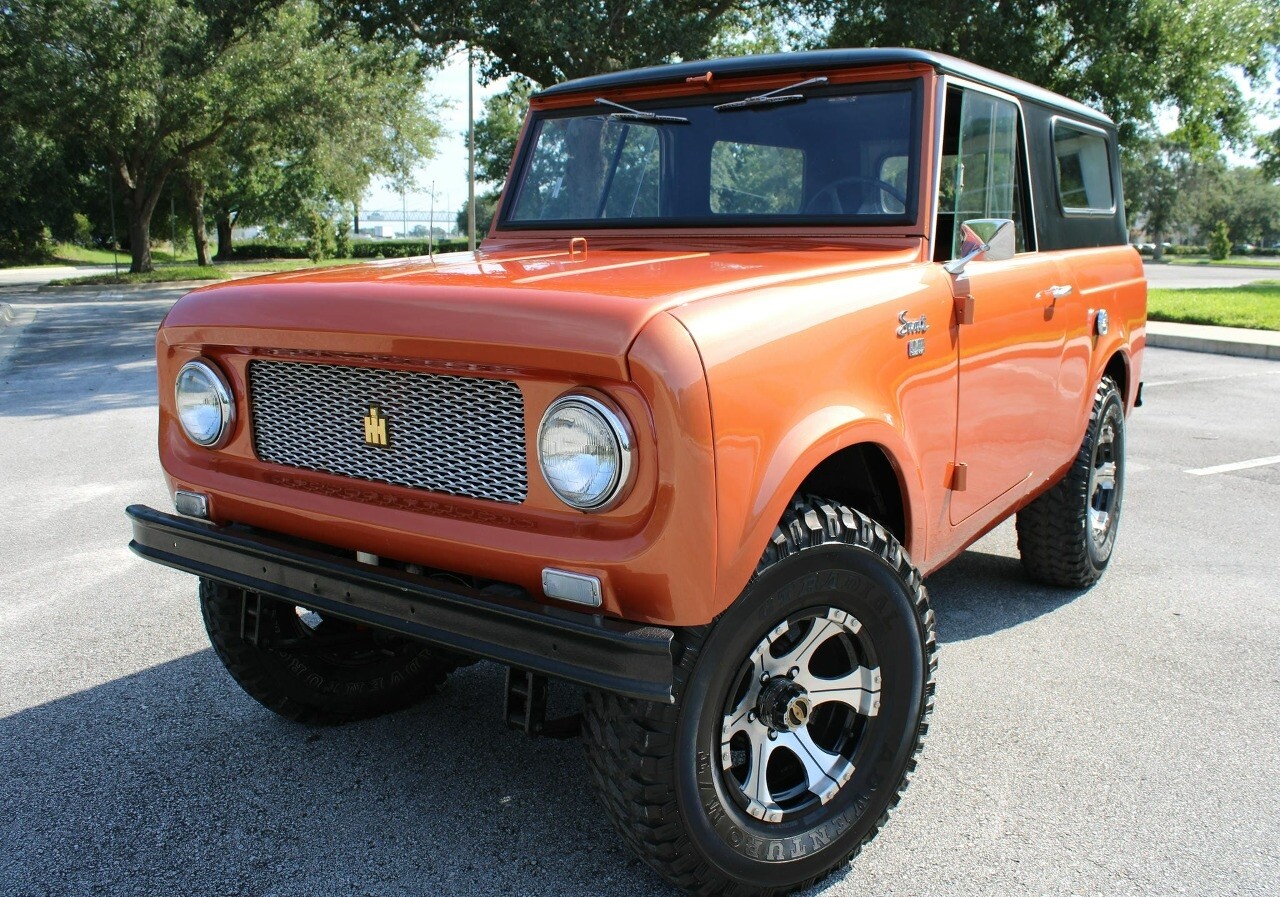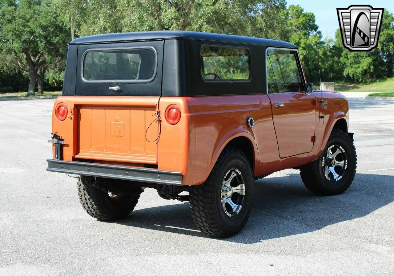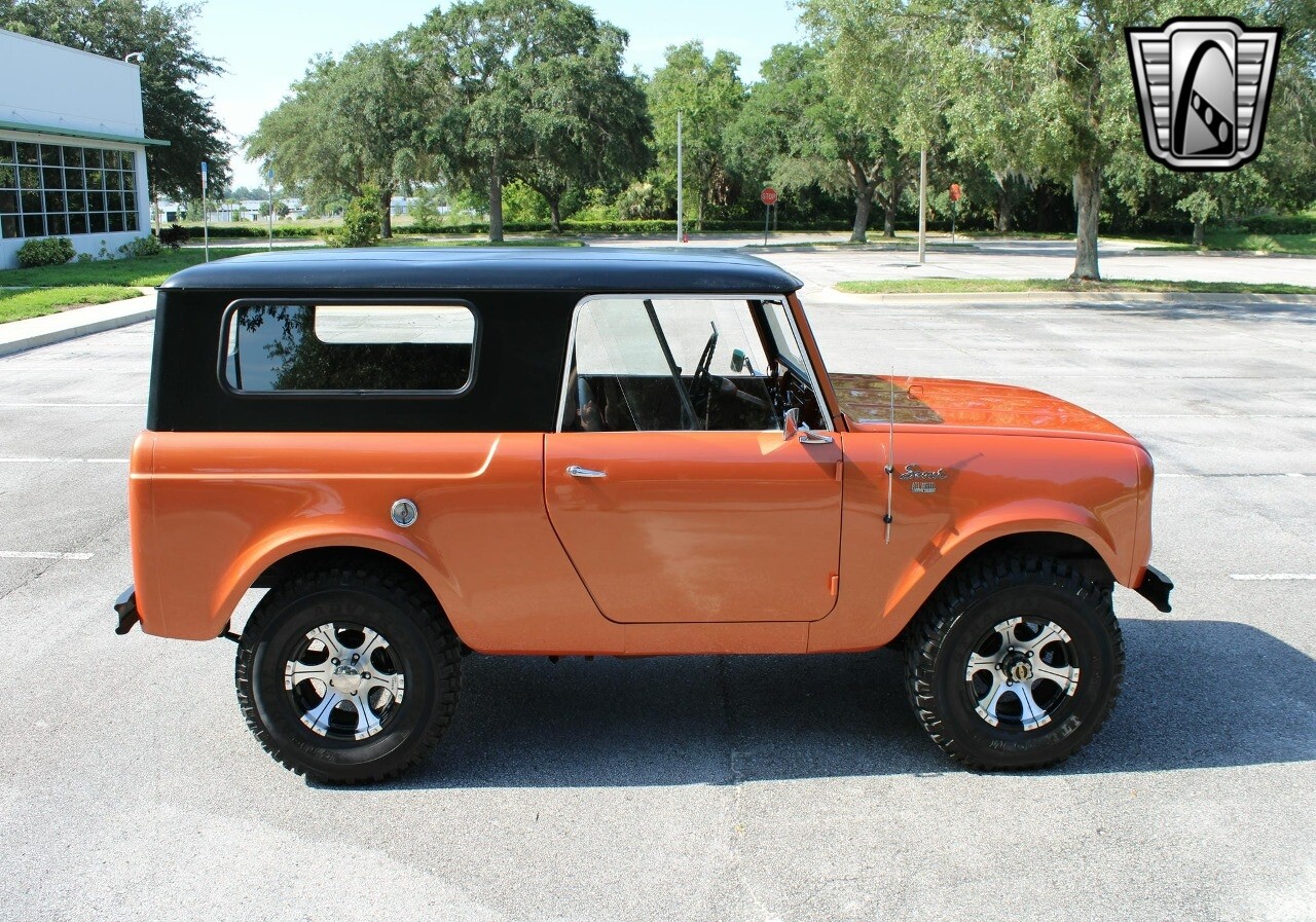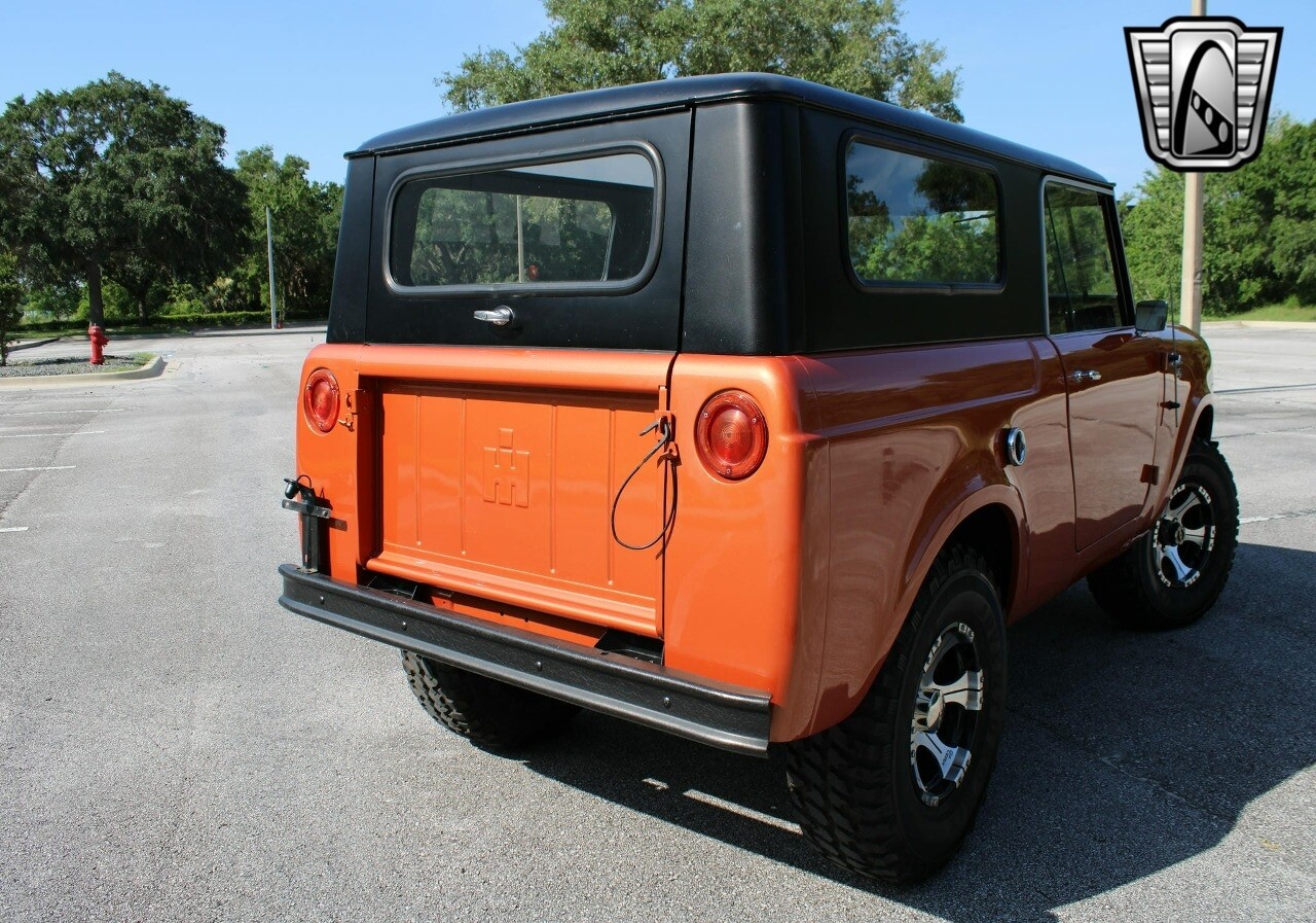 Introducing the 1963 International Harvester Scout, a classic embodiment of rugged utility and timeless design. This particular model stands out with its striking orange exterior, a color that not only commands attention but also pays homage to the vibrant spirit of the 1960s. The Scout's bold exterior is complemented by a sleek black interior, creating a visually appealing contrast that enhances its vintage charm.