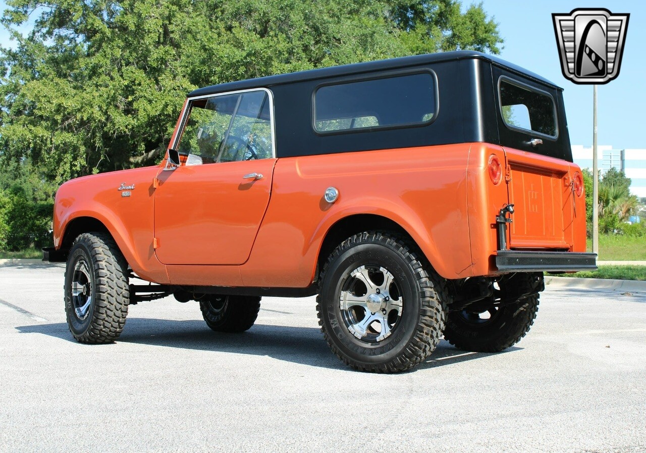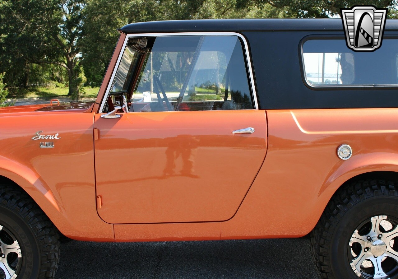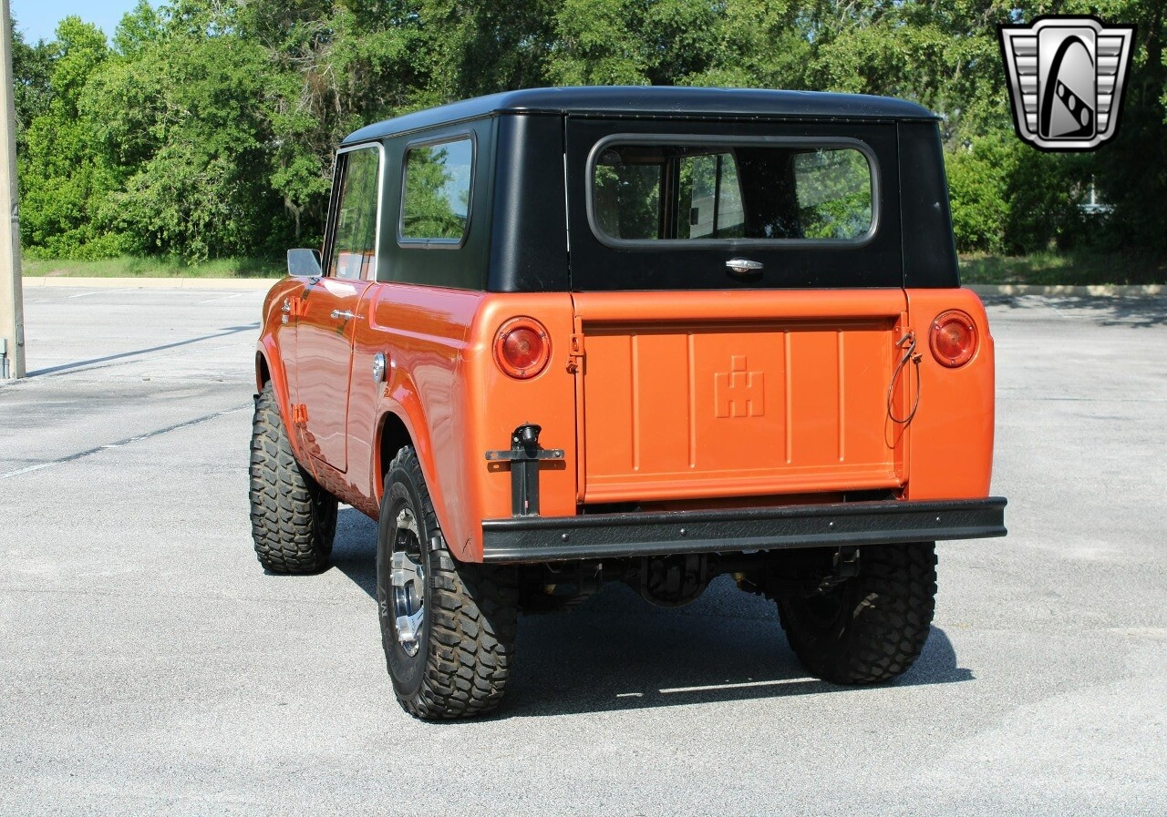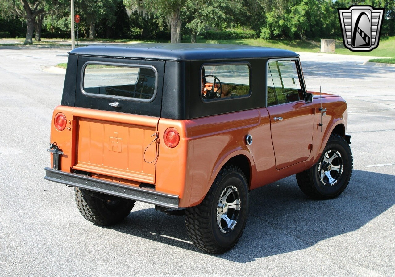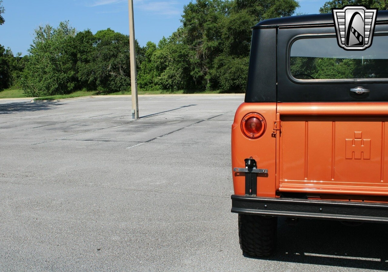 Introducing the 1963 International Harvester Scout, a classic embodiment of rugged utility and timeless design. This particular model stands out with its striking orange exterior, a color that not only commands attention but also pays homage to the vibrant spirit of the 1960s. The Scout's bold exterior is complemented by a sleek black interior, creating a visually appealing contrast that enhances its vintage charm.