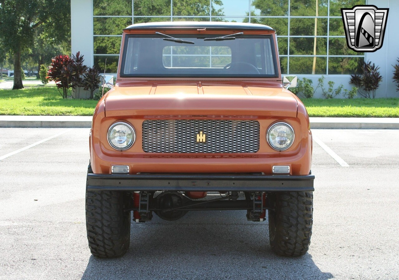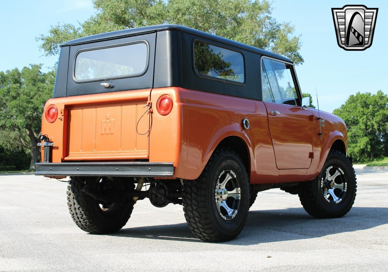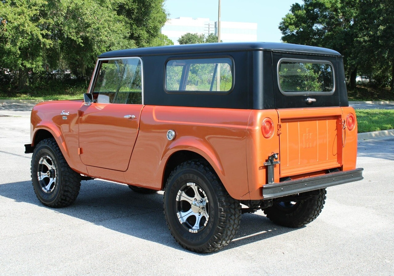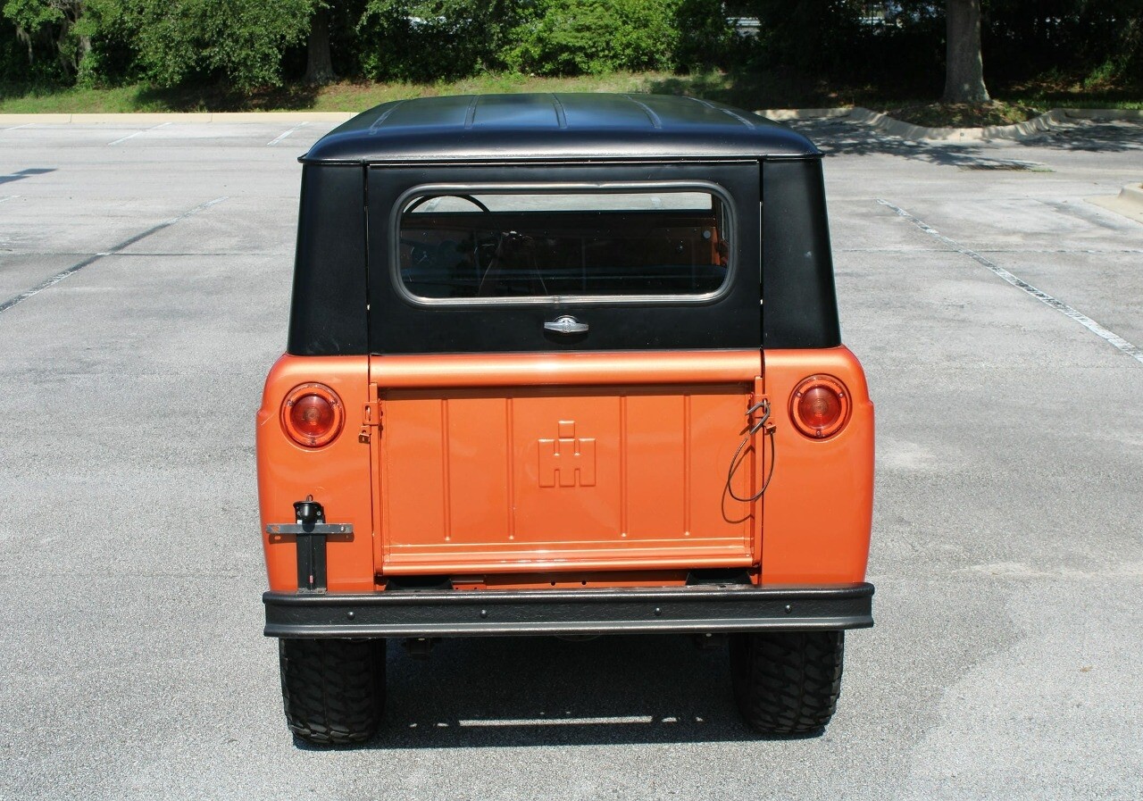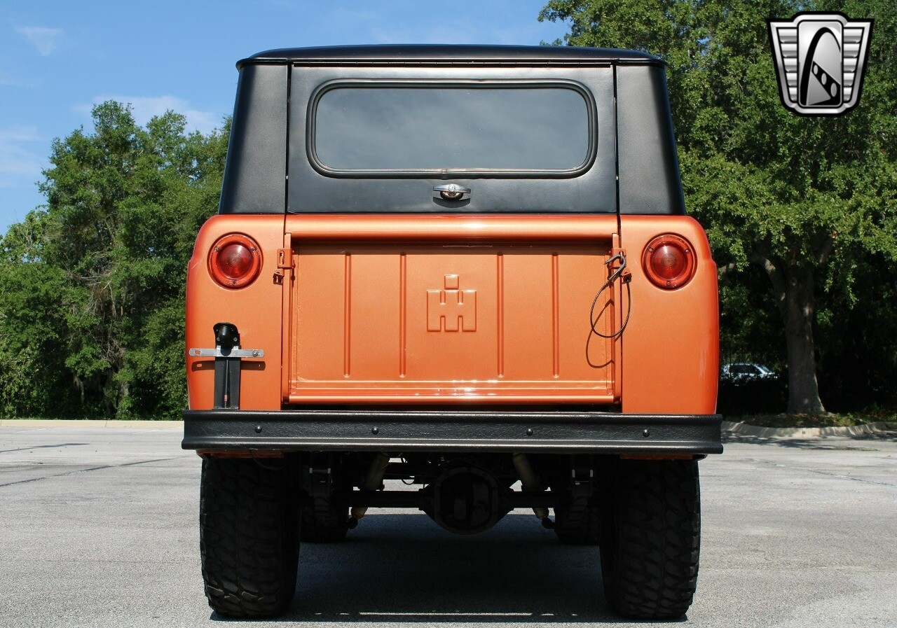 Introducing the 1963 International Harvester Scout, a classic embodiment of rugged utility and timeless design. This particular model stands out with its striking orange exterior, a color that not only commands attention but also pays homage to the vibrant spirit of the 1960s. The Scout's bold exterior is complemented by a sleek black interior, creating a visually appealing contrast that enhances its vintage charm.